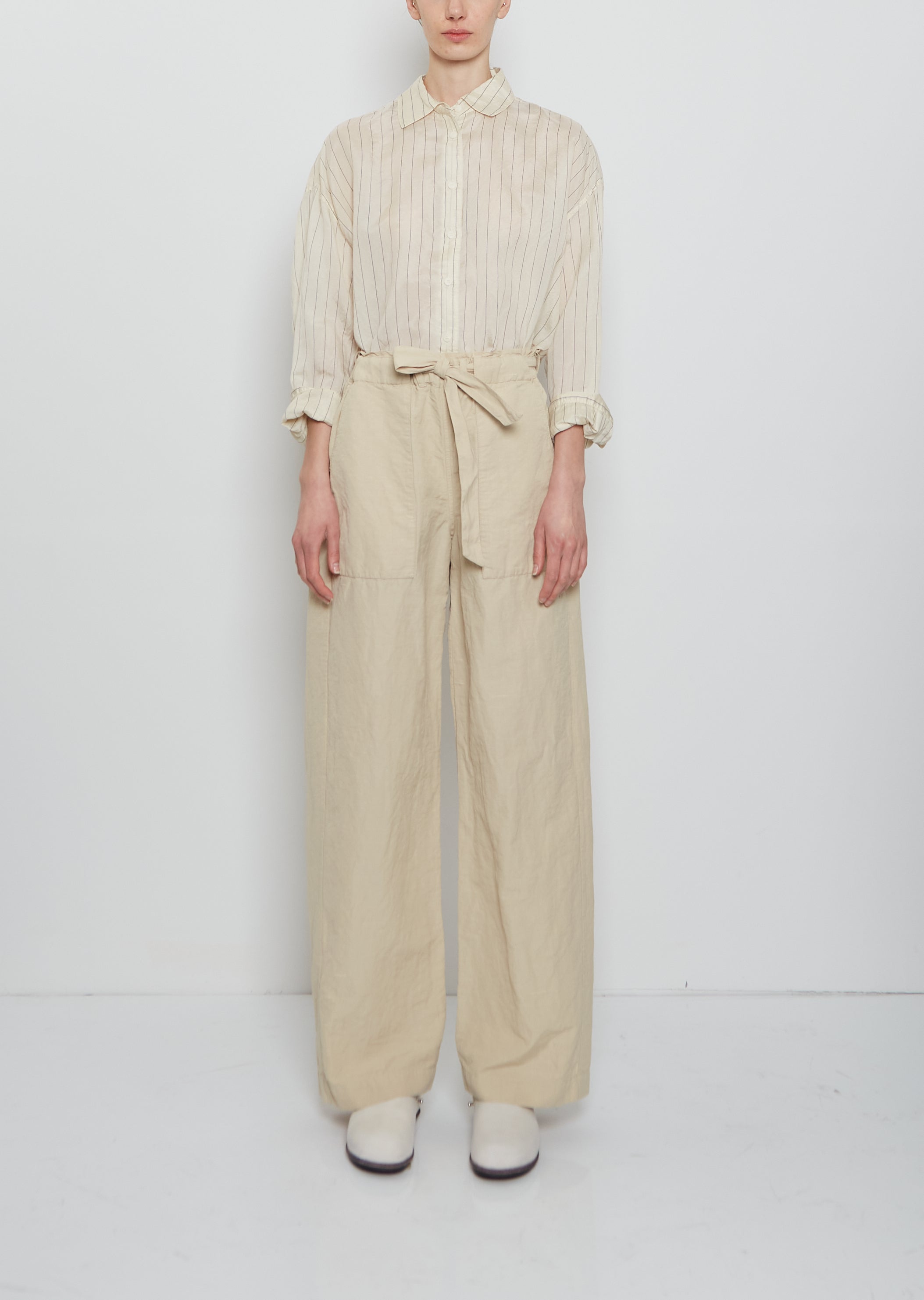 Casey Casey ivory pull-on pant with wide, straight legs and an incorporated self belt in a lightweight, breathable and washed cotton, linen and silk blend with a textured hand-feel. Features an elasticated waistband and deep angled patch pockets. Relaxed fit.
