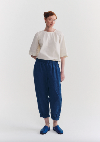 Casey Casey blue signature pull-on trouser with tapered legs in lightweight and breathable linen and lyocell blend twill with a washed effect and garment-dyed finish. Features an elasticated waist with interior adjustable drawstring, angled side pockets and a single patch pocket at back. Easy, pull-on fit.