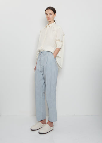 Casey Casey blue stripes signature cropped trousers with tapered legs and front pleats in crisp and lightweight washed cotton. Features belt loops, angled side pockets, single patch pocket at back and button fly fastening. Finished with tonal corozo buttons . Relaxed fit.