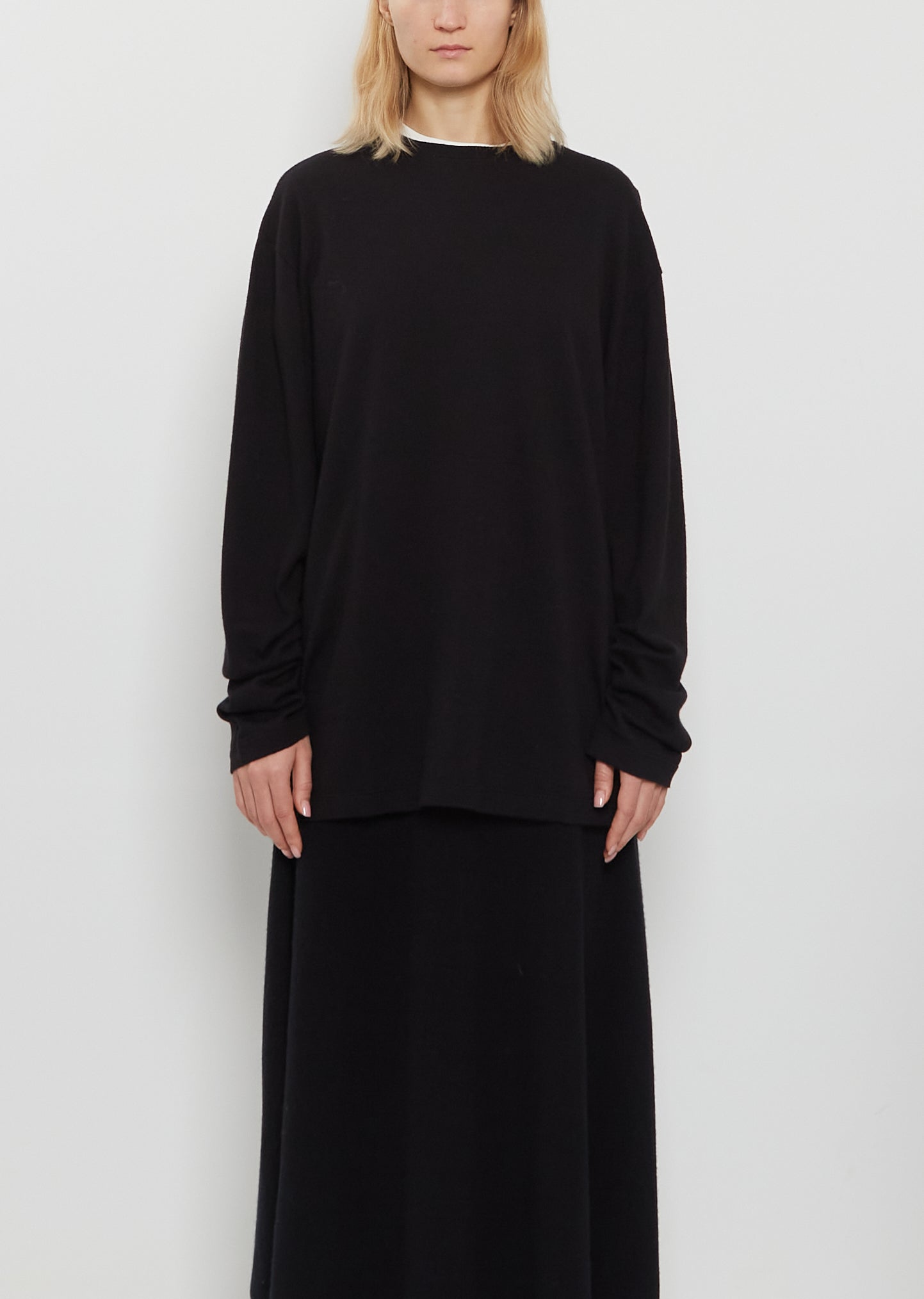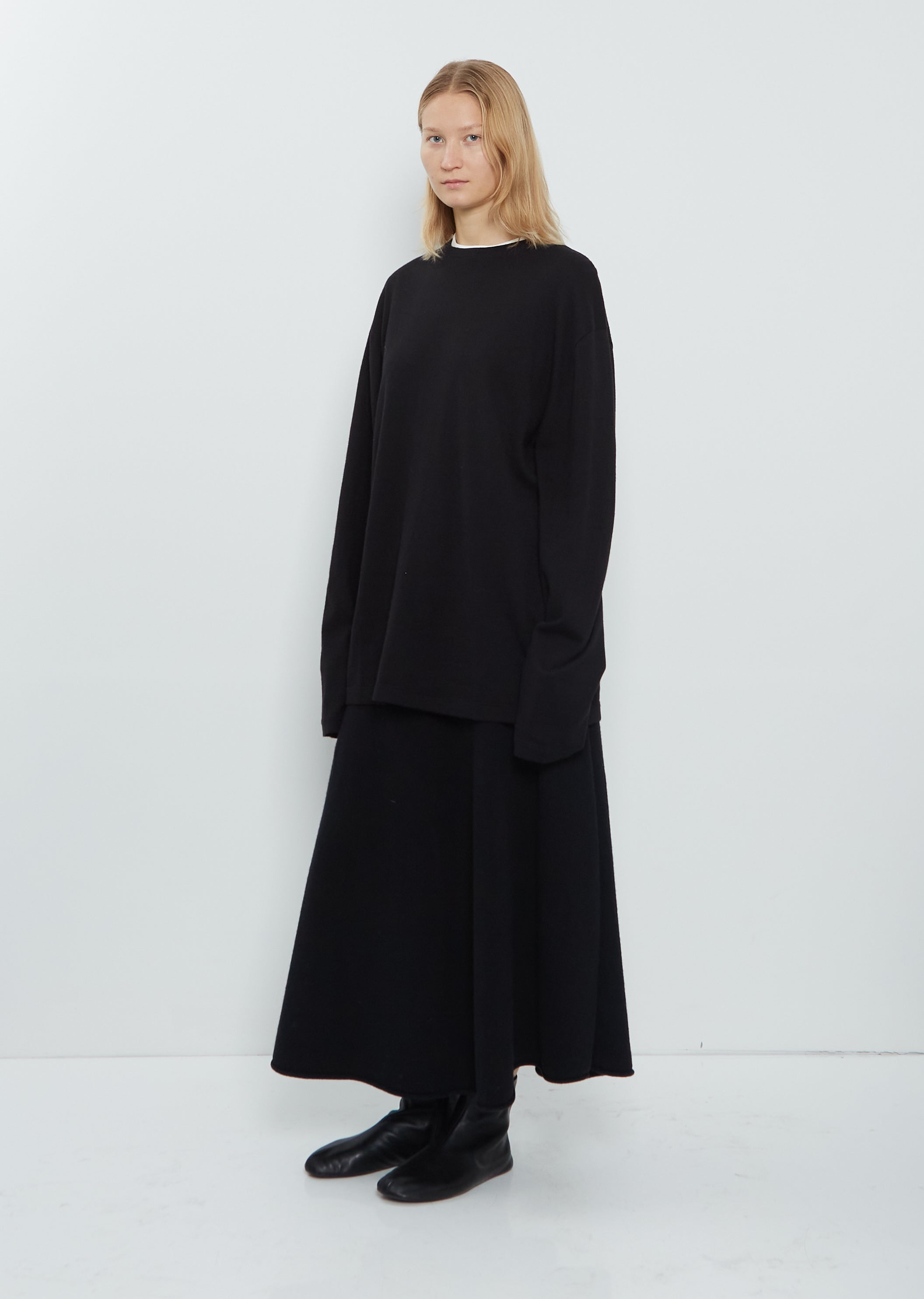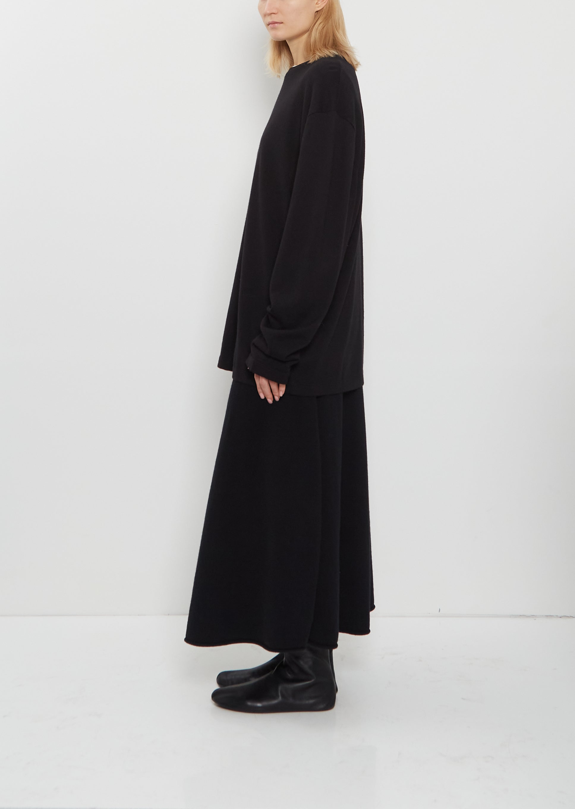 Extreme Cashmere raven black long sleeve sweater with a crew neck and dropped shoulders in lightweight and crisp cotton and cashmere blend. Boxy, relaxed fit.