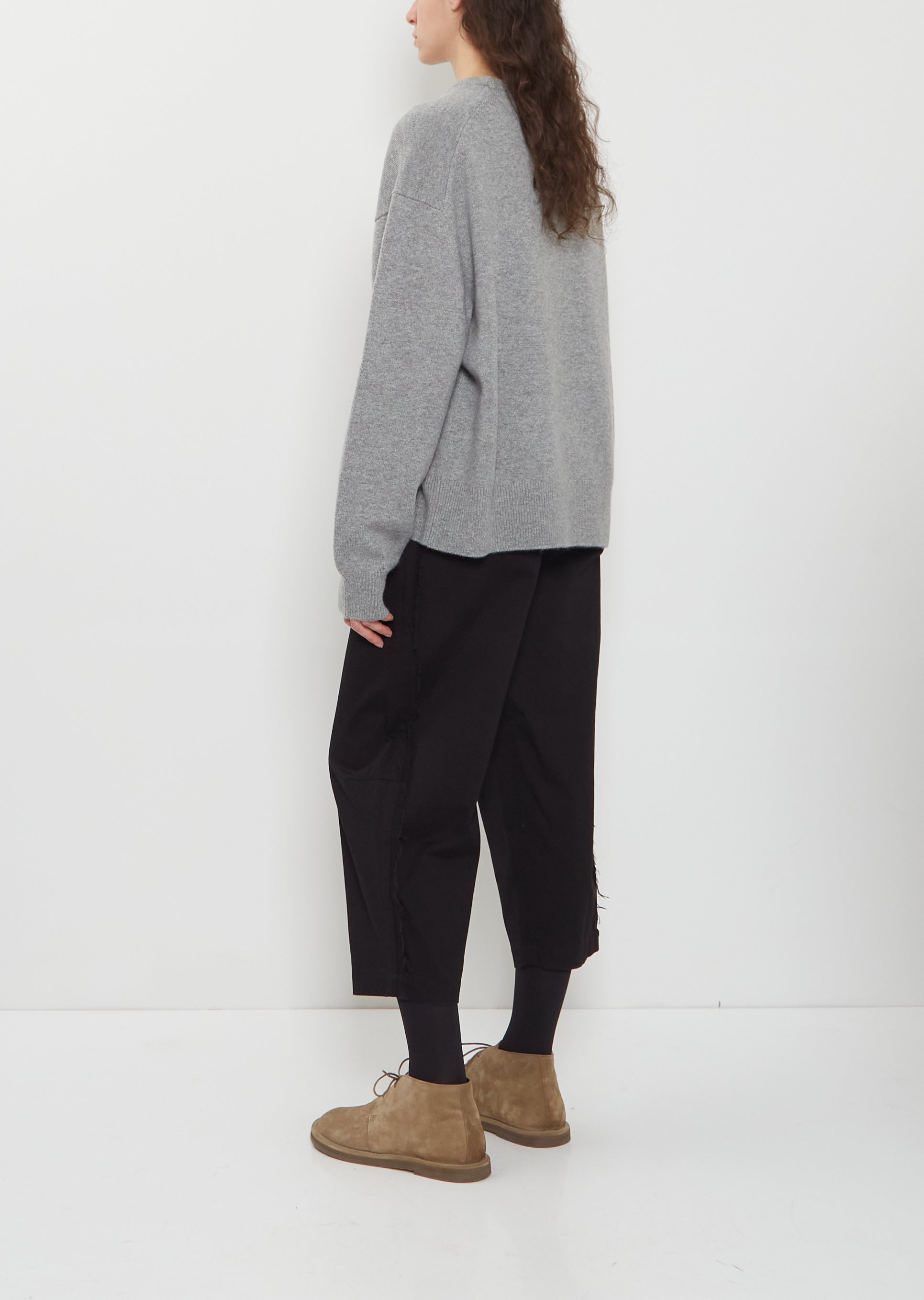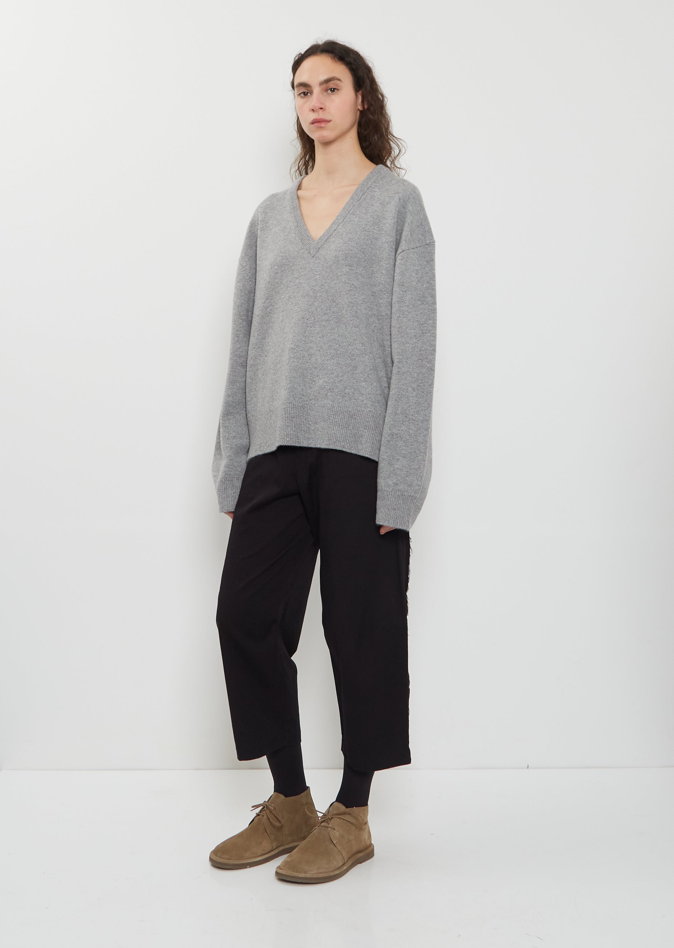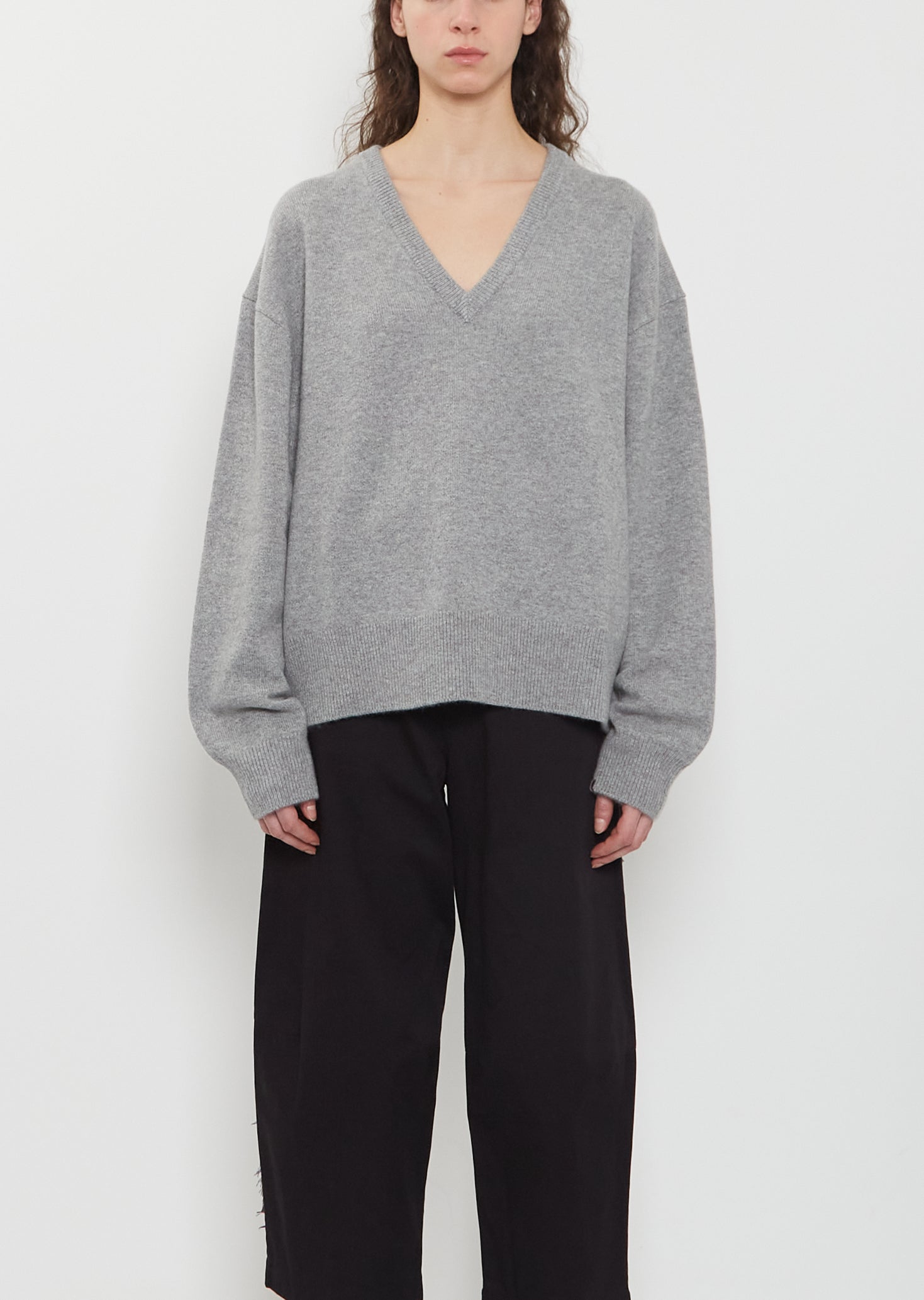 Extreme Cashmere grey sweater with a V-neckline and blouson fit in soft stretch mid-weight cashmere blend knit. Features dropped shoulders and ribbed trim finishings at neckline, cuffs and hem. Relaxed fit.