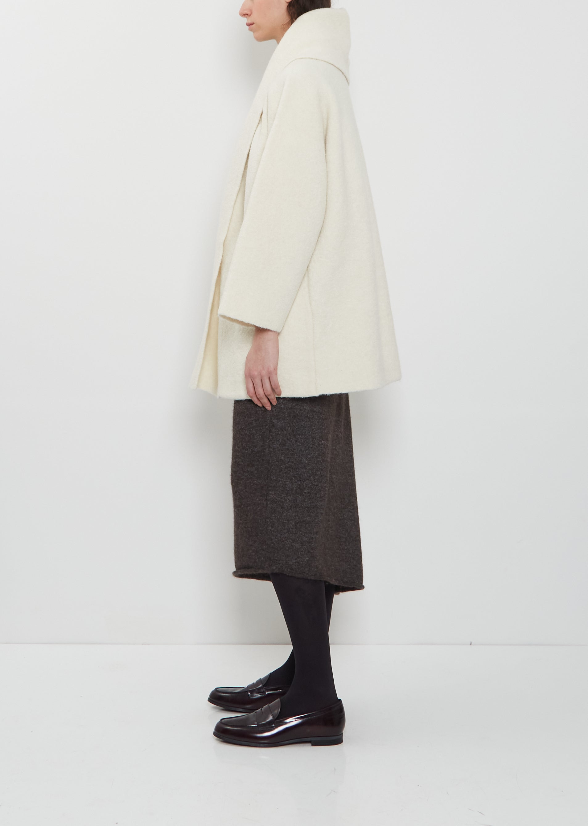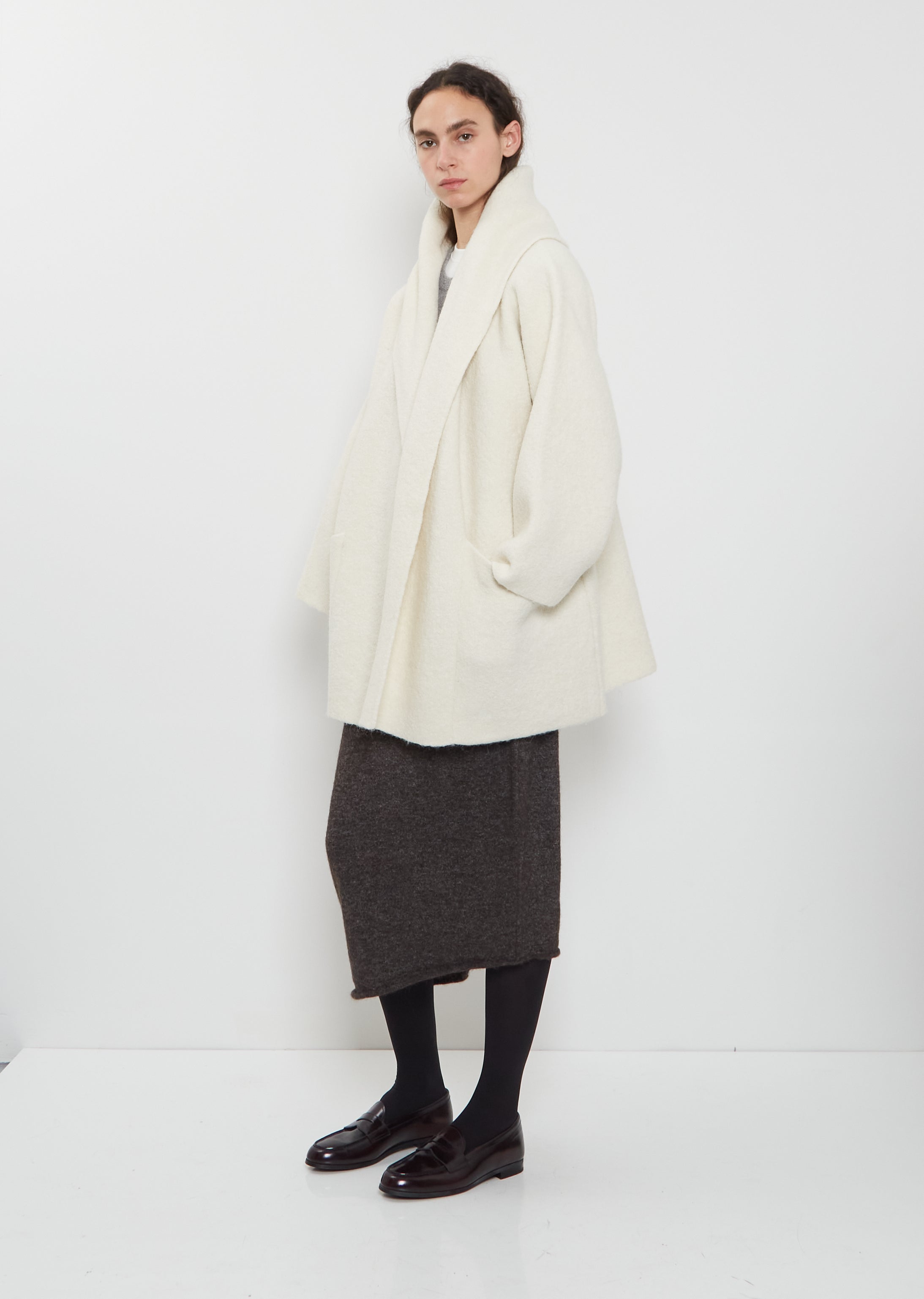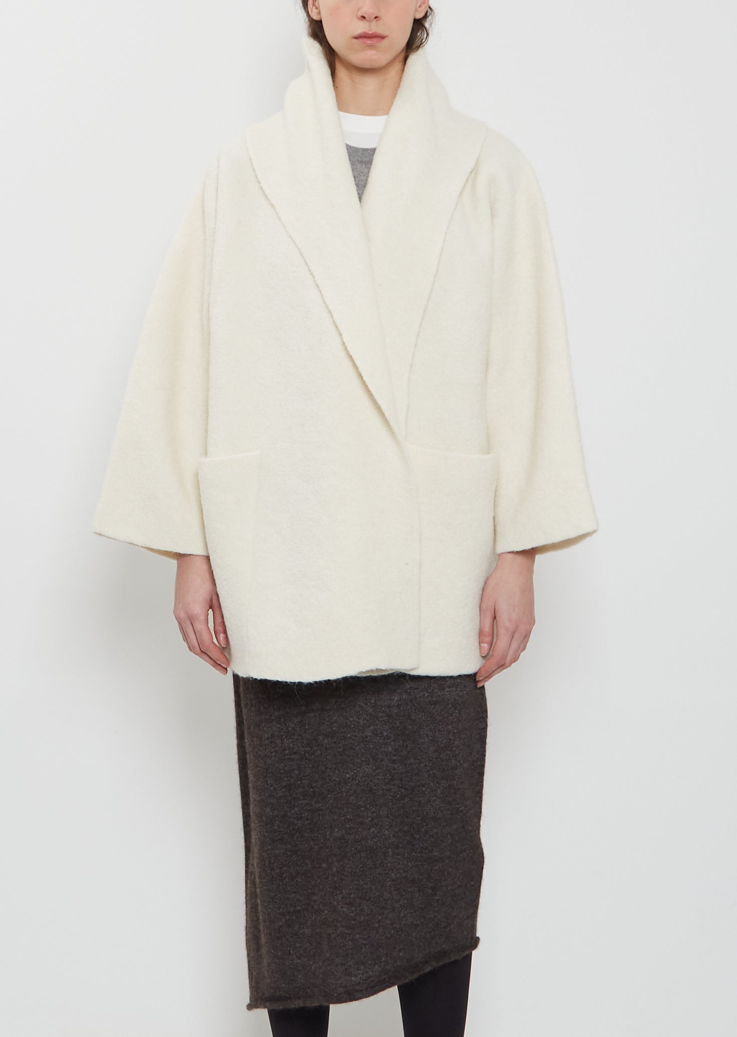 Lauren Manoogian raw white oversized short coat with a wrap open front and wide draped collar in double faced alpaca and extra fine merino wool blend knit. Features deep patch pockets, straight hem and clean finished edges. This coat is unlined.