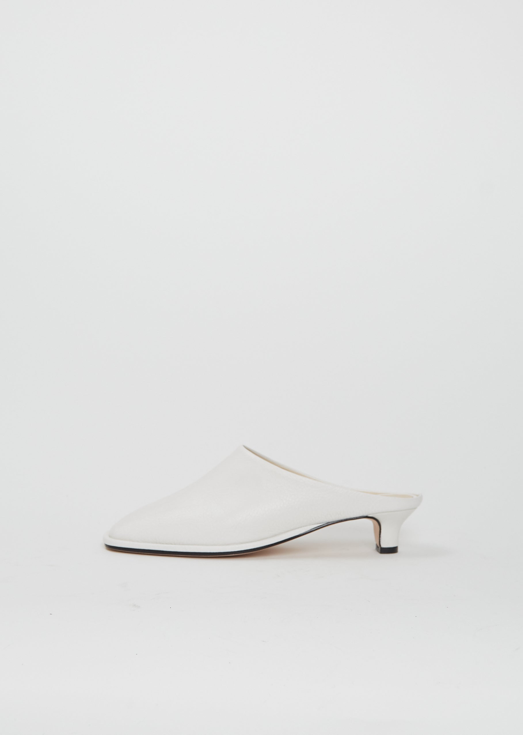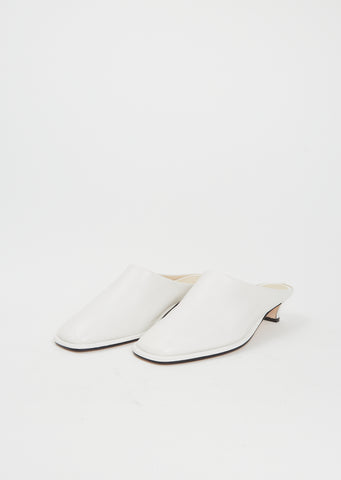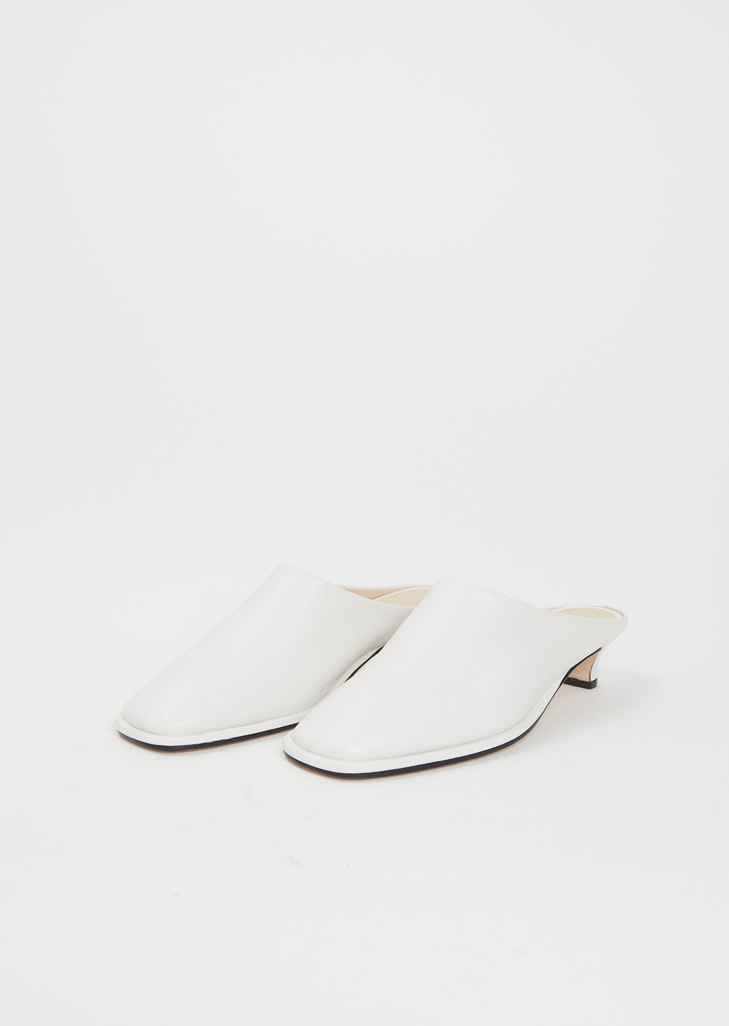 Lauren Manoogian white heeled mule with signature square toe and wooden kitten heel handmade in soft vegetable-tanned leather. Features a soft leather footbed, and a tonal covered platform and heel.