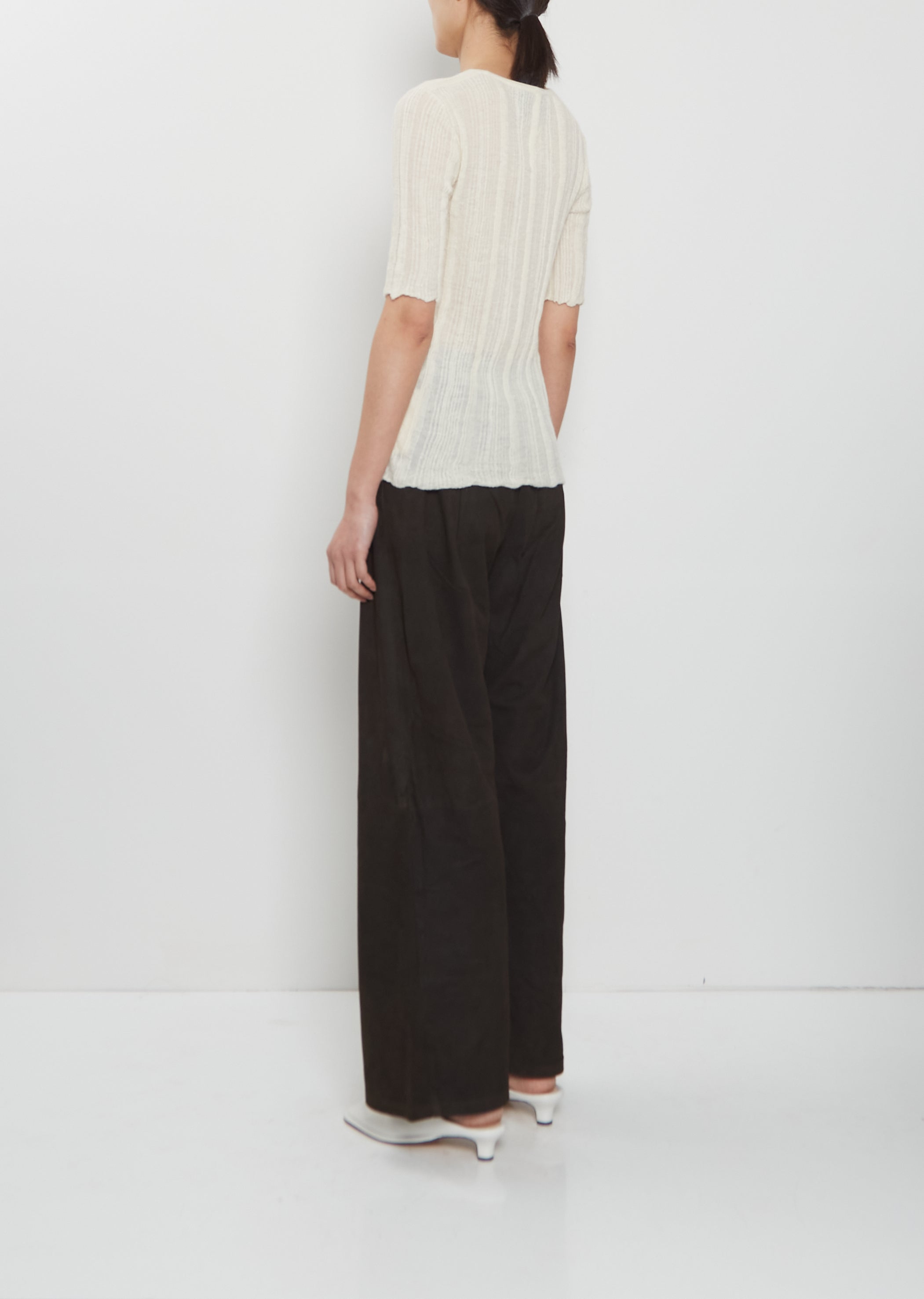 Lauren Manoogian raw white tee with a round neckline and half sleeves in lightweight, soft and fine alpaca, silk and wool knit with a pleated effect. Features set-in shoulders, and rolled edge finishings at sleeves and bottom hem.