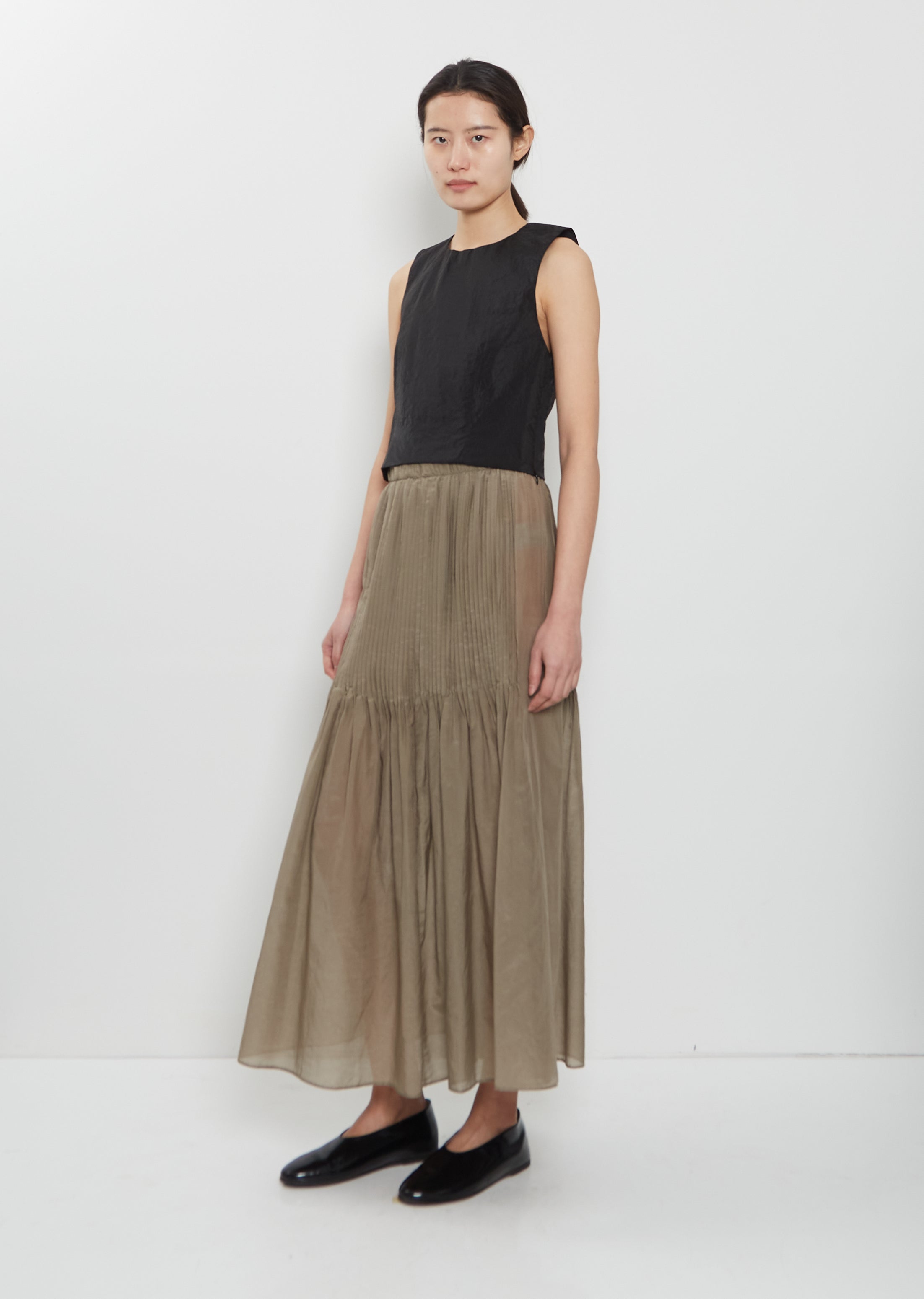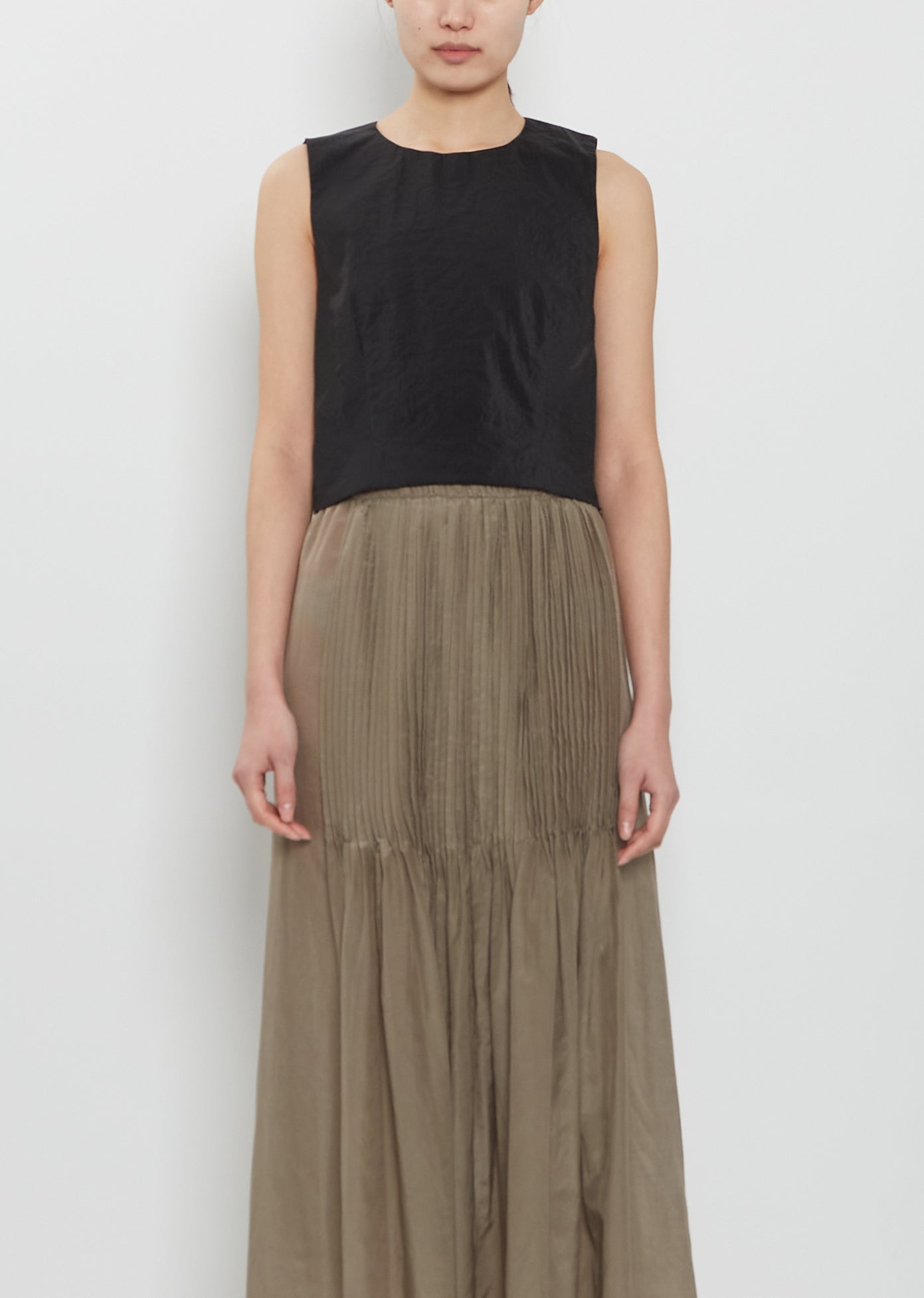 Lauren Manoogian black cropped top with a round neckline and concealed side zipper closure in textured nylon. Fully lined in self.