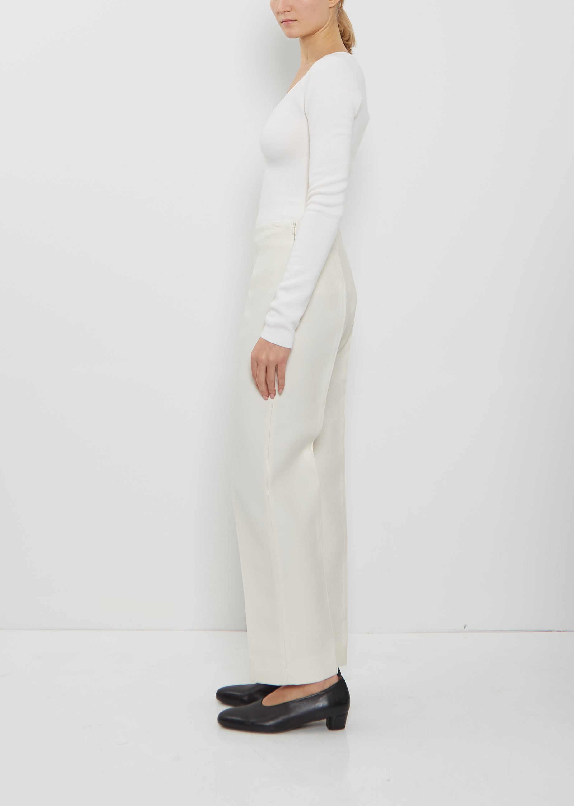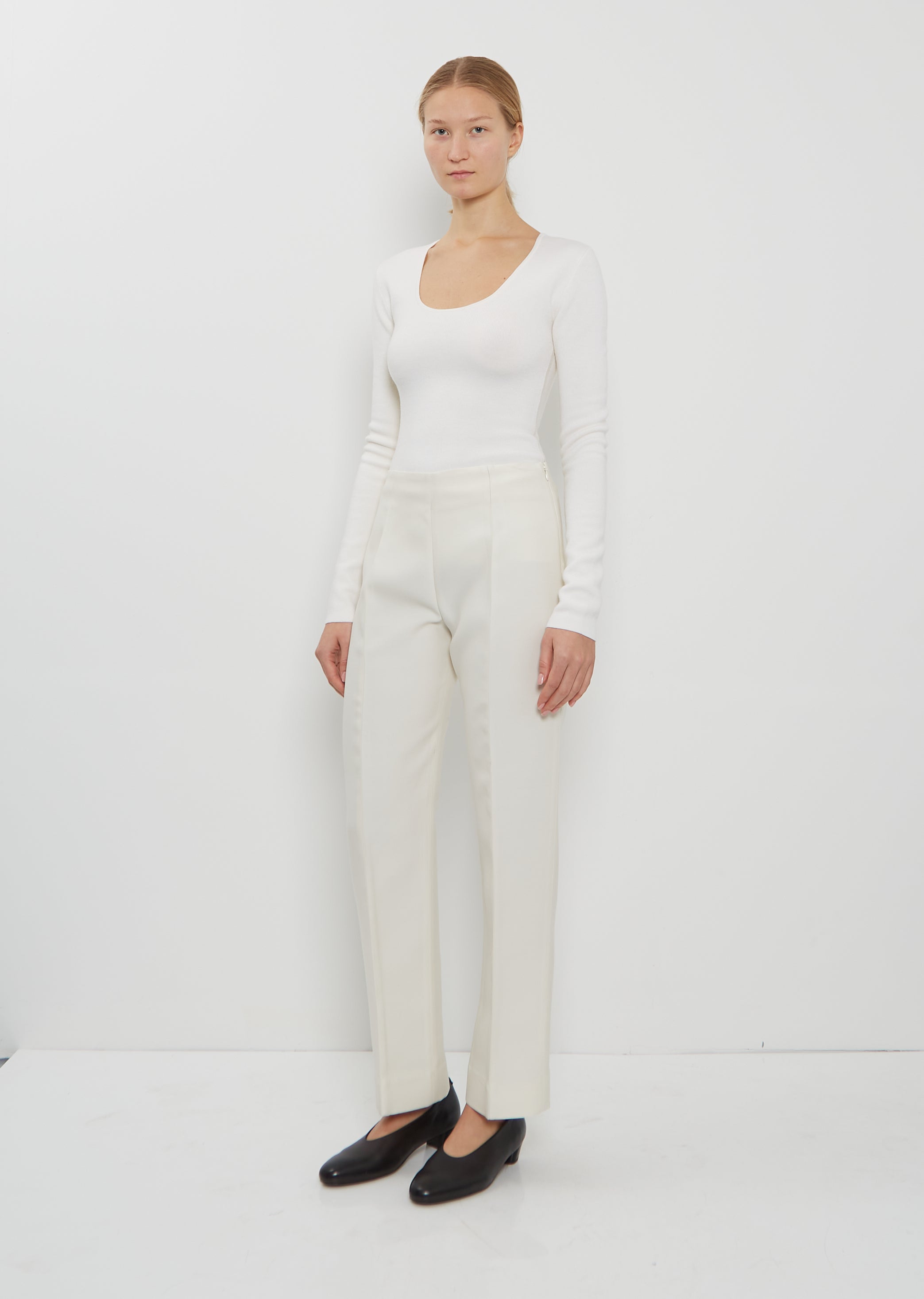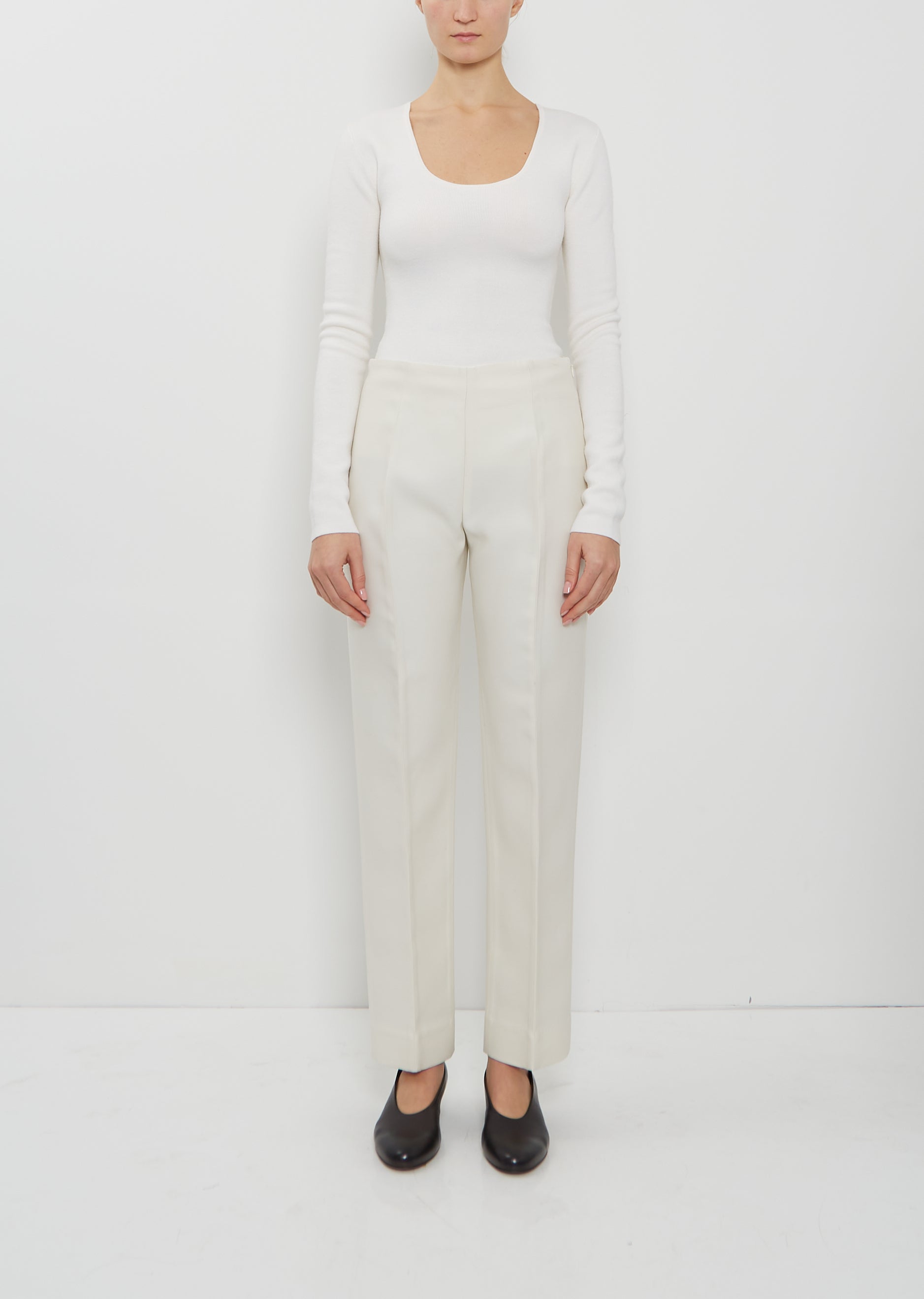 Toteme ecru pant with straight, slightly tapered legs in a wool and silk blend. Features darts at waist, press-creased legs and a concealed side zipper closure. Regular fit.