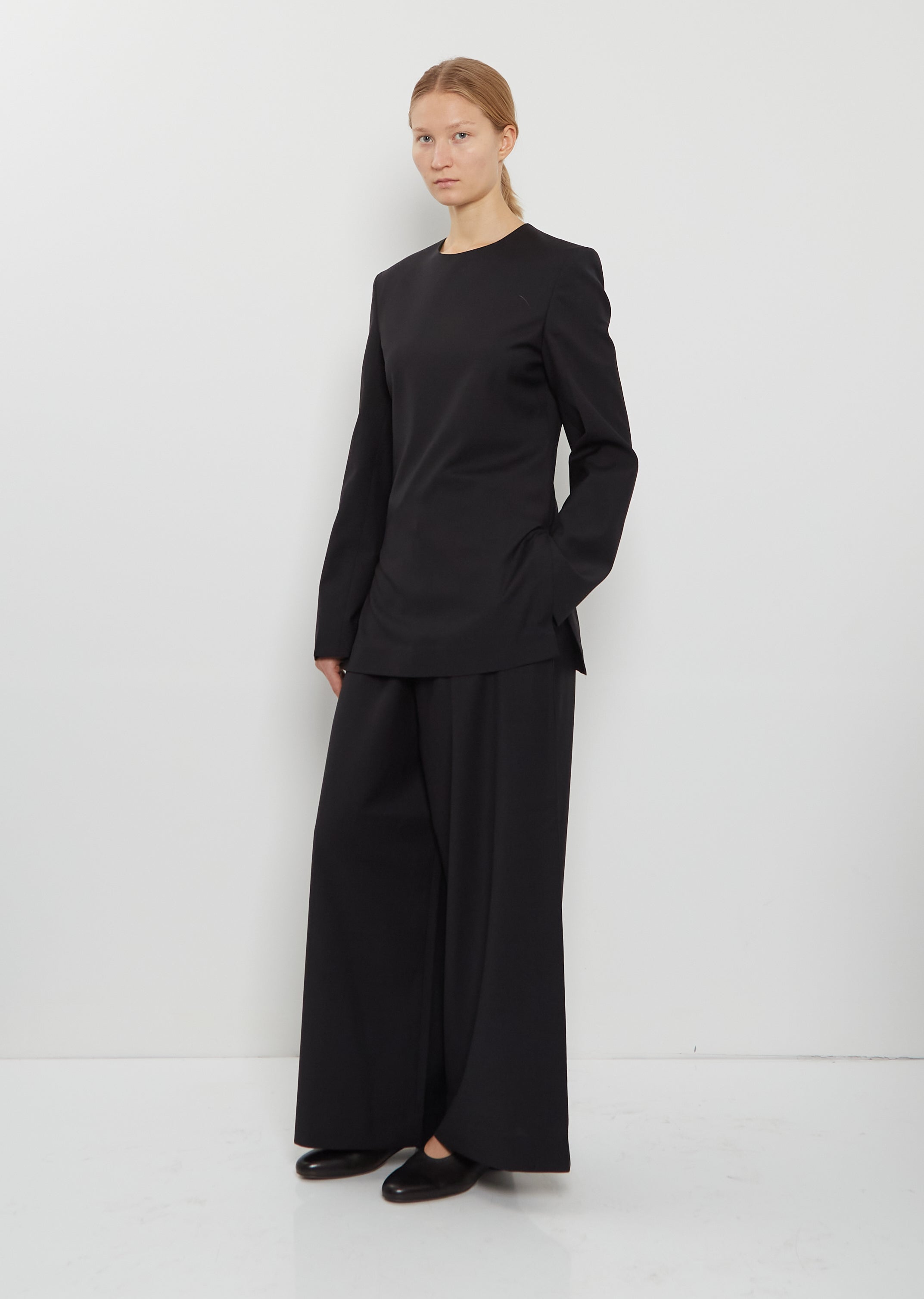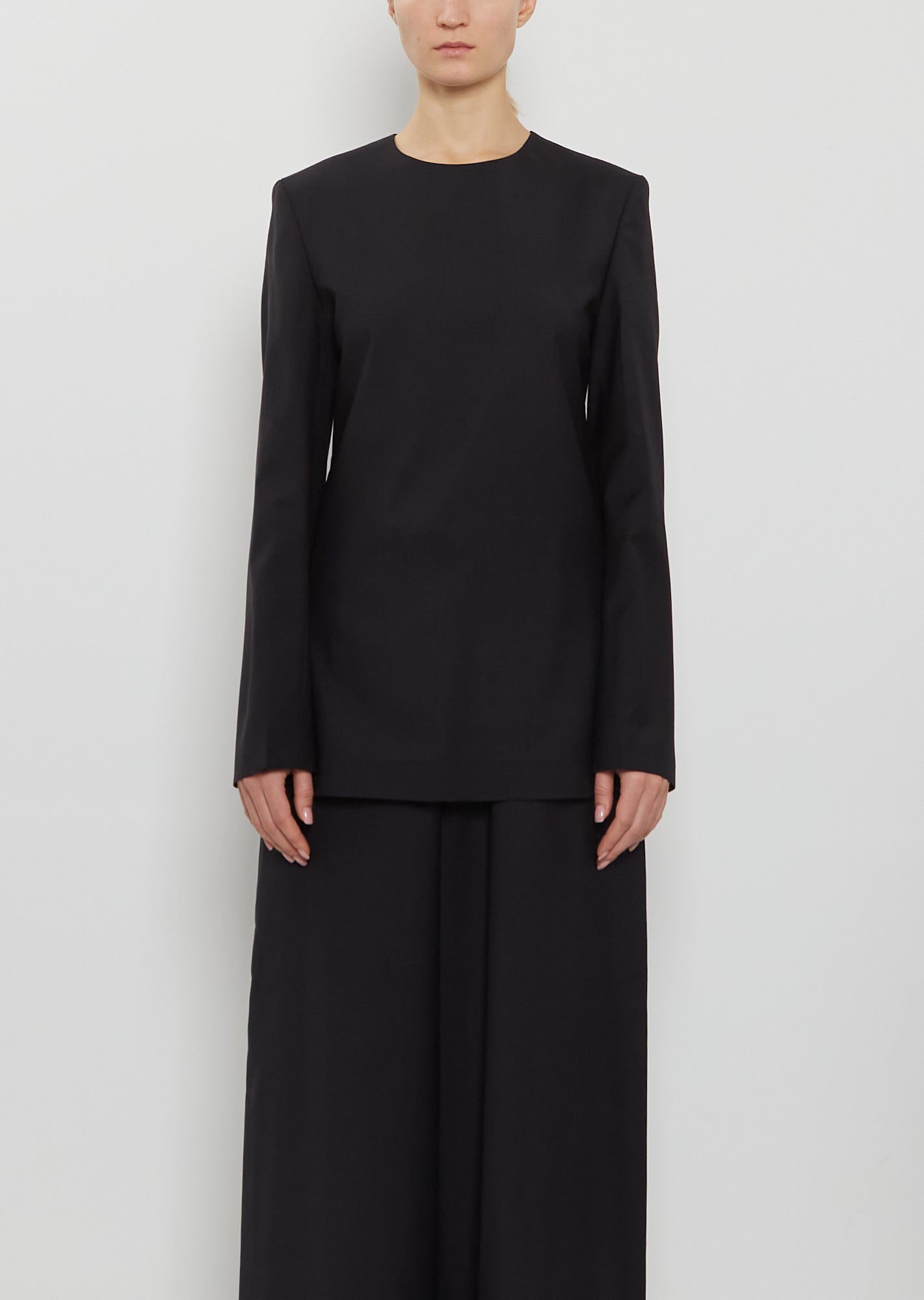 Toteme black tailored long sleeve blouse with slightly padded shoulders and slit at sides in lightweight and fluid wool. Features a round neckline and concealed zipper closure at back. Regular fit. Partially lined in self.