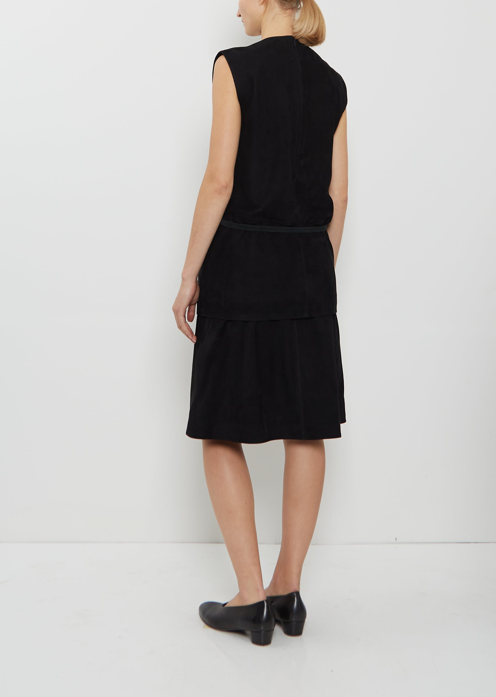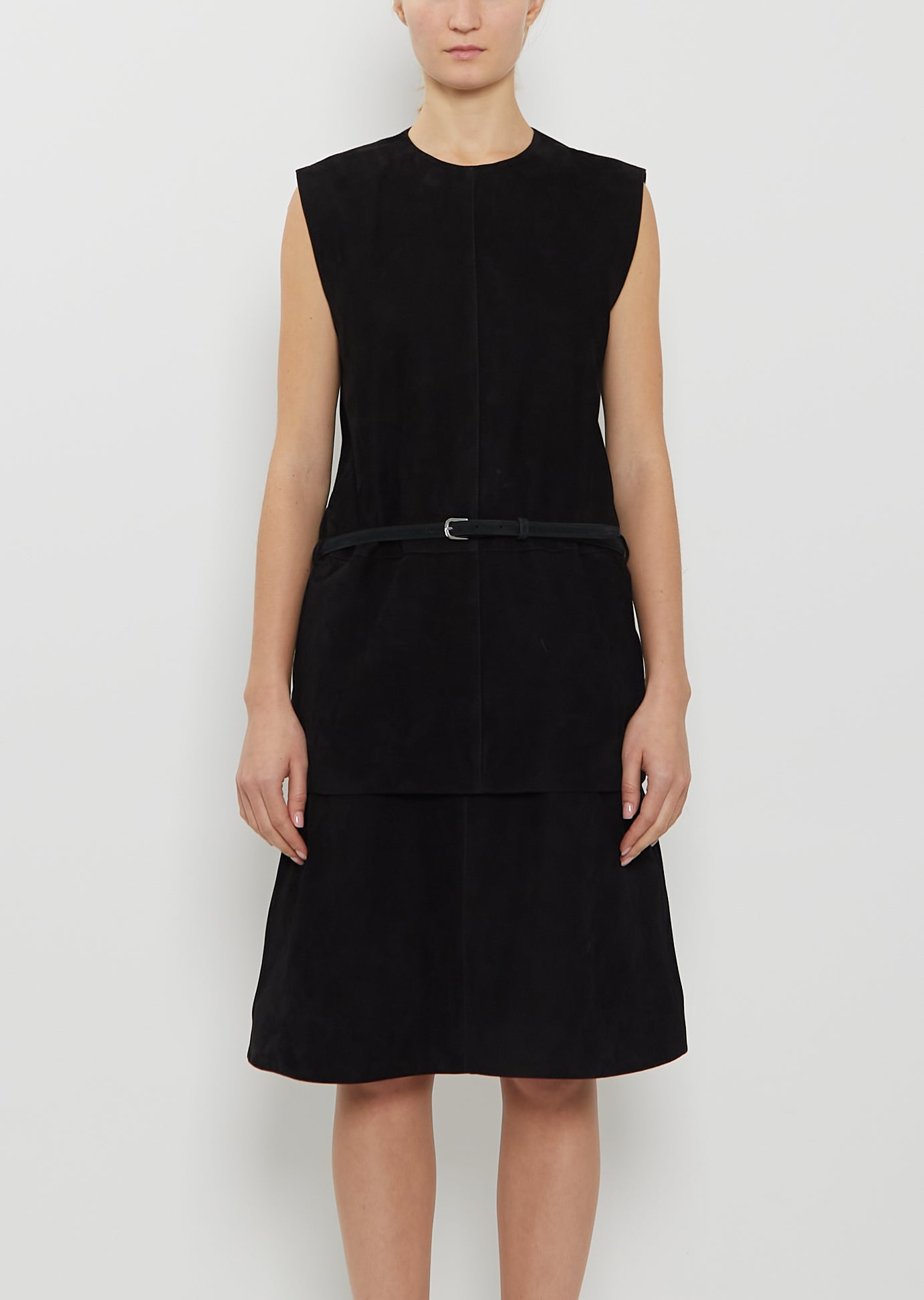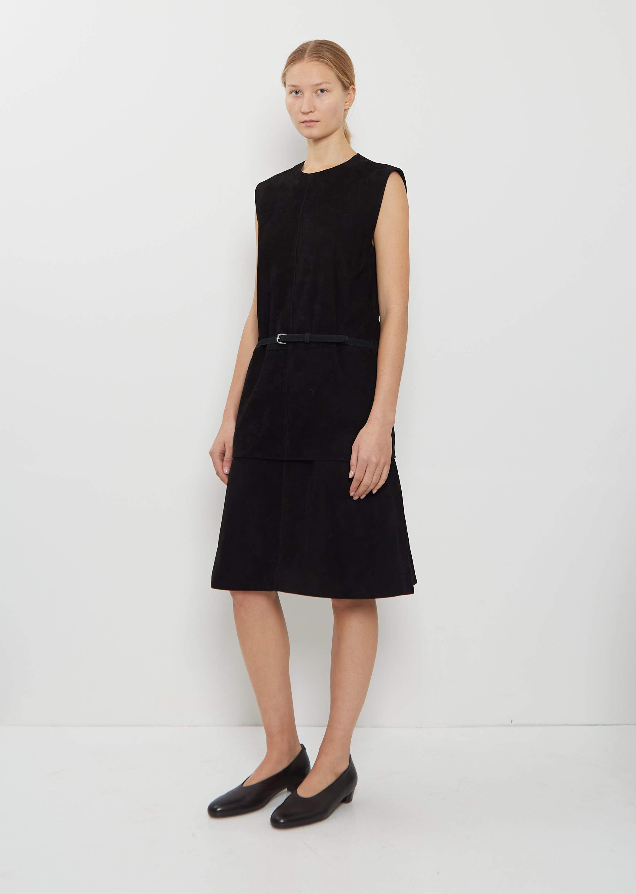 Toteme black elongated sleeveless top with signature detachable belt with silver-tone buckle in soft suede. Features a concealed zipper at back. Lined in tonal satin.