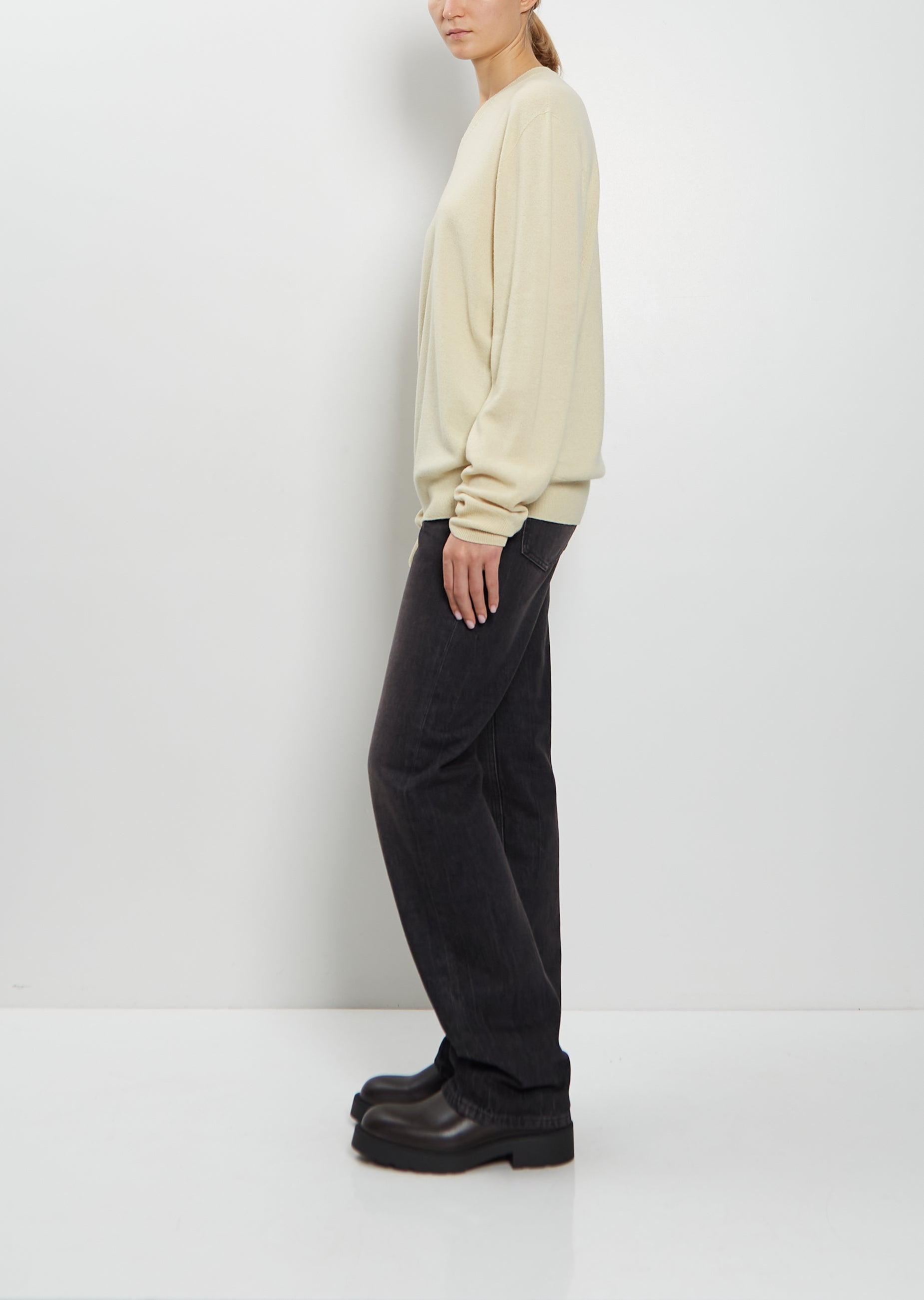 The Row yellow sweater with a V-neckline and dropped shoulders in an ultra soft mid-weight goat cashmere knit. Features a ribbed trim finish at neckline, cuffs, and hem. Relaxed fit.