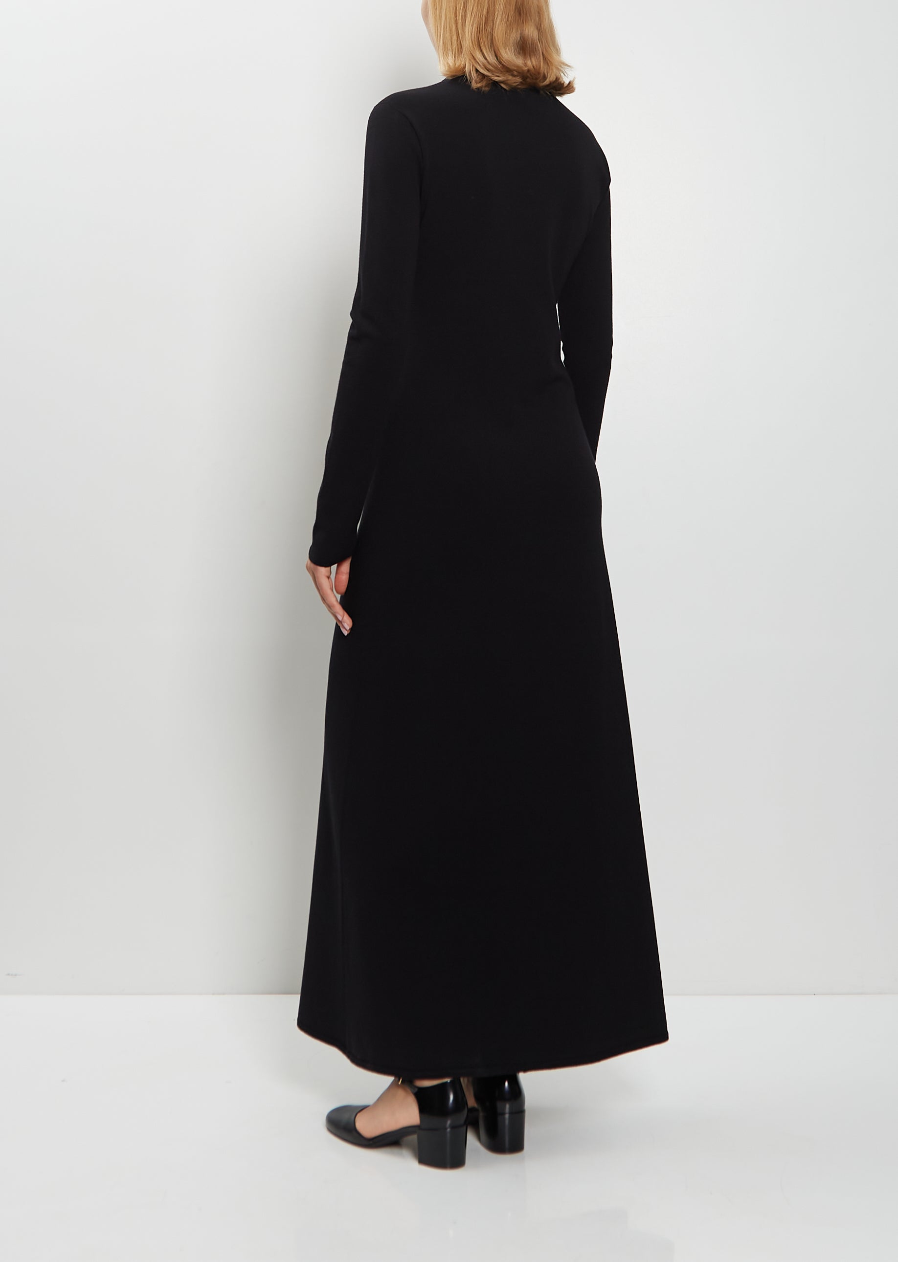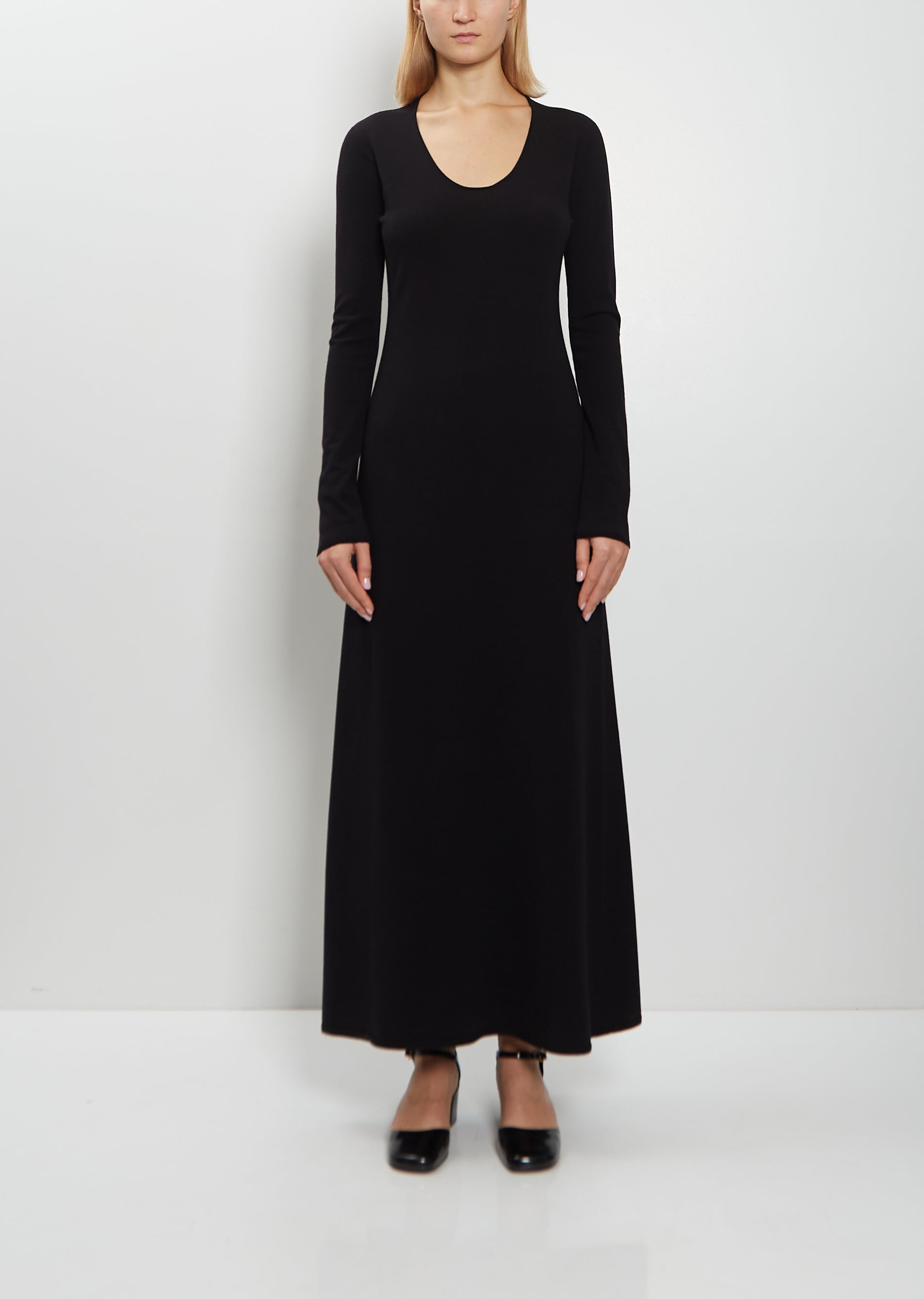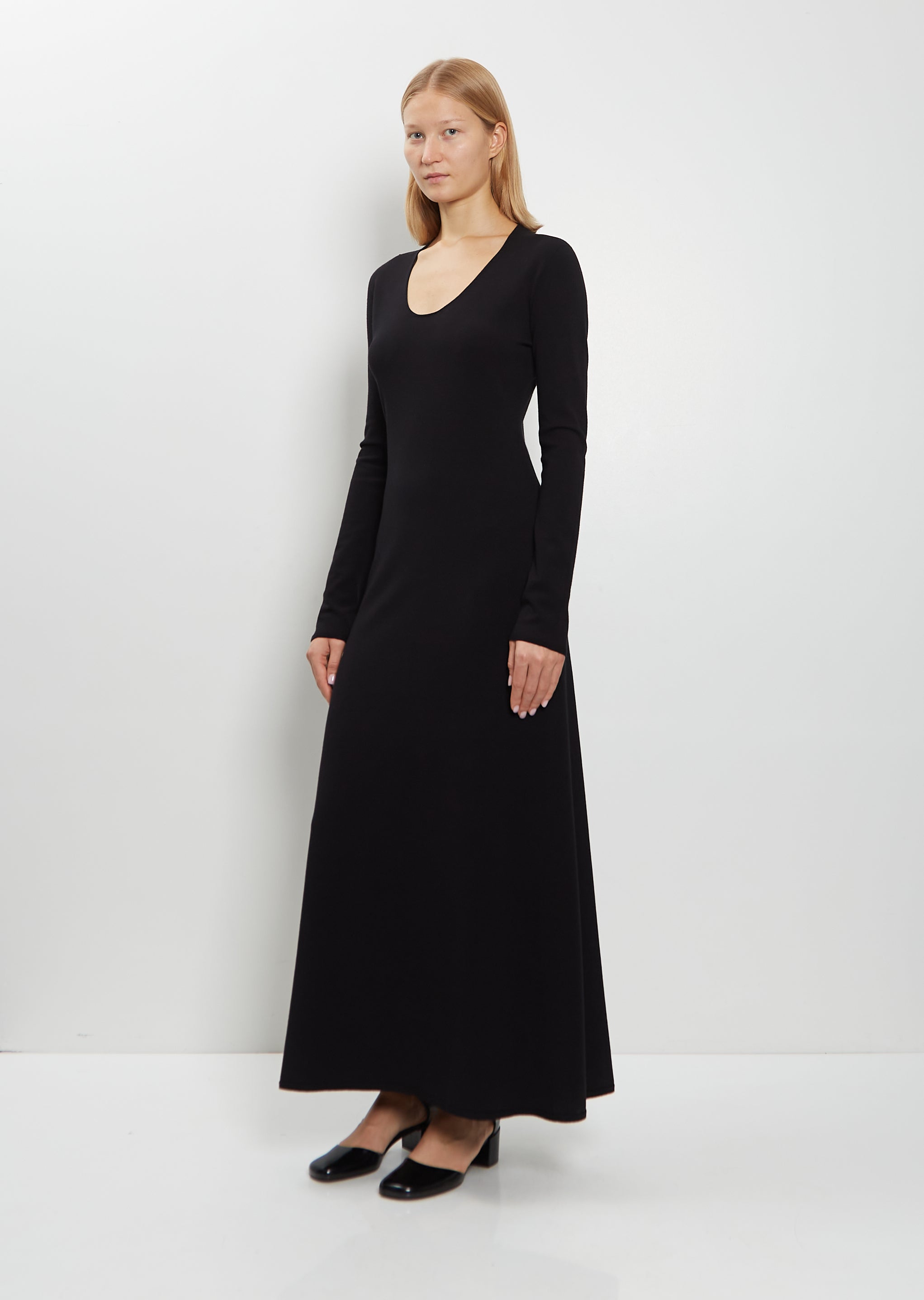 The Row black long sleeve pullover dress with a scoop neckline in a stretch knit jersey. Features skinny ribbed trim finish at neckline and taped edge finish at cuffs and hem.