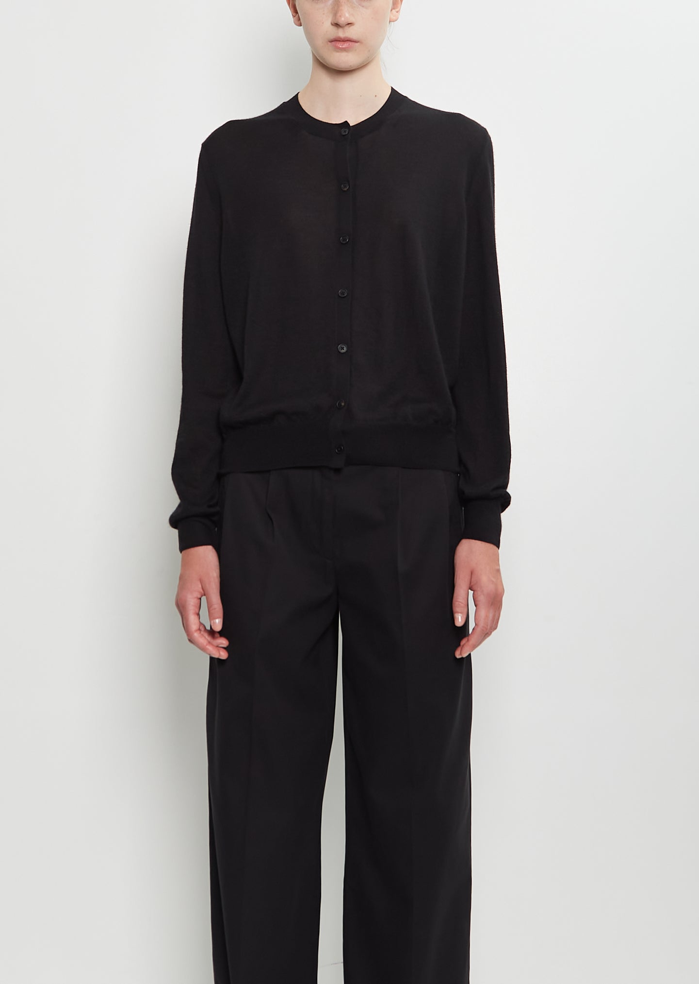 The Row black cardigan with tonal horn-hued buttons closure in lightweight cashmere knit. Features set-in shoulders, and a fine rib trim at neckline, cuffs and hem. Relaxed fit.