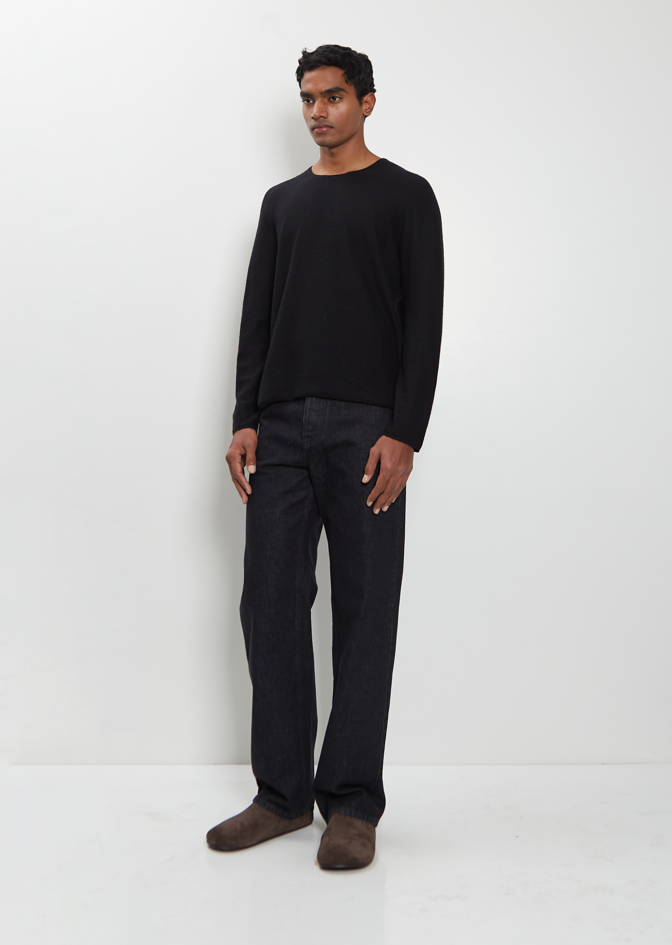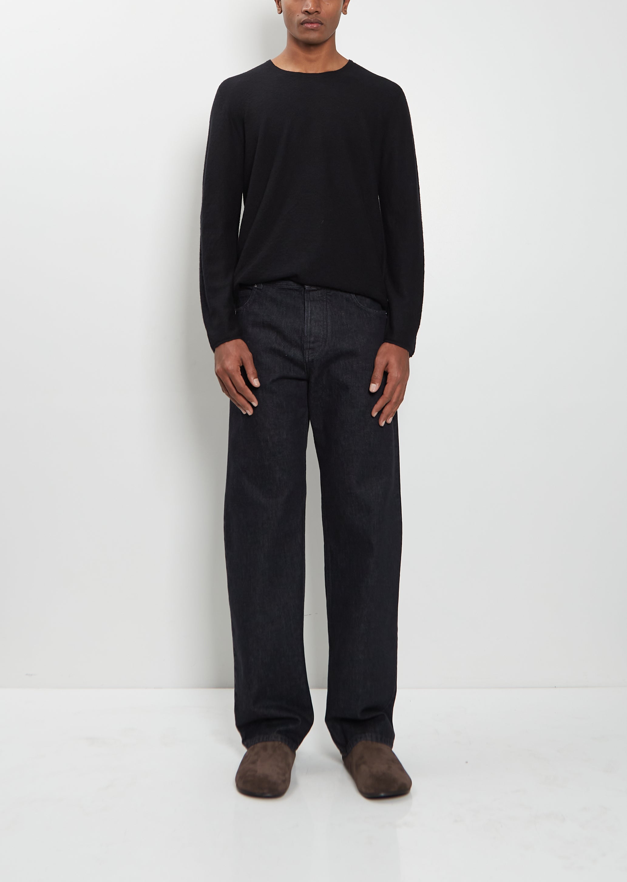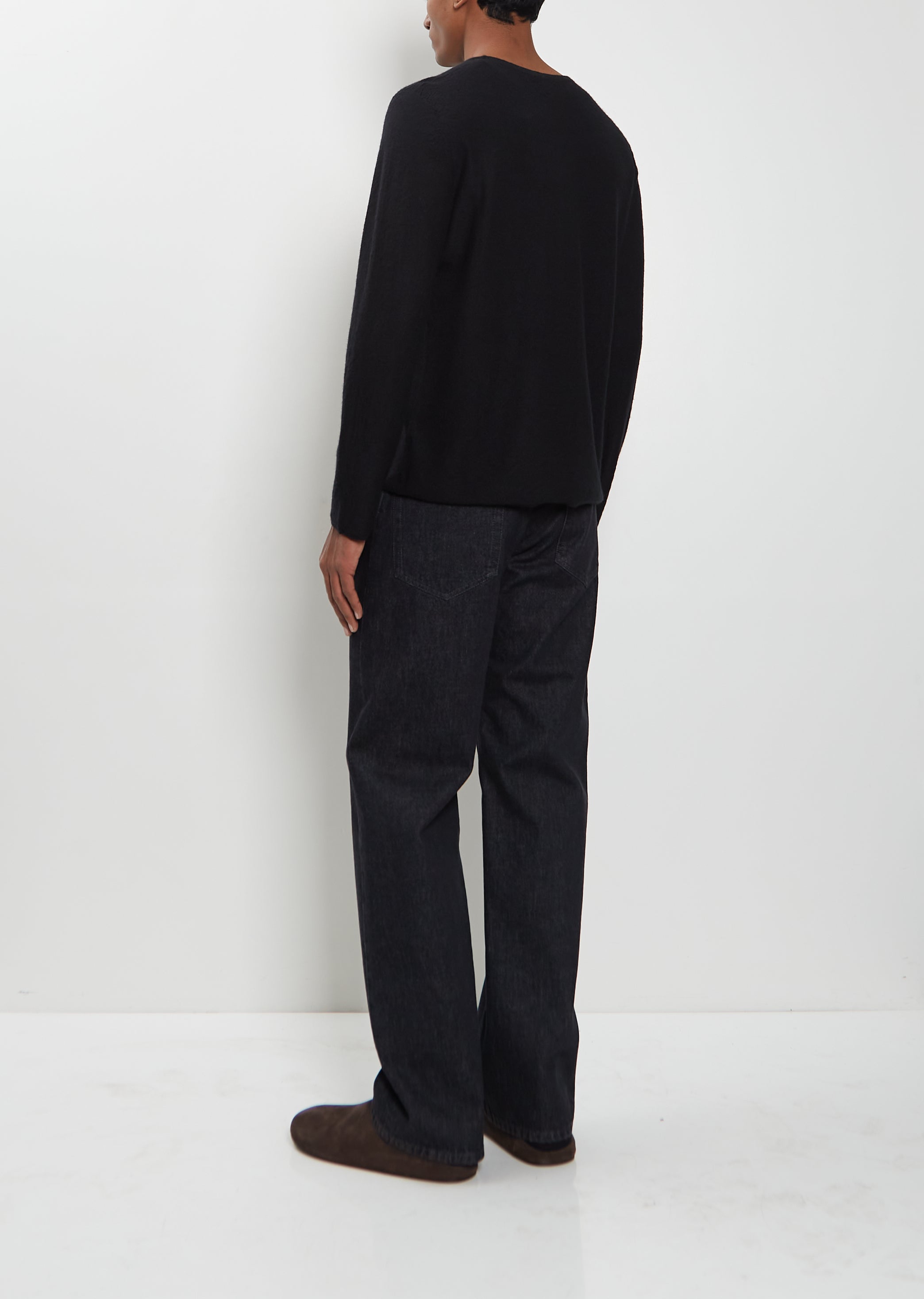 Th Row black low-rise jean with straight legs in rinsed indigo cotton denim. Features tonal topstitching, a classic 5-pocket construction and button zip-fly fastening.