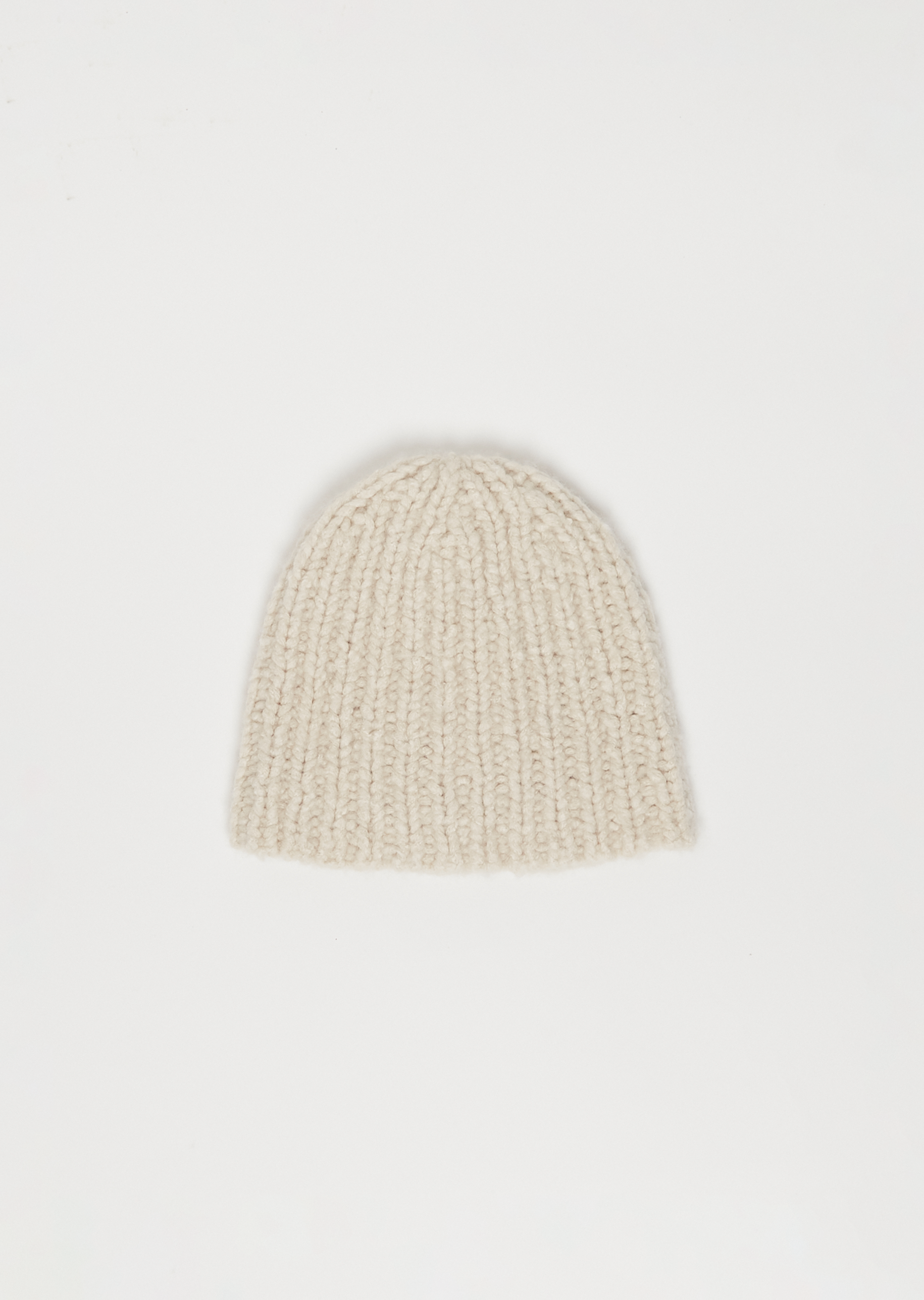 Wommelsdorff ivory and light beige beanie hand knitted from the finest ribbed heavyweight cashmere and silk blend yarn in Berlin.