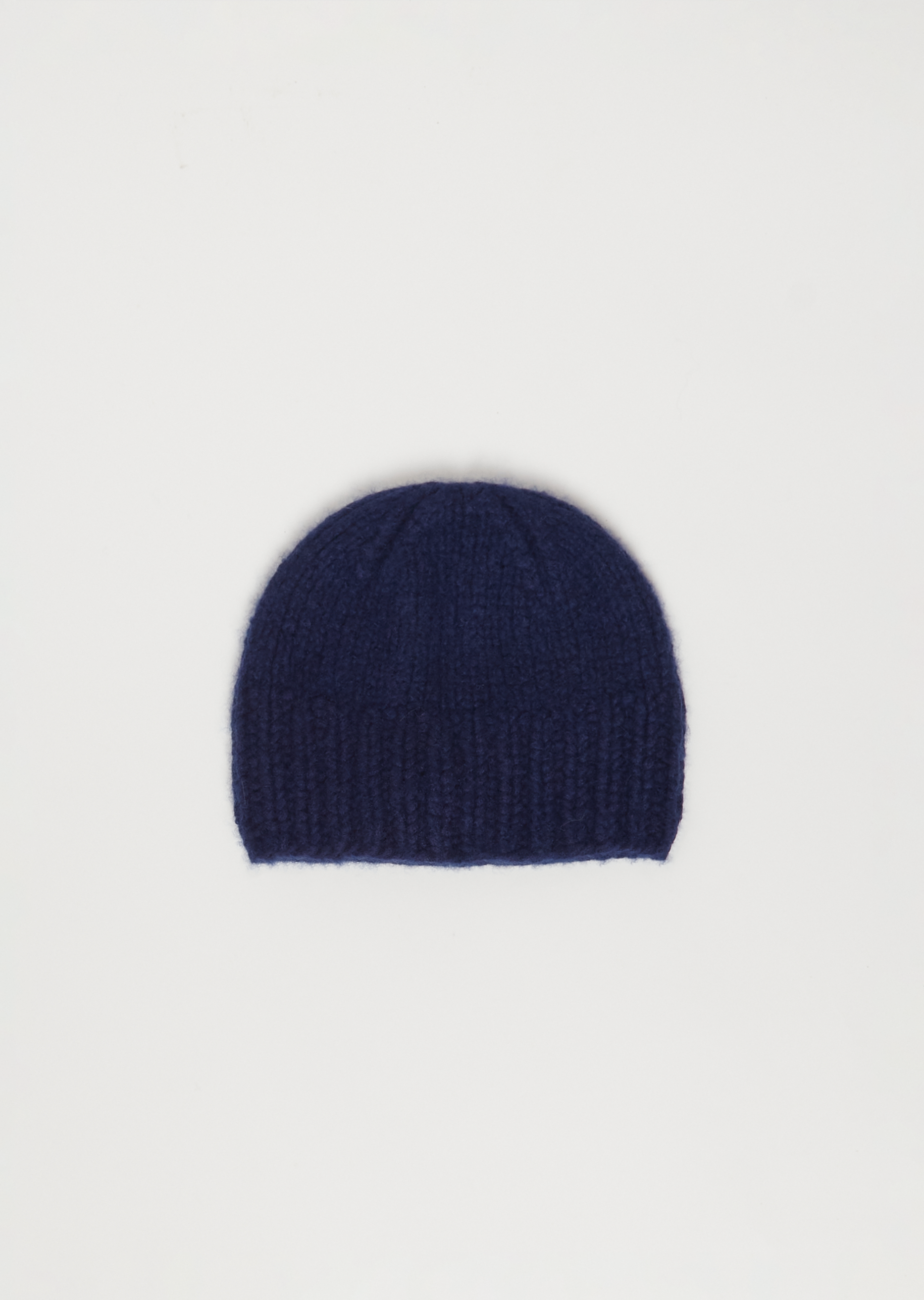 Wommelsdorff two-toned indigo and ink blue beanie hand knitted from the finest heavyweight cashmere and silk blend yarn in Berlin. Finished with a wide ribbed trim.