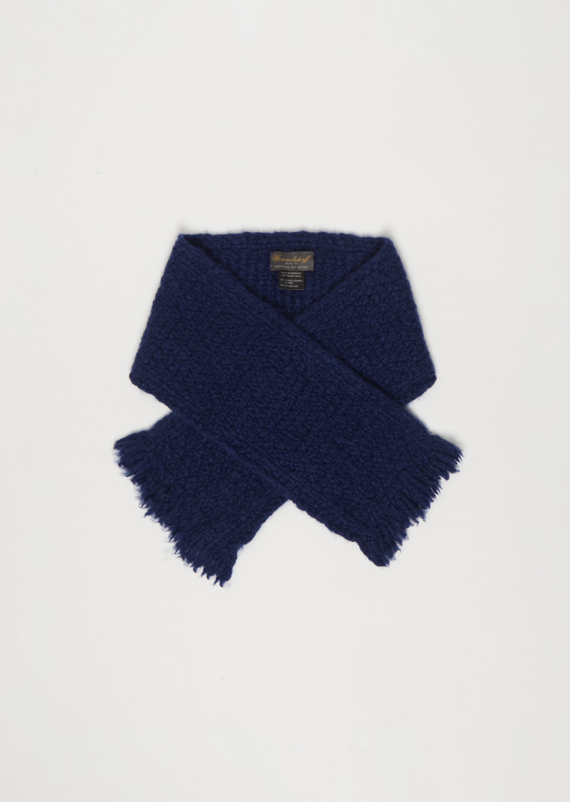 Wommelsdorff indigo blue one-of-a-kind rectangular scarf with fringed edges hand-knitted from the finest ribbed mid-weight cashmere and silk in Berlin.