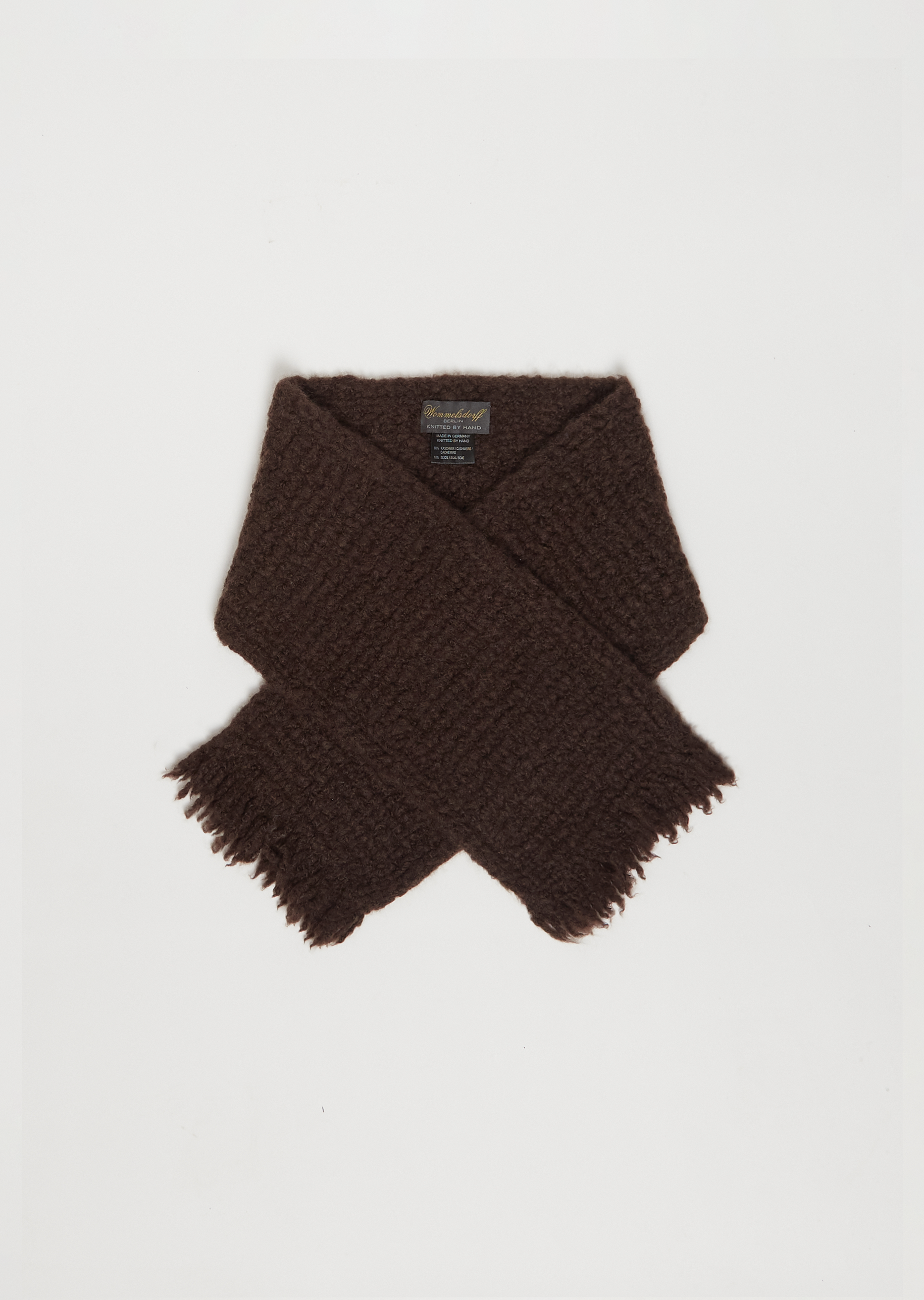 Wommelsdorff brown one-of-a-kind rectangular scarf with fringed edges hand-knitted from the finest ribbed mid-weight cashmere and silk in Berlin.