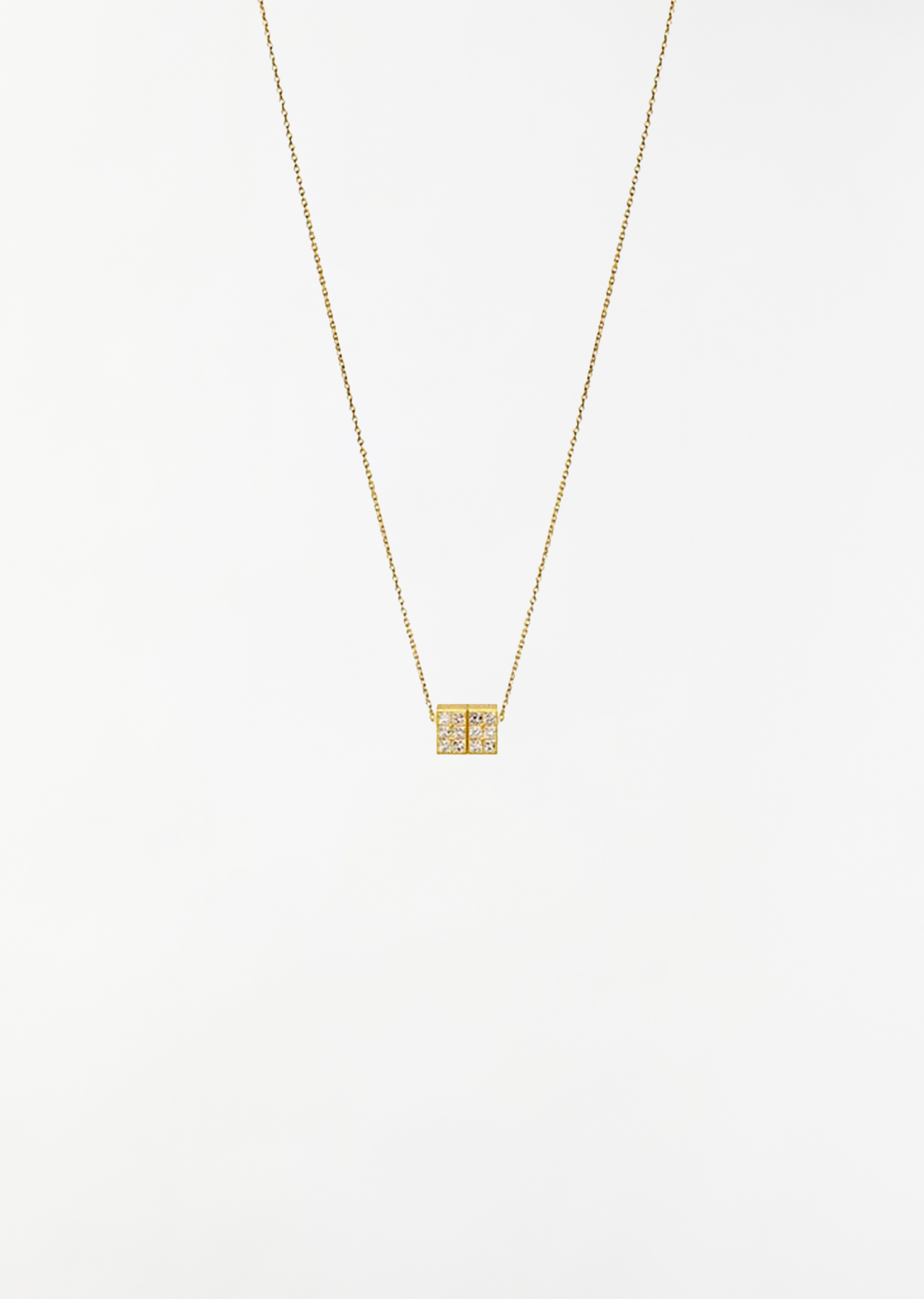Shihara necklace with two adjustable rectangle cubes handcrafted in 18K yellow gold and pavé diamonds. The cubes can be moved along the chain for various styling and length possibilities.