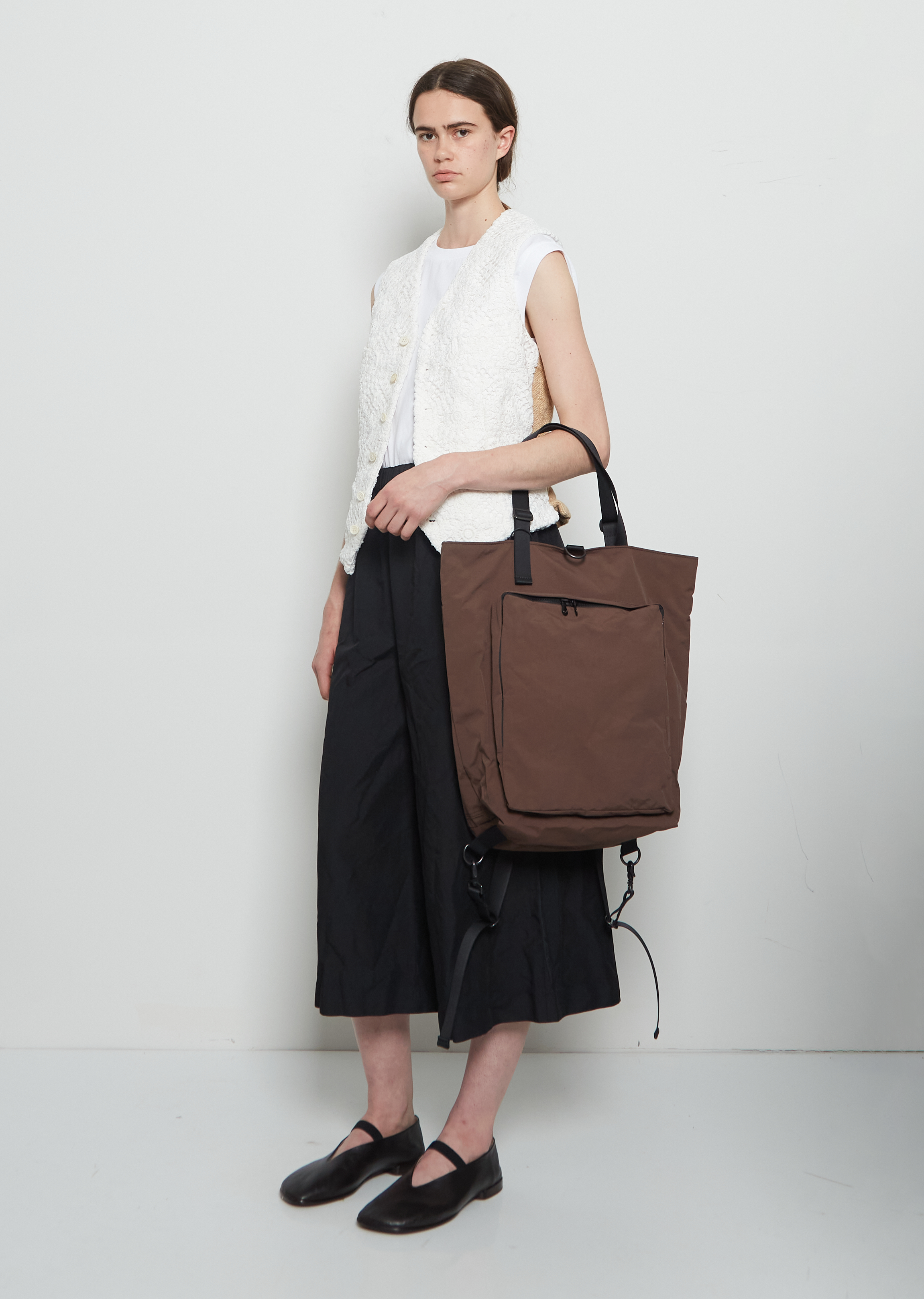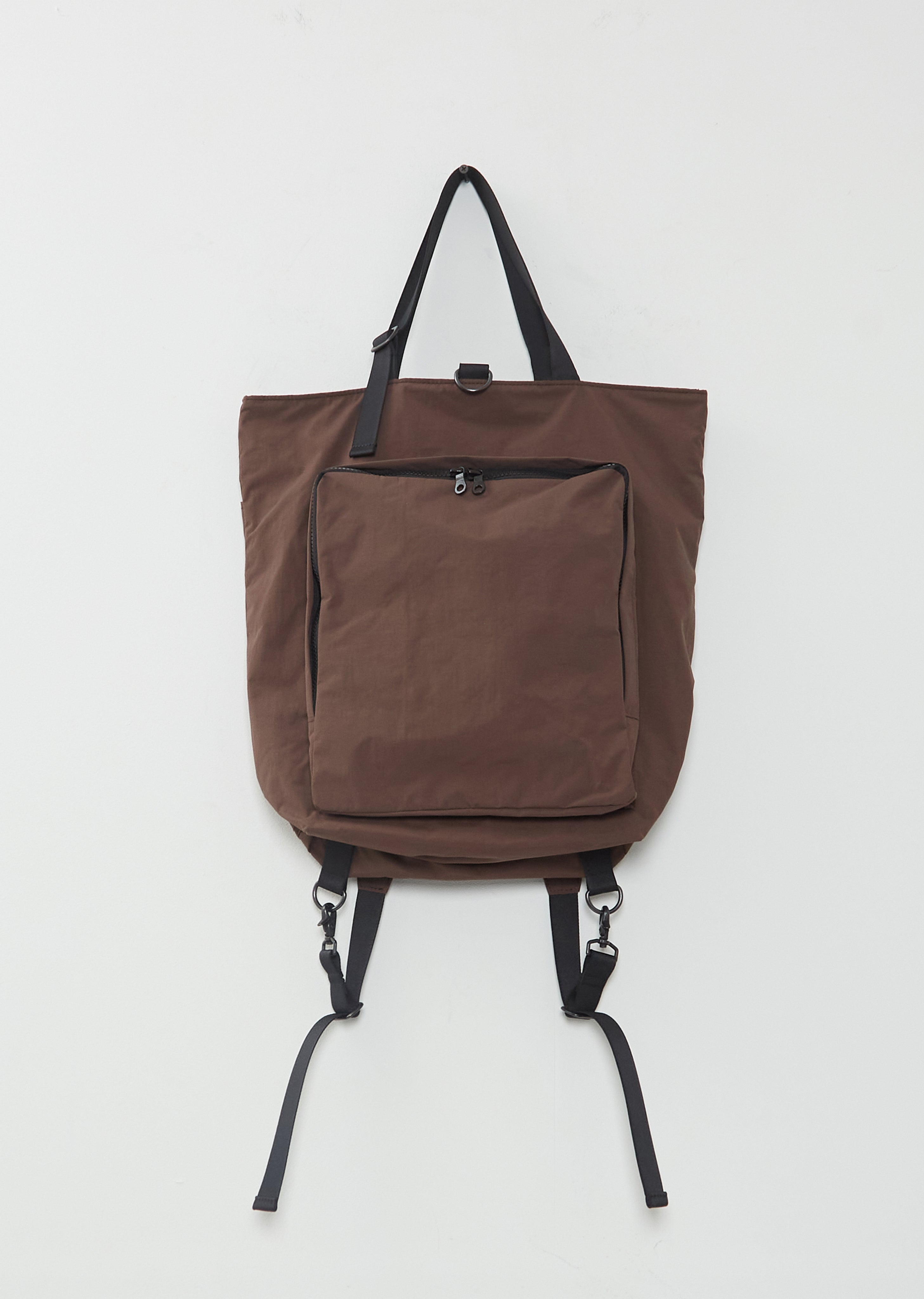Amiacalva brown signature 2-Way backpack with adjustable cushioned shoulder straps and adjustable webbing top handles in soft nylon gabardine.
