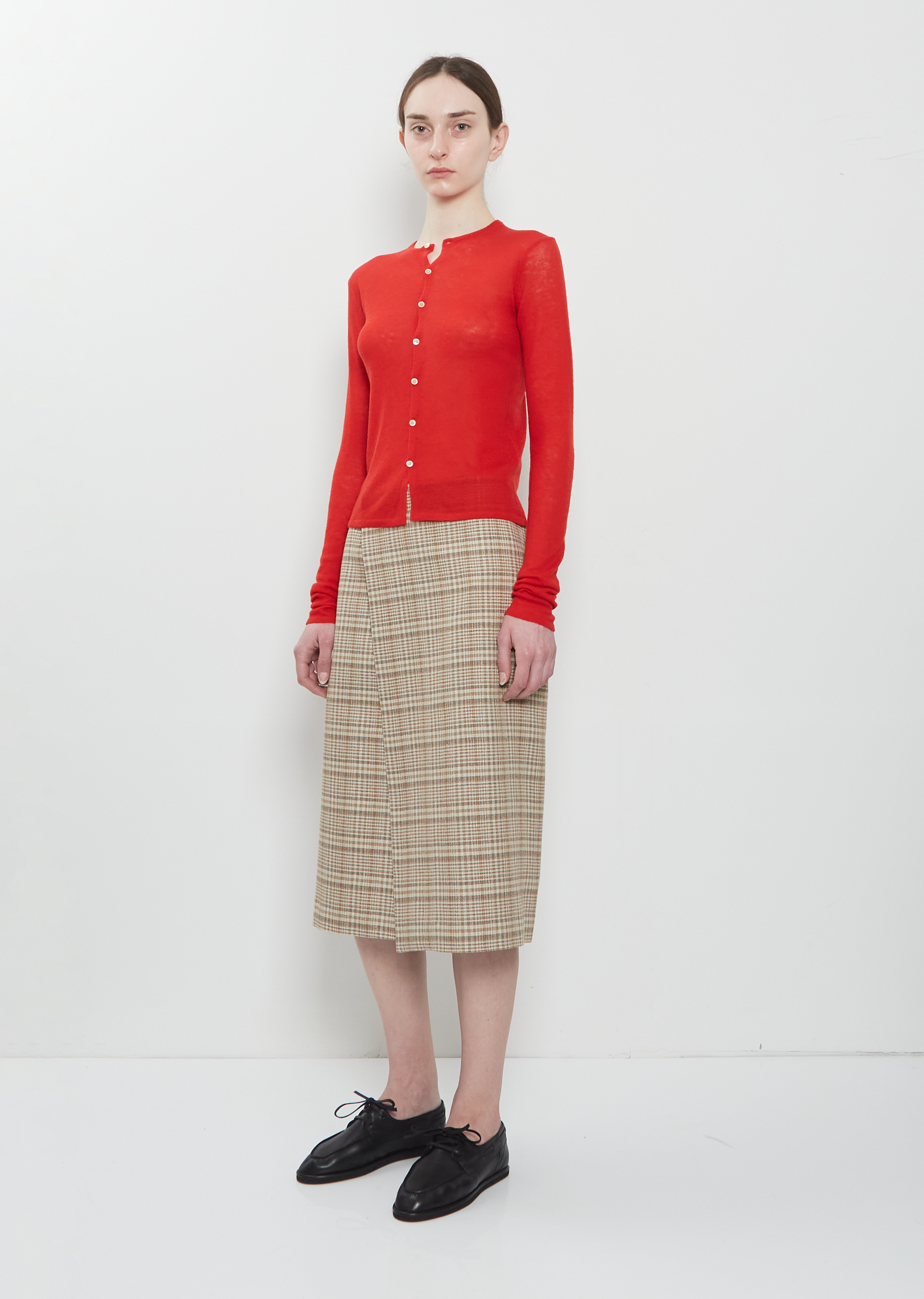 Auralee red cardigan with a crew neck and set-in shoulders in a smooth and airy cashmere knit with a subtle sheerness. Features a thin ribbed trim at neck, opening, cuffs and hem, and a shell-hued buttons closure. Regular fit.