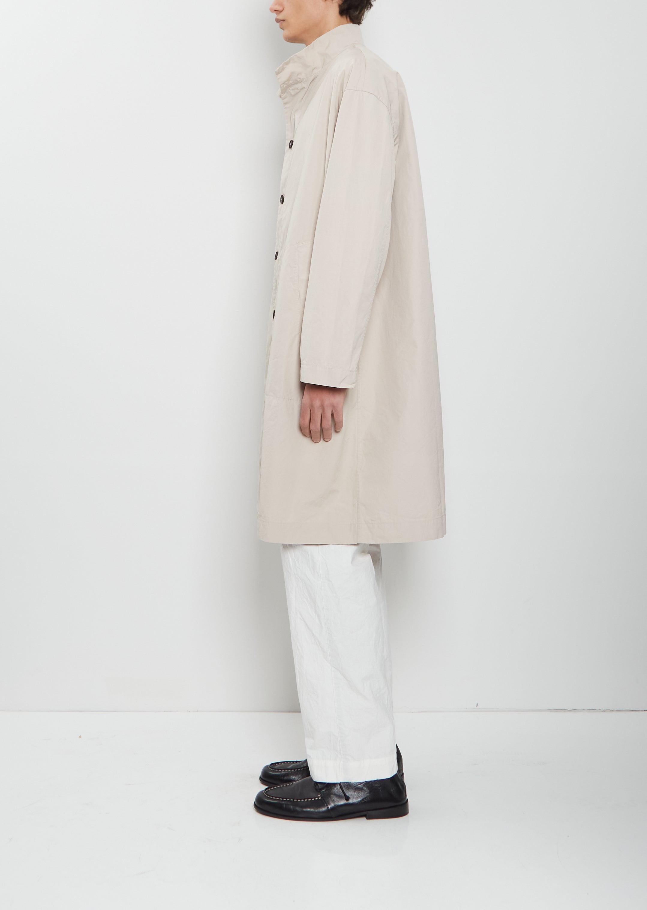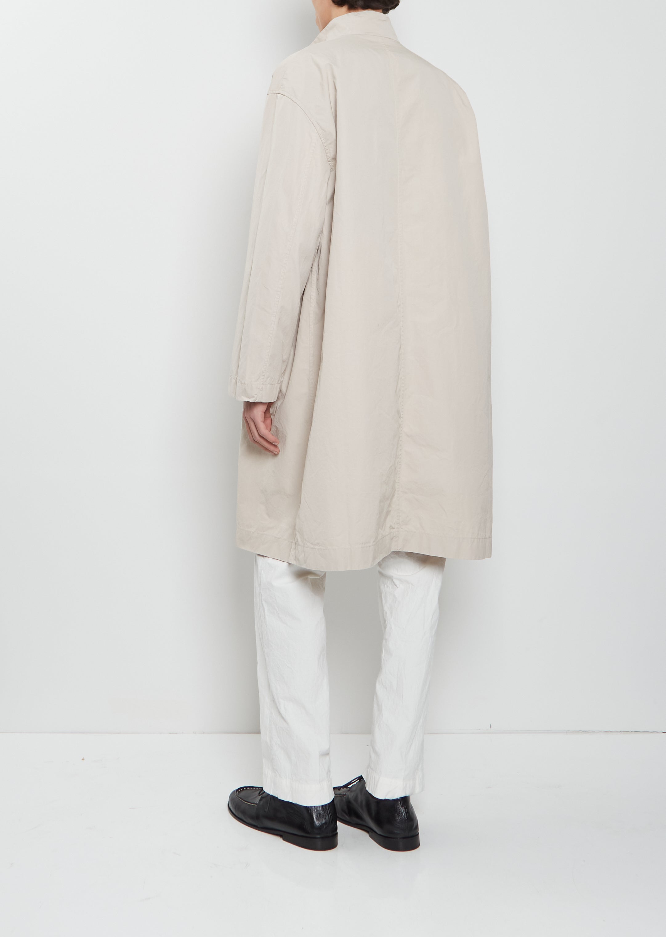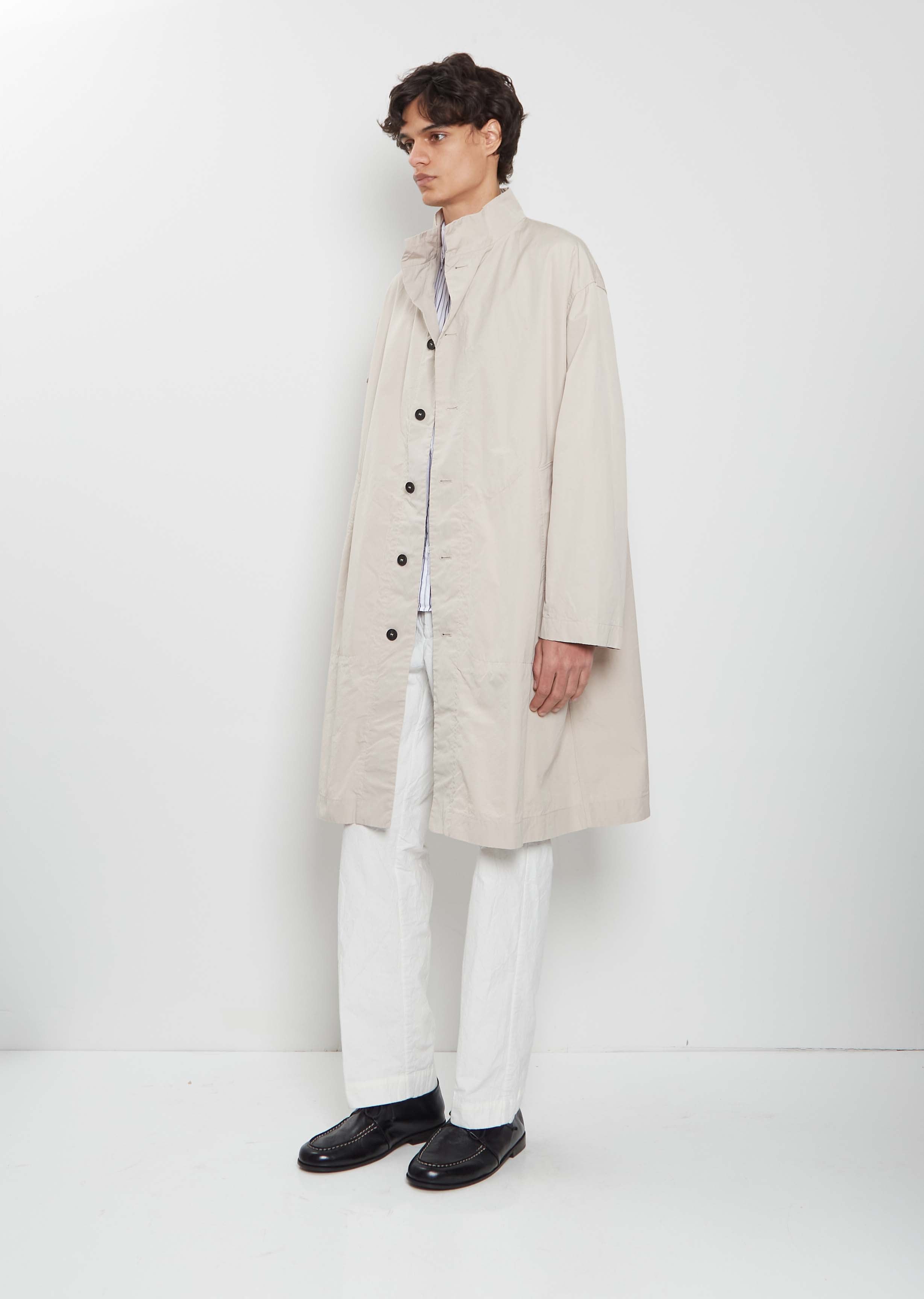 Bergfabel sand beige oversized coat with a generous stand collar and contrasting button closure in crisp and lightweight cotton. Features slightly dropped shoulders, angled welt pockets and a straight hem. Comes unlined. Oversized, relaxed fit.