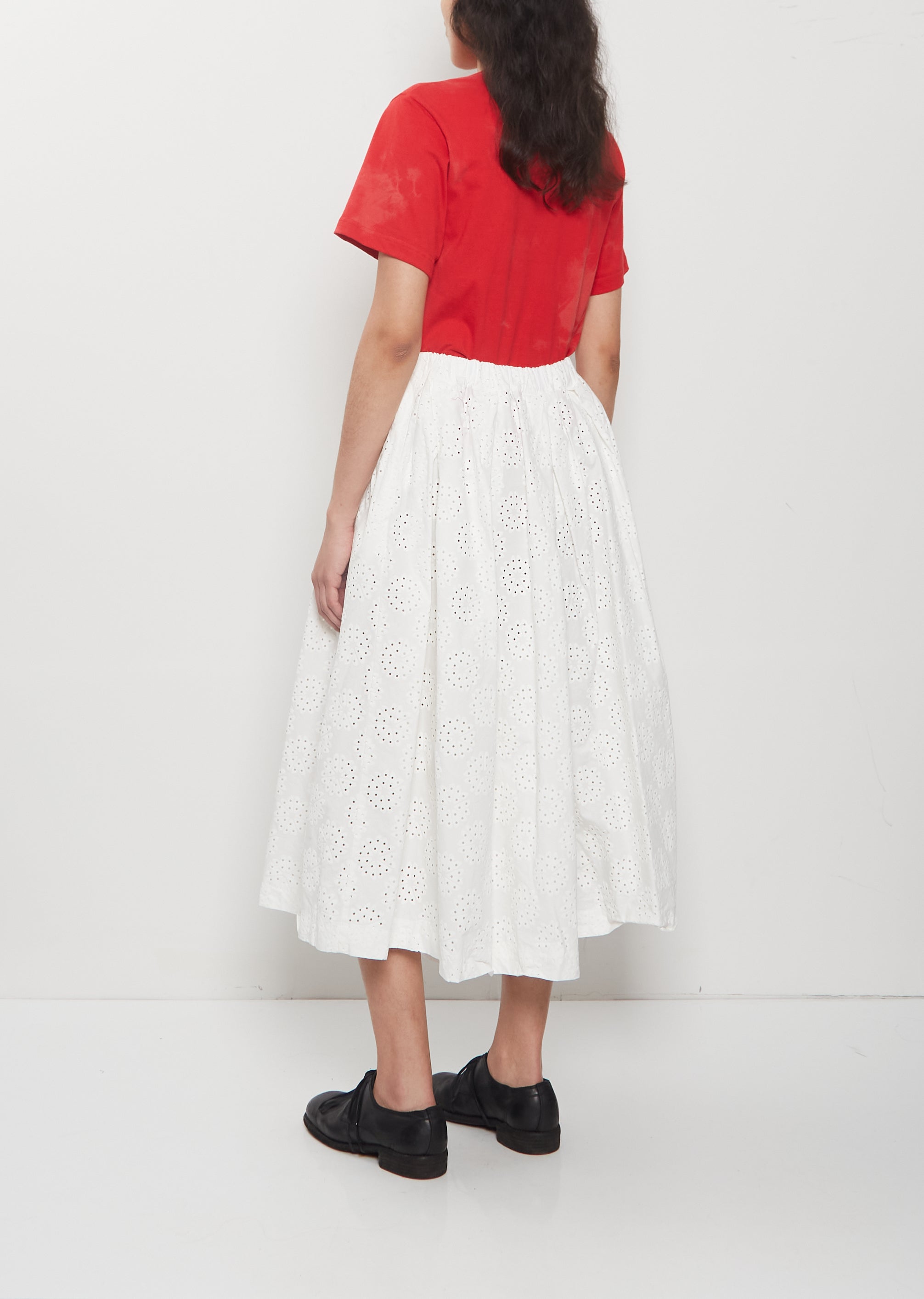Comme des Garçons white pull-on cropped pant with wide legs and a pleated waist in a dense and textured cotton with a floral pattern and punched details. Features an elasticated waistband with a tonal interior drawstring and side welt pockets. Comes fully lines in white cotton.