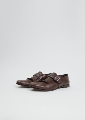 Church's brown iconic brogue loafer with a monk strap in calfskin leather with a distressed finish. Features a round toe, fringe detail at vamp, a silver-hued buckle, perforated details, a branded leather insole, a low stacked heel and a vintage style rubber sole. Comes lined in leather.