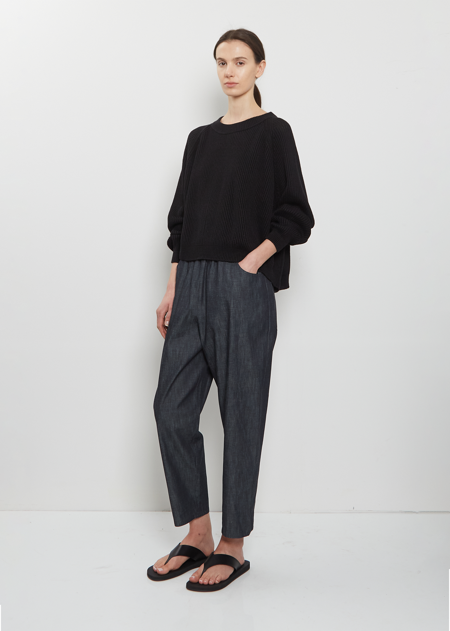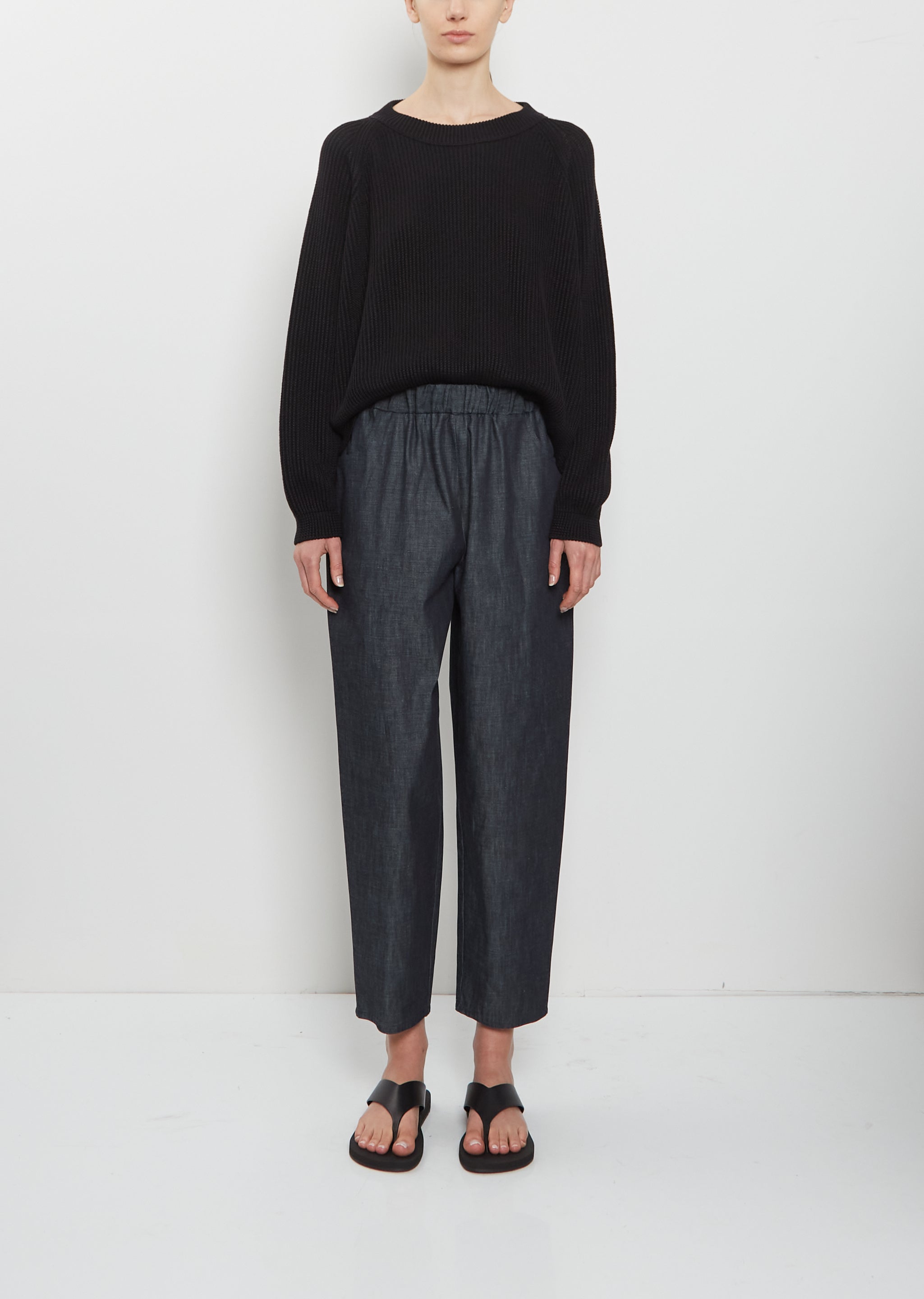 Dušan indigo signature pull-on trousers with tapered legs in a lightweight and crisp cotton. Features an elasticated waistline, side seam pockets, and a slightly cropped inseam.