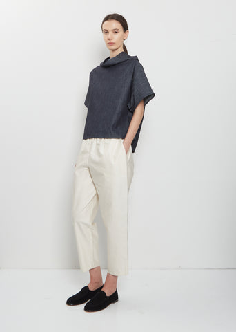 Dušan indigo pullover tunic top with signature seamless high-neck collar in lightweight cotton denim. Features seamless short dolman sleeves and back yoke with box pleat for subtle volume. Straight silhouette with a relaxed, easy fit.
