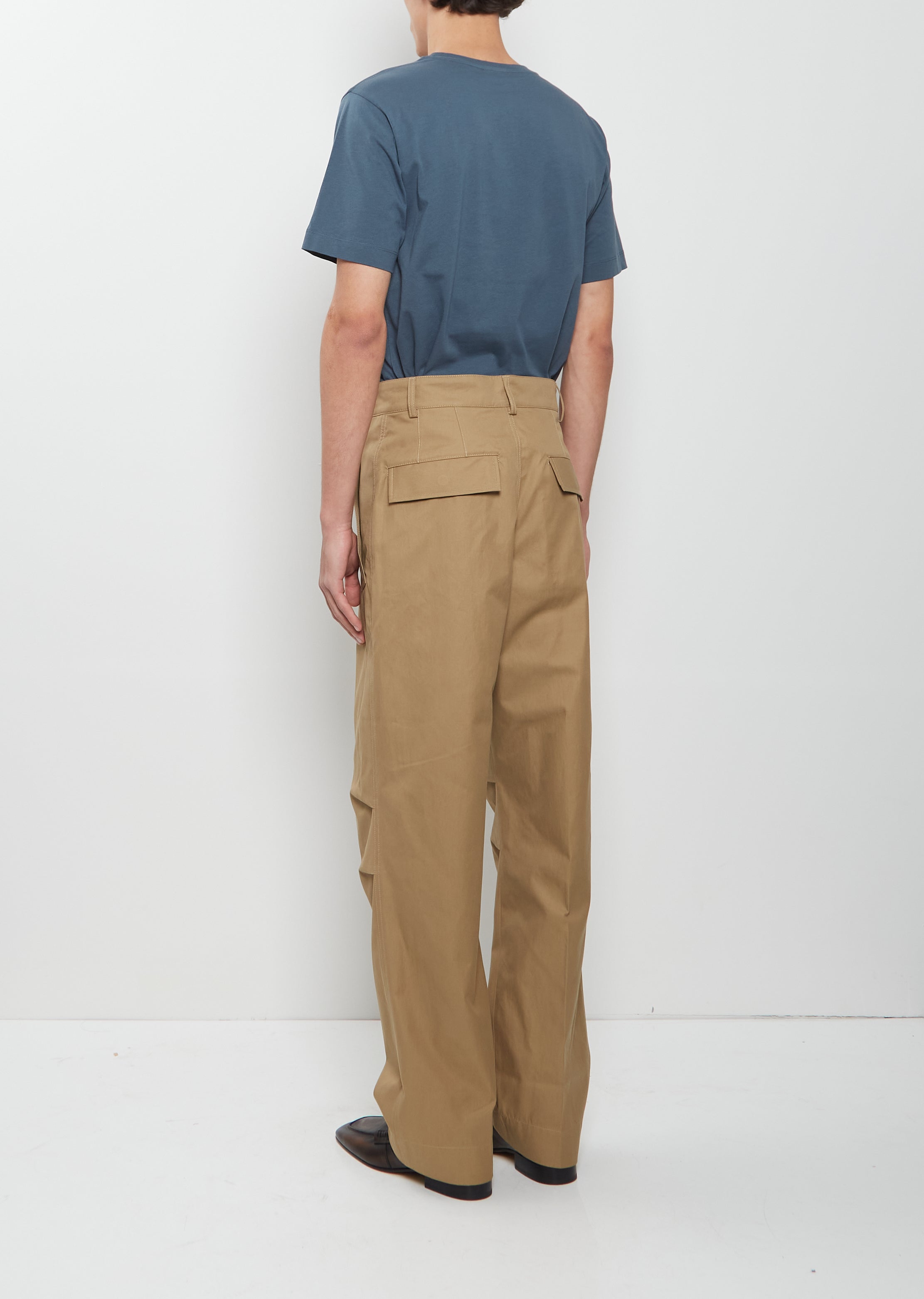 Dries Van Noten camel pants with wide legs in mid-weight cotton twill. Features a belt loops, angled pockets, flap pockets at back, and button and zip-fly fastening.