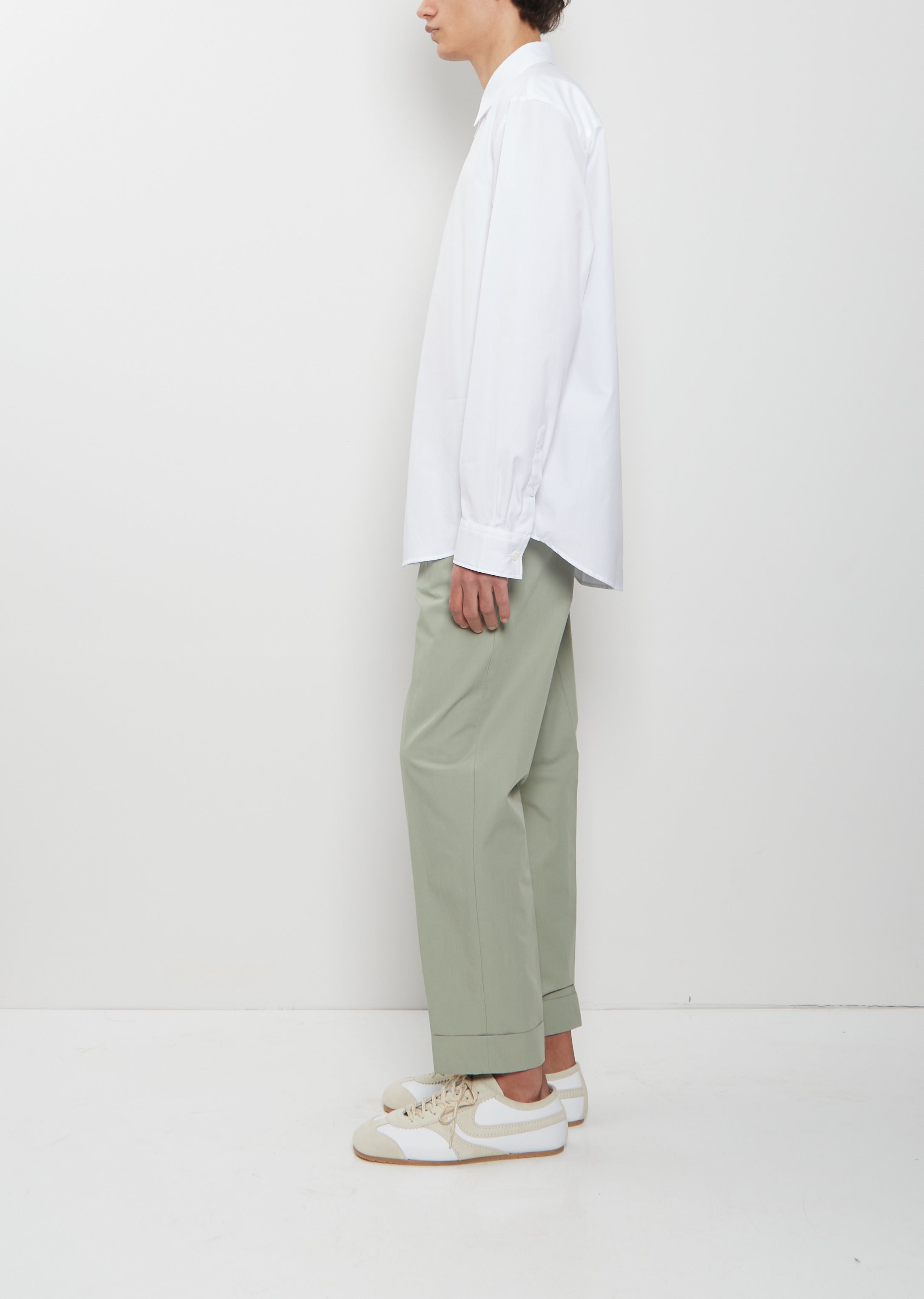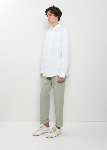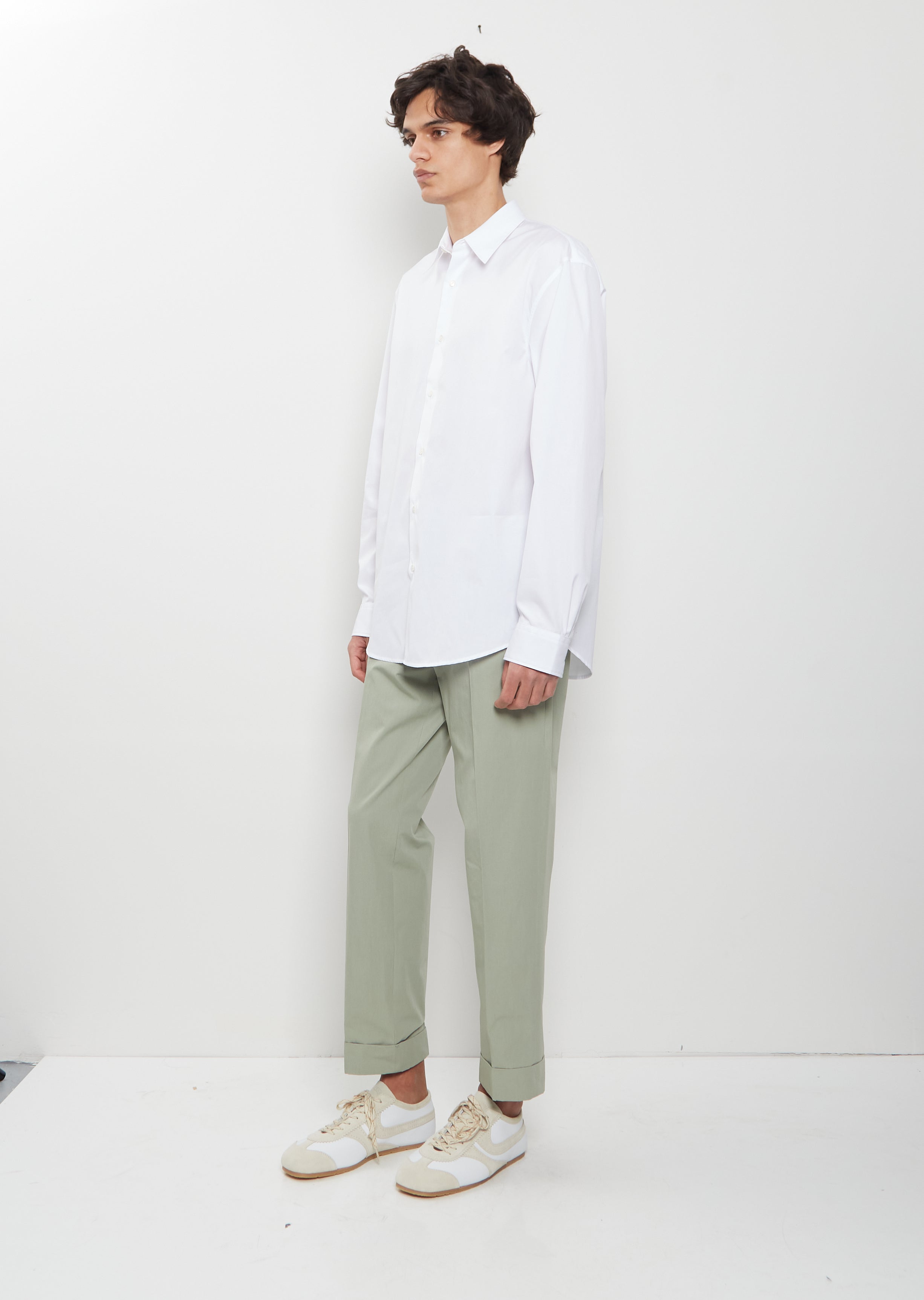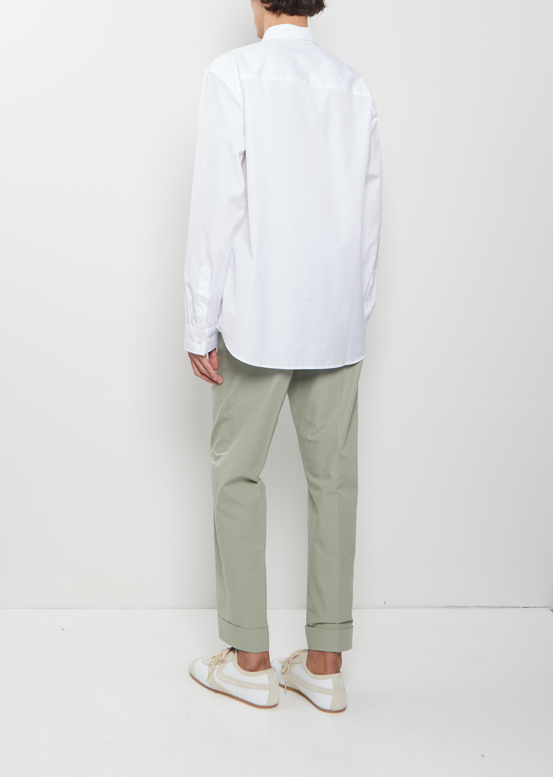 Dries Van Noten white shirt with a classic collar and tonal button front in easy-iron cotton poplin. Features slightly dropped shoulders, buttoned cuffs, a curved hem, and back yoke. Relaxed fit.
