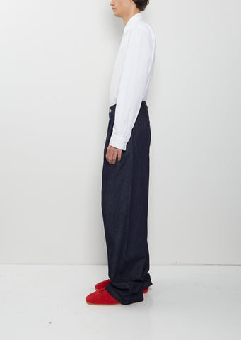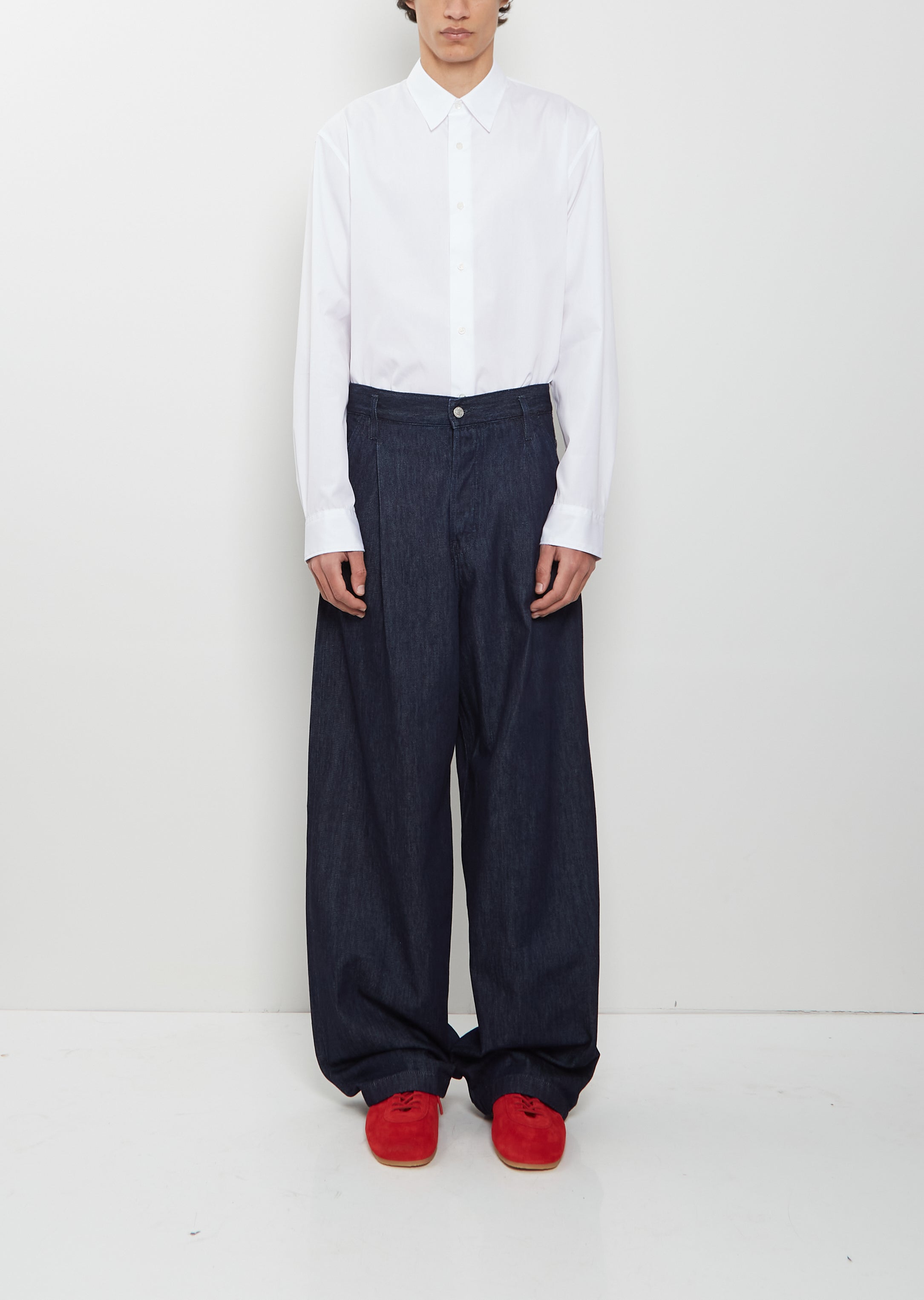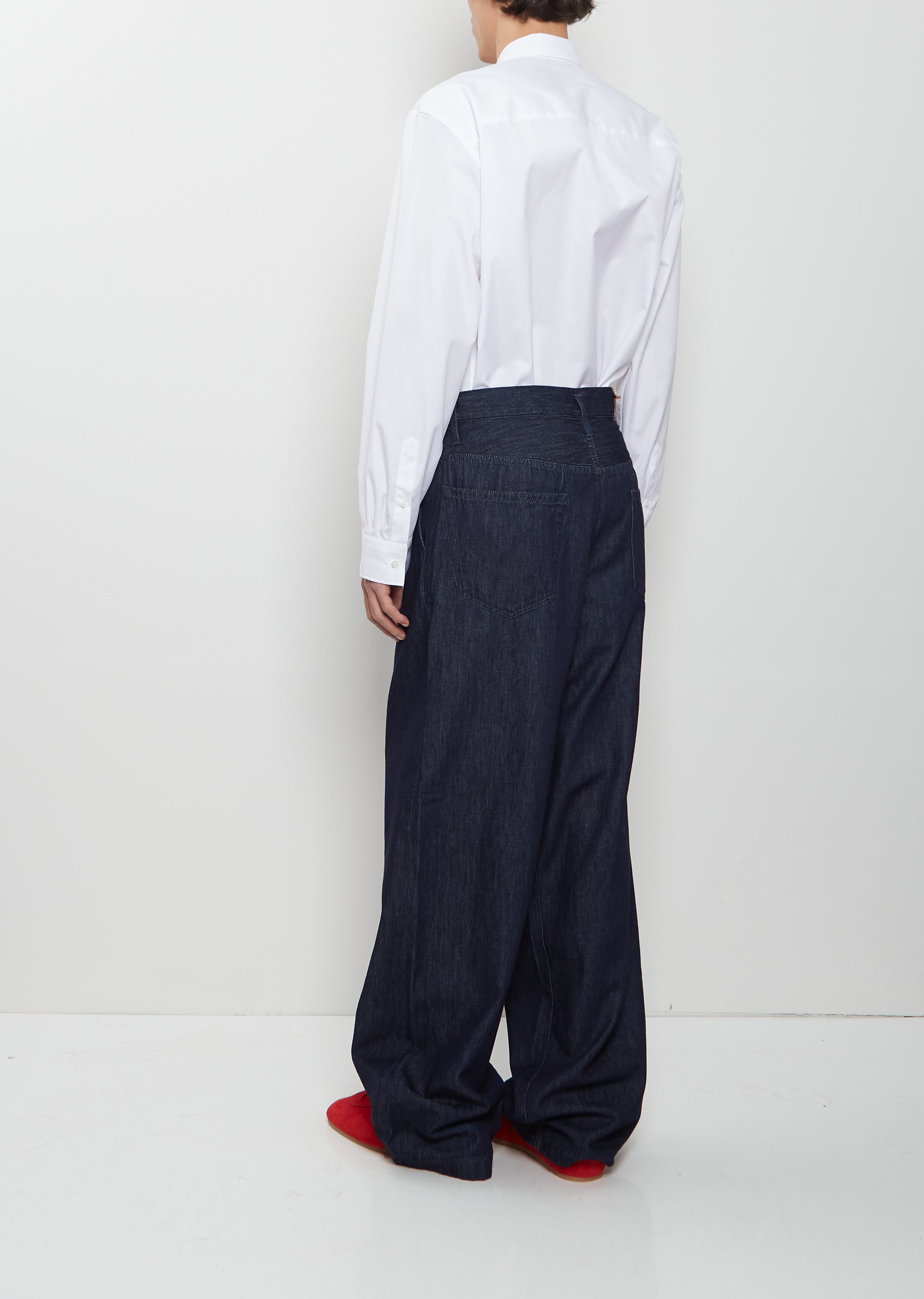 Dries Van Noten indigo pants with wide legs and front pleats in washed heavyweight denim. Features belt loops, angled pockets, patch pockets at back and a button and zip-fly fastening.
