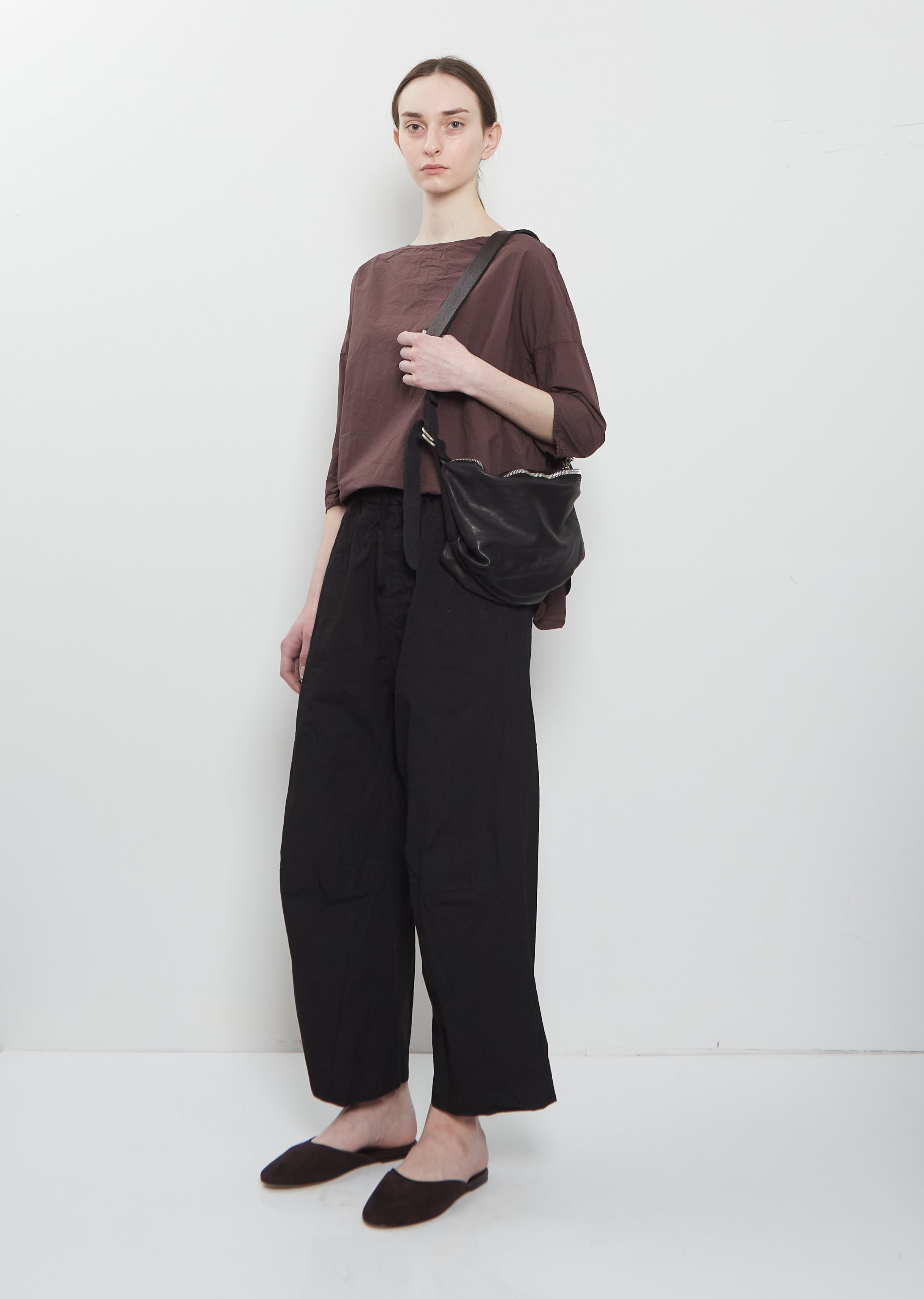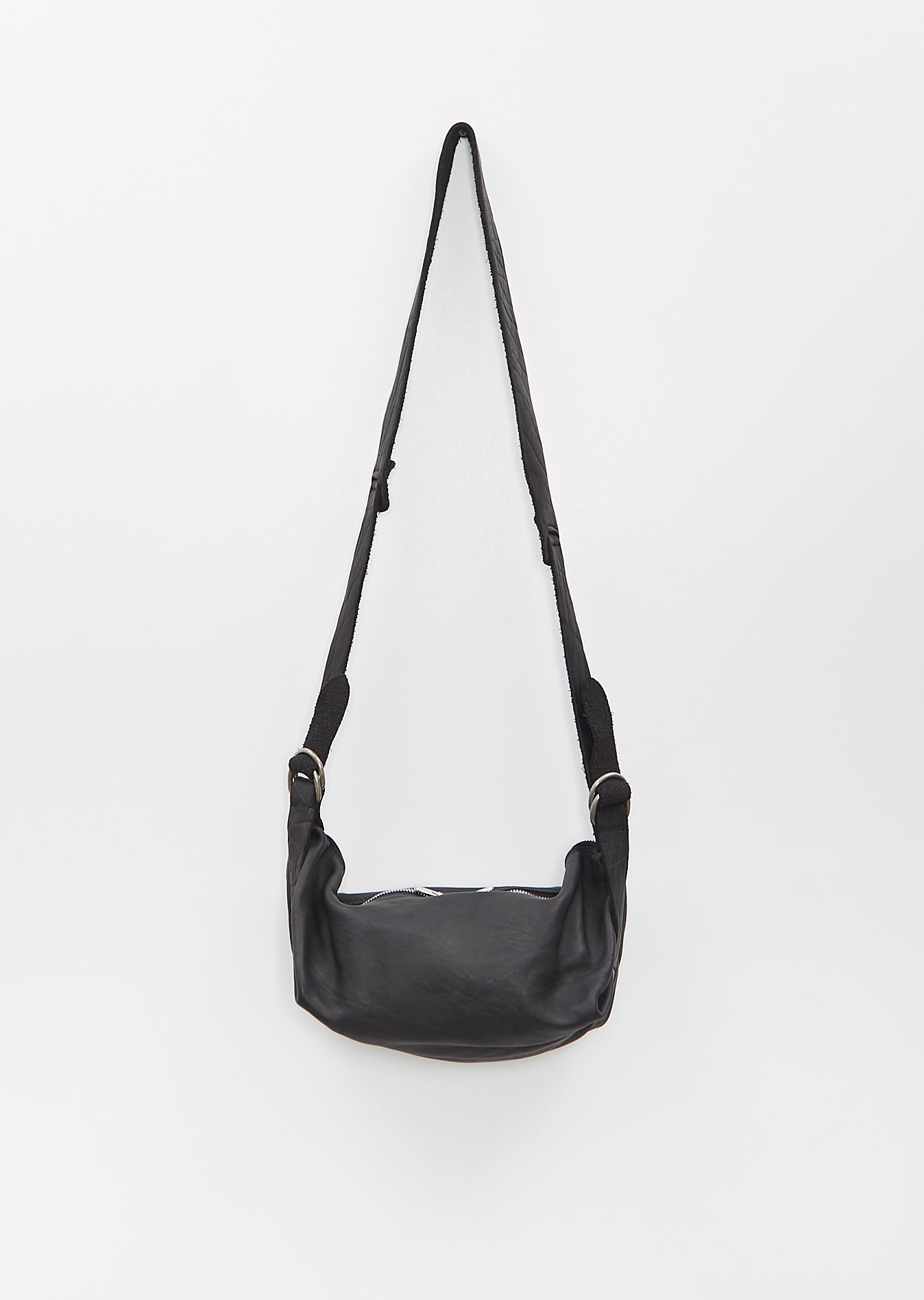 Guidi black crossbody shoulder bag with top silver-toned zipper closure in vegetable-tanned soft full grain horse leather. Features an adjustable shoulder strap with D-rind system and tonal topstitching. Comes unlined.