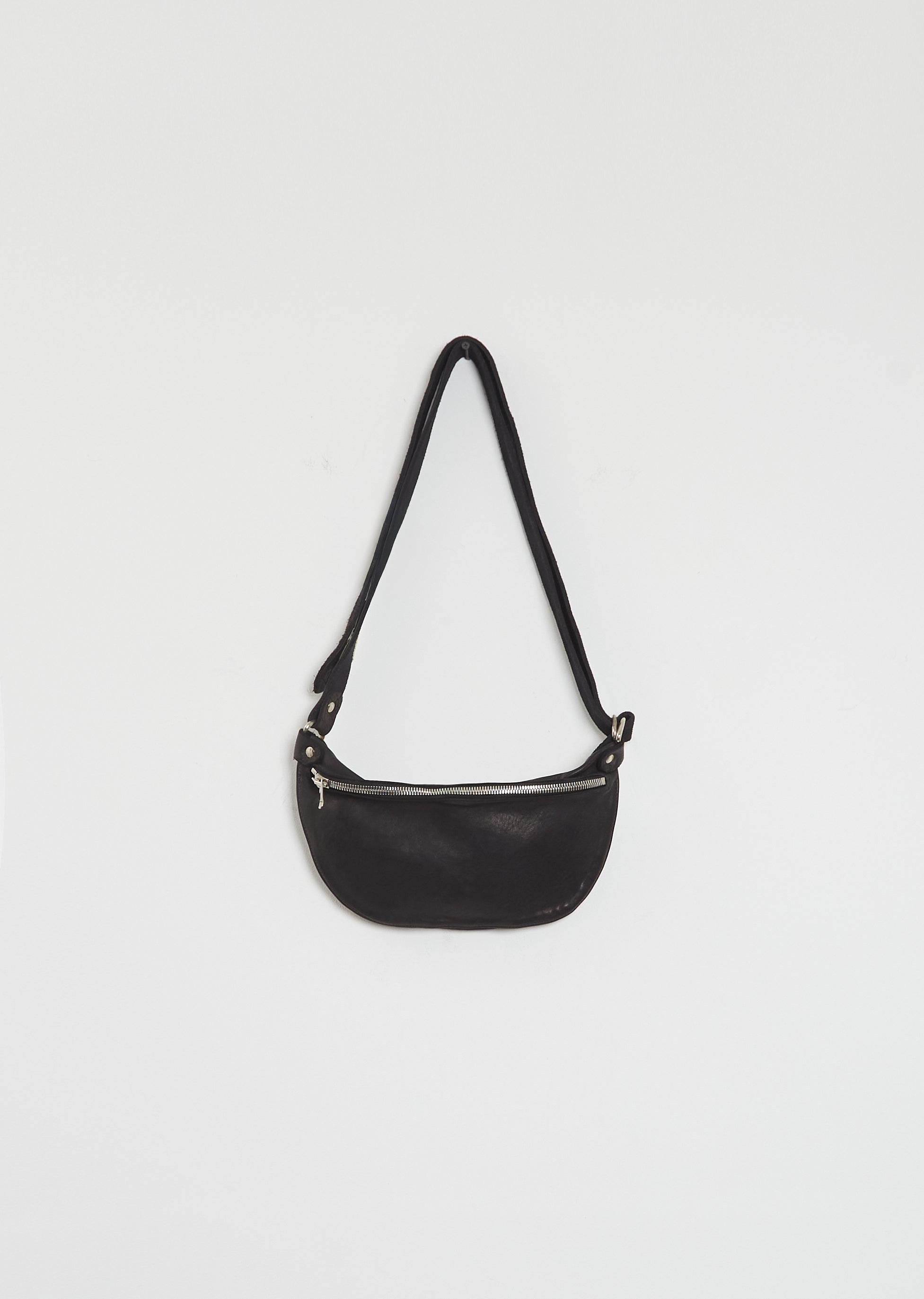 Guidi black belt bag in the small size with a single compartment and silver-toned zipper closure in vegetable-tanned soft full grain horse leather. Features an adjustable strap with D-ring system and tonal topstitching. Comes unlined.