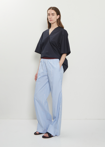 Plan C blue stripes pull-on pants with wide legs  in crisp and dense cotton poplin. Features a contrasting burgundy elasticated waistline and side seam pockets. Relaxed fit.