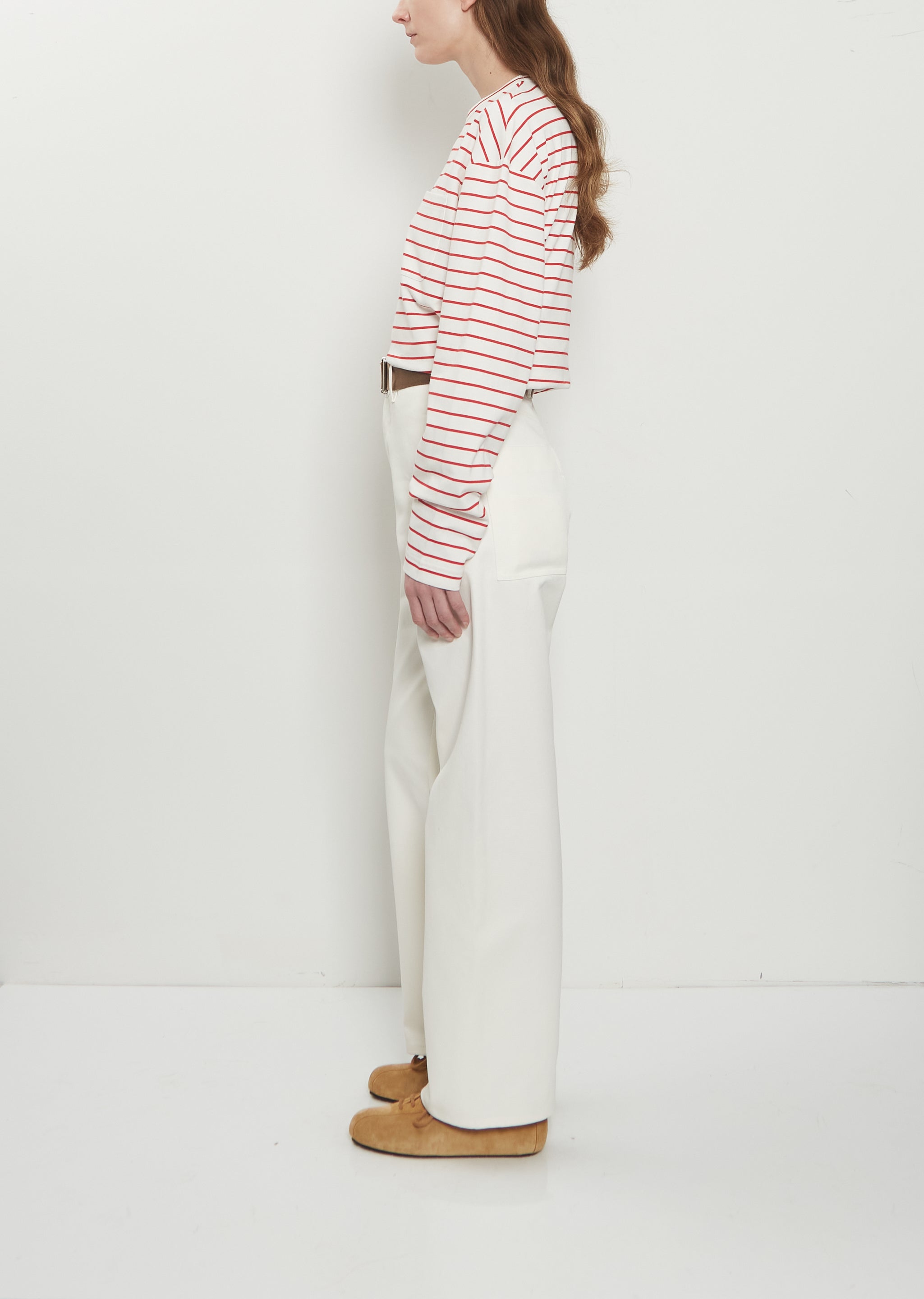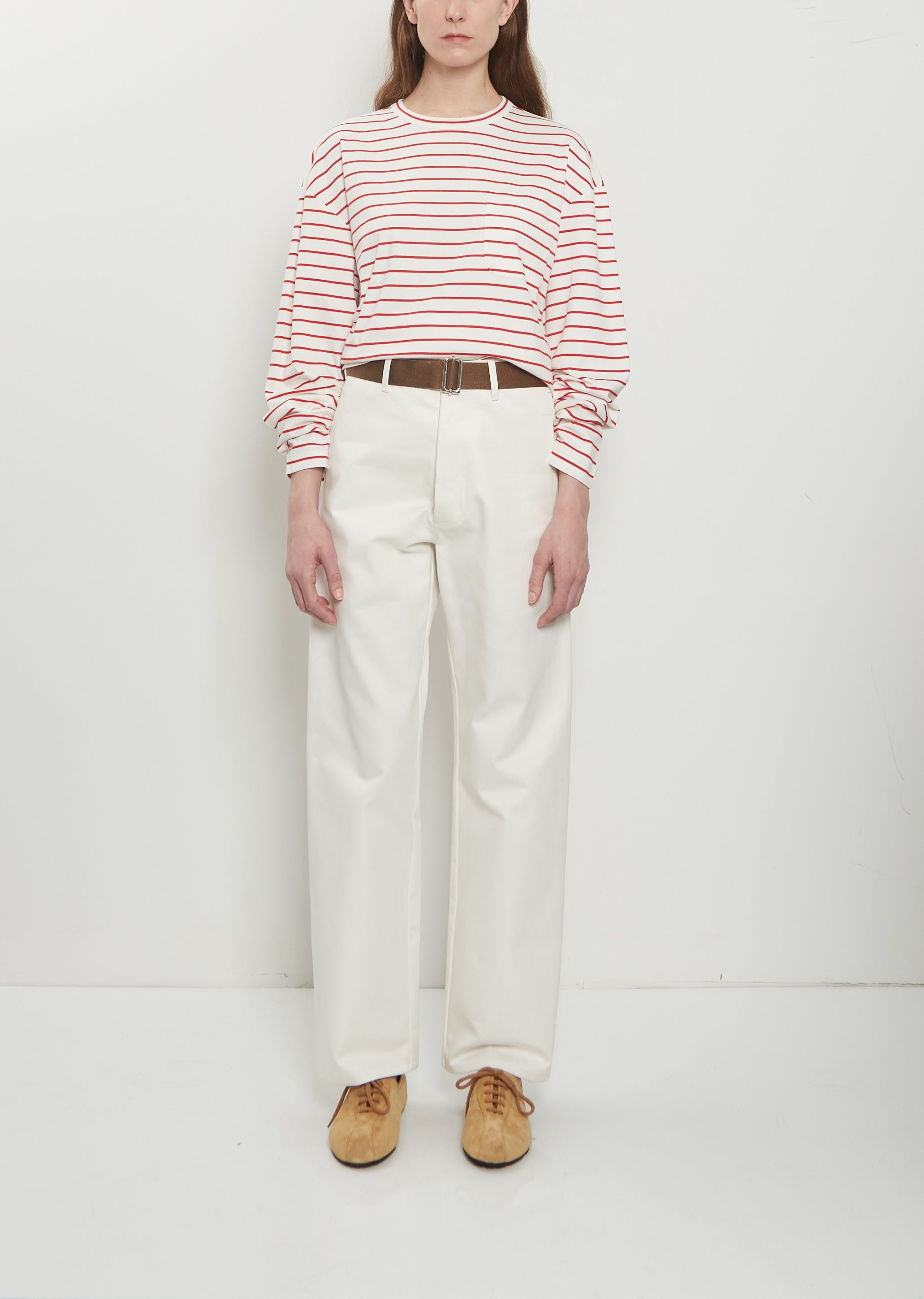 Plan C off-white new trousers with wide, straight legs and removable brown fabric belt in dense cotton drill. Features belt loops, side welt pockets, back yoke, two deep patch pockets at back and button and zip-fly closure. Relaxed fit.