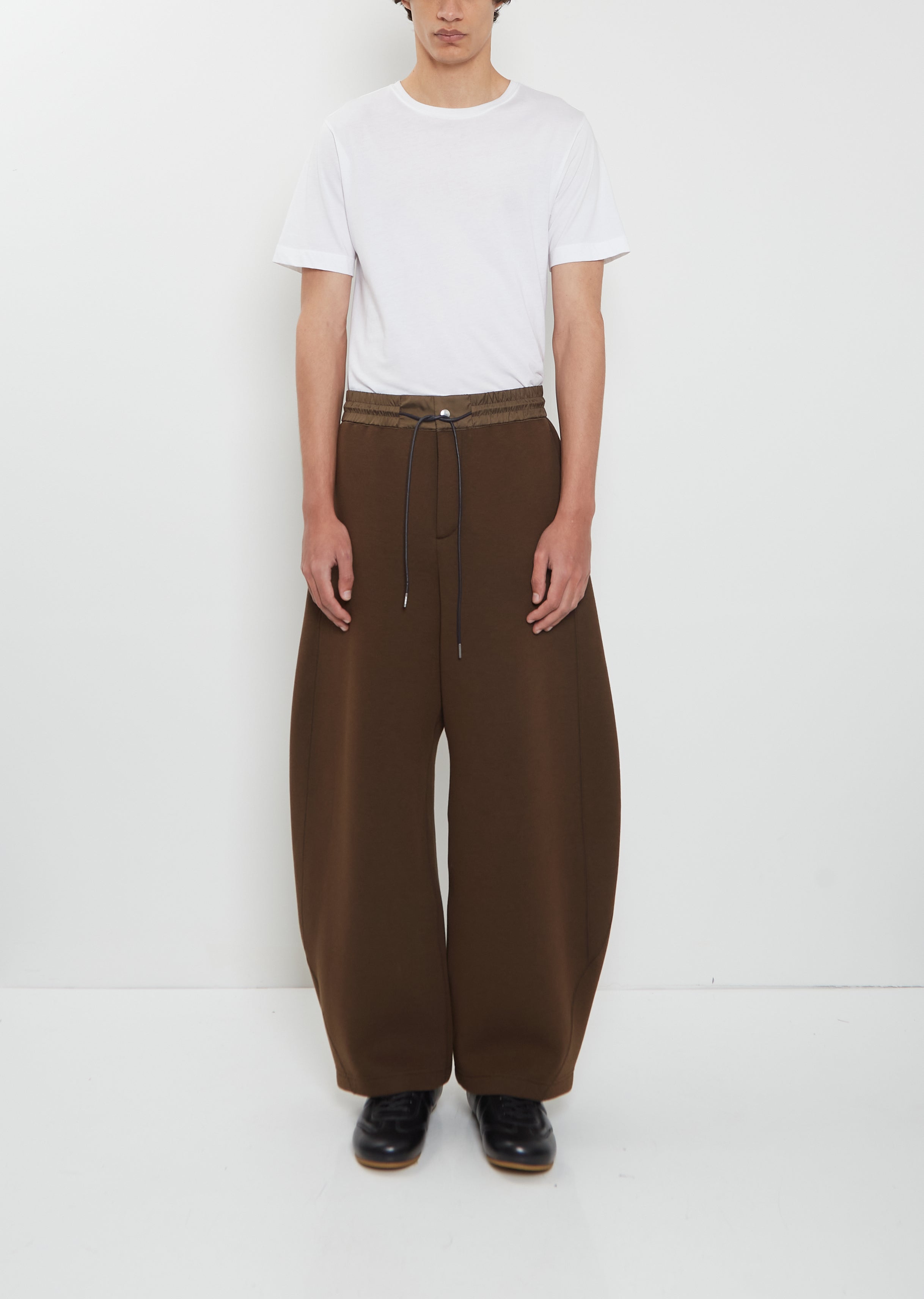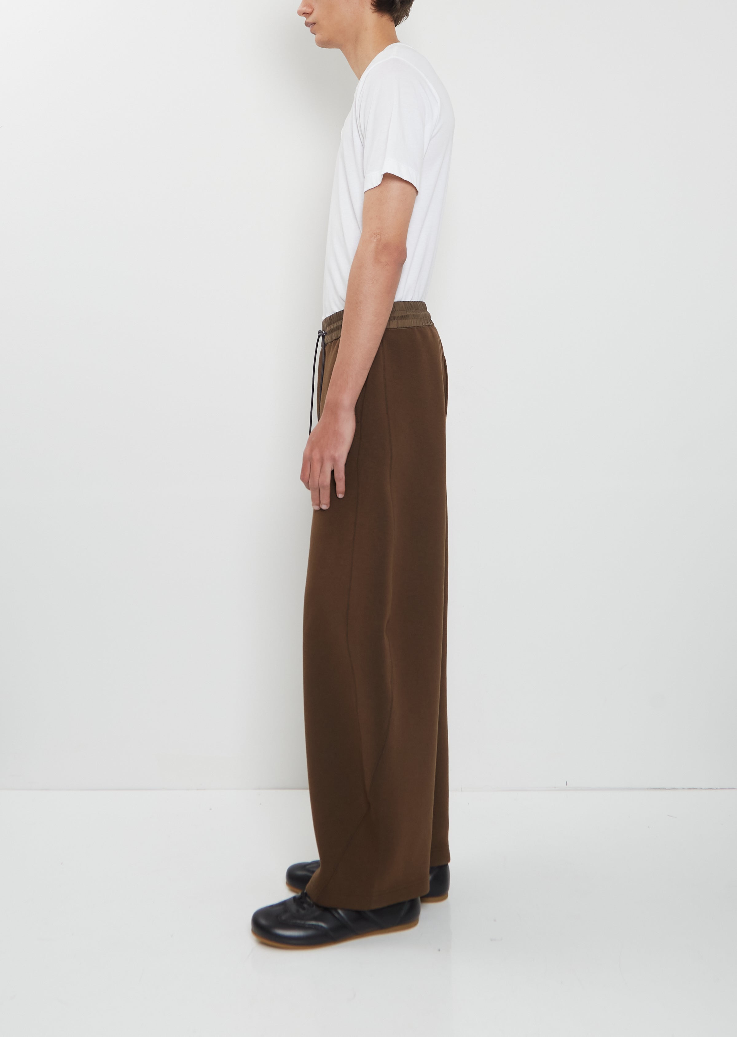 Sacai brown pull-on pants with an elasticated waist and adjustable drawstring in signature sponge jersey sweat fabric. Features a single patch pocket at back and a press button and zip fly fastening.