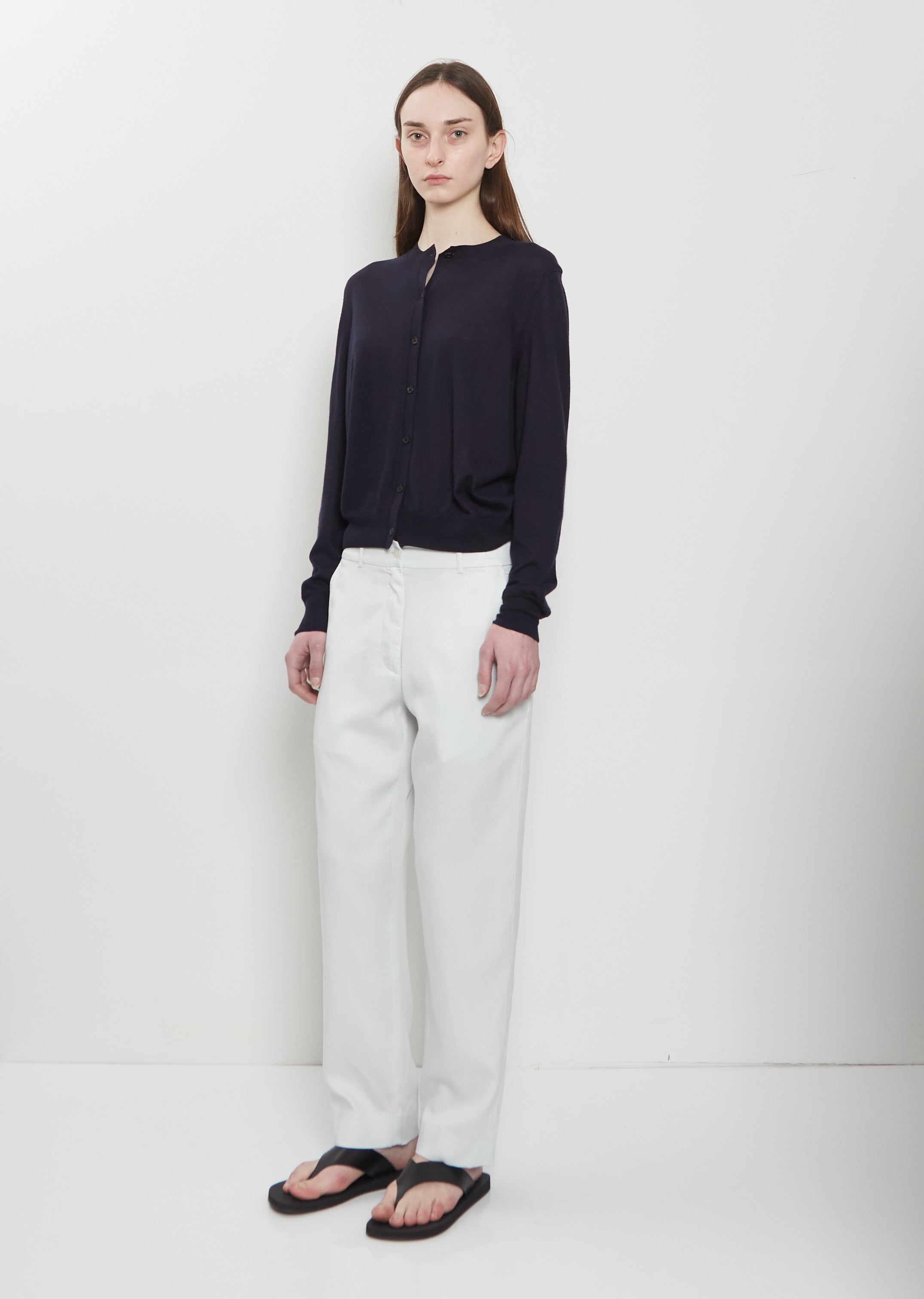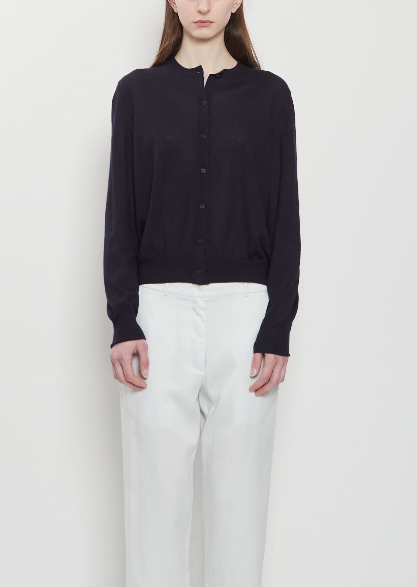The Essentials Collection — The Row dark navy cardigan with tonal horn-hued buttons closure in lightweight cashmere knit. Features set-in shoulders, and a fine rib trim at neckline, cuffs and hem. Finished with signature center back detail. Relaxed fit.