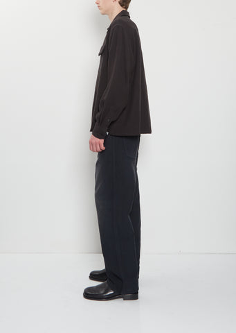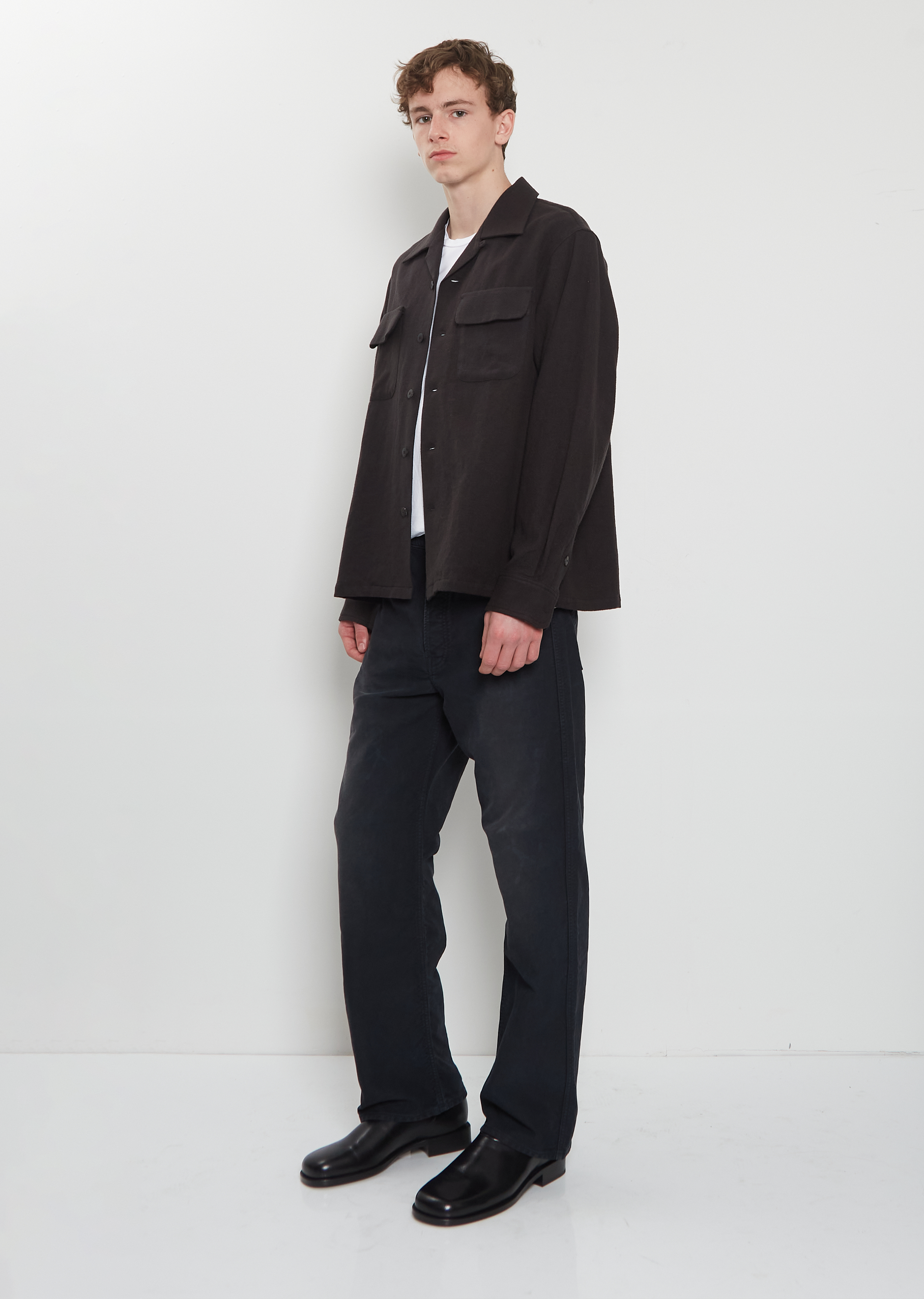 Visvim dark grey long sleeve shirt with a spread collar and patch pockets at chest in a custom garment-dyed wool and linen blend. Features slightly dropped shoulders, buttoned cuffs, back yoke and a custom water buffalo buttons closure.
