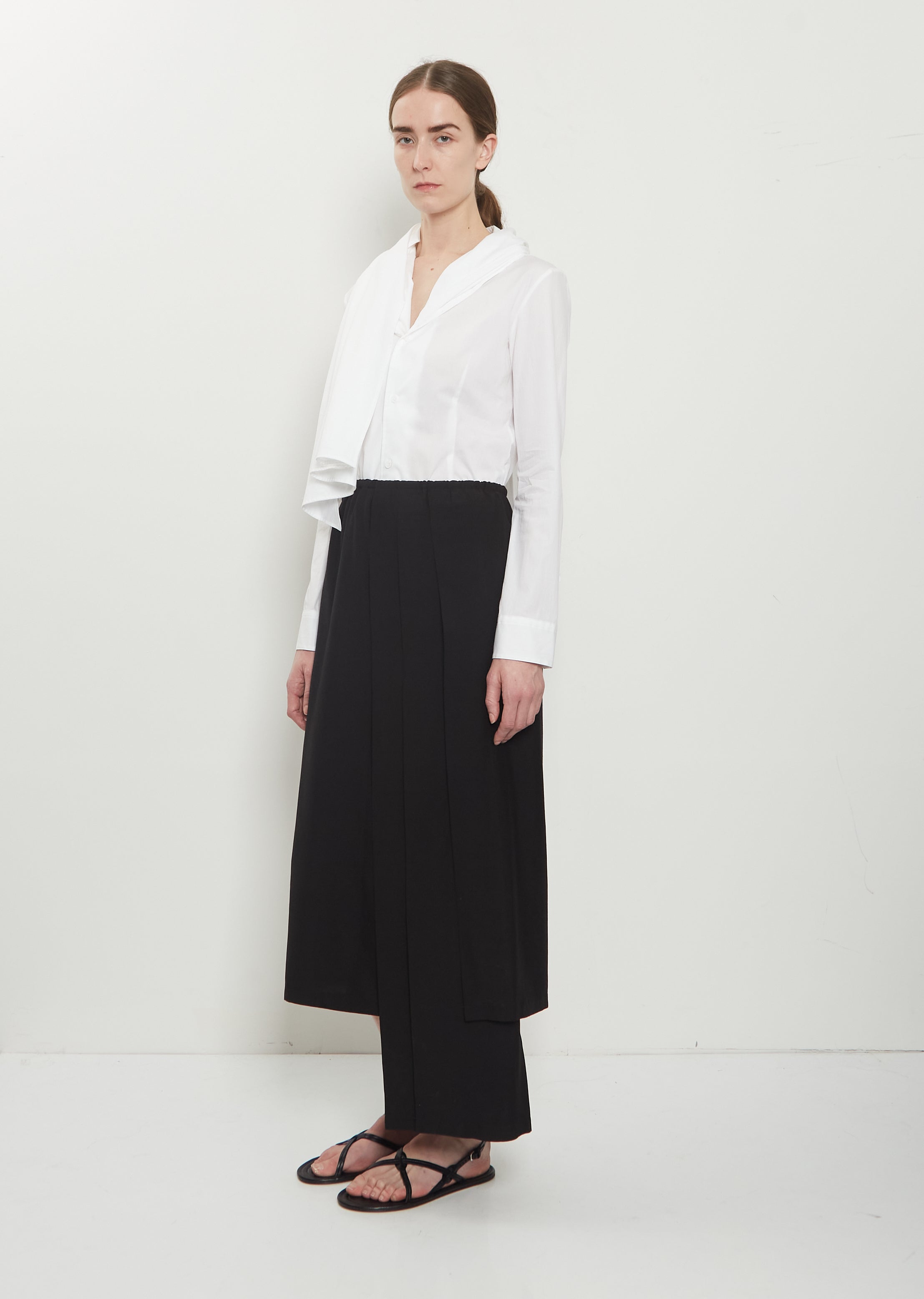 Yohji Yamamoto black pull-on long skirt with a three-layer detail and asymmetrical hem in a smooth and lightweight silk blend. Features an adjustable drawstring at waist, and  asymmetrical hem.