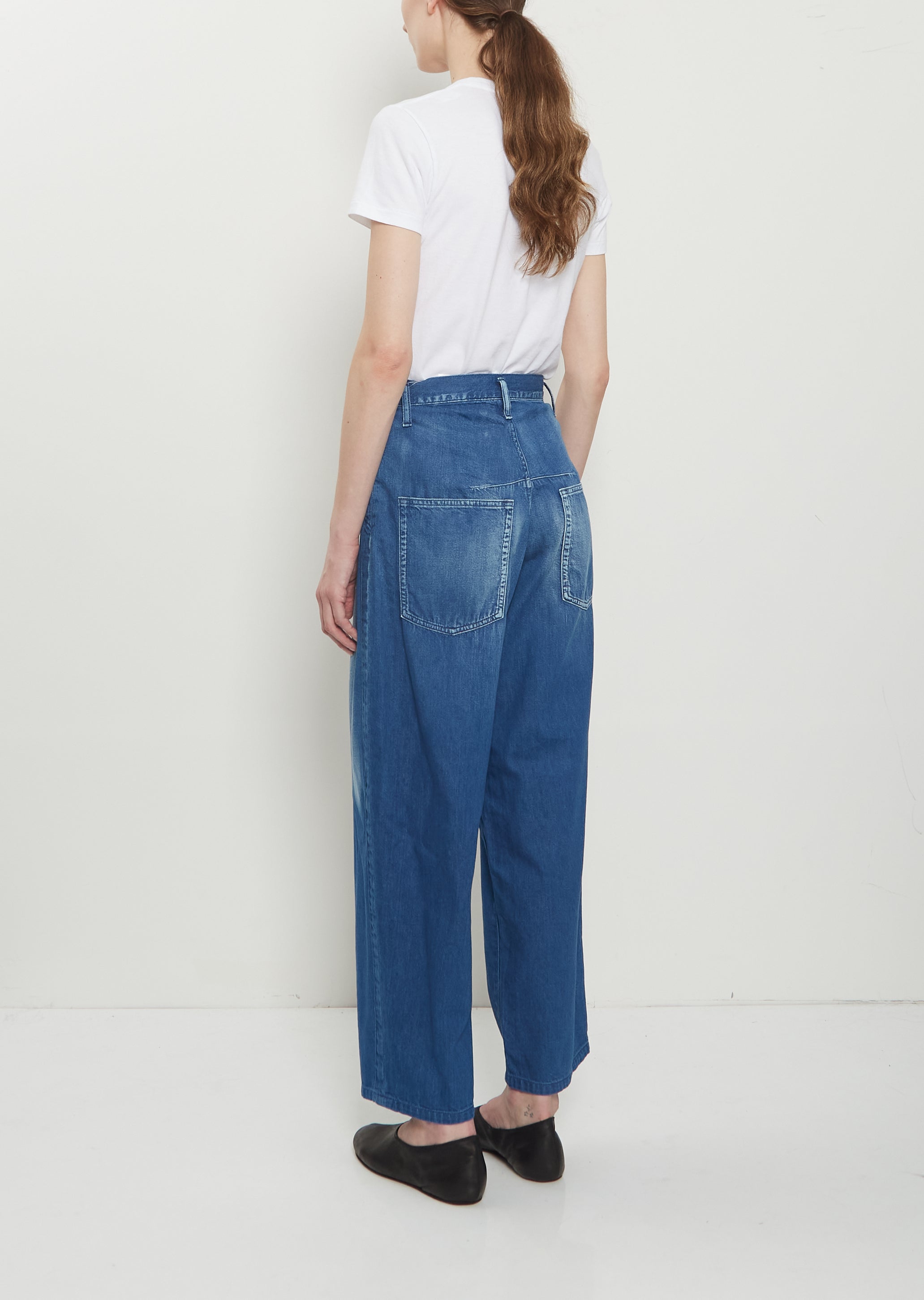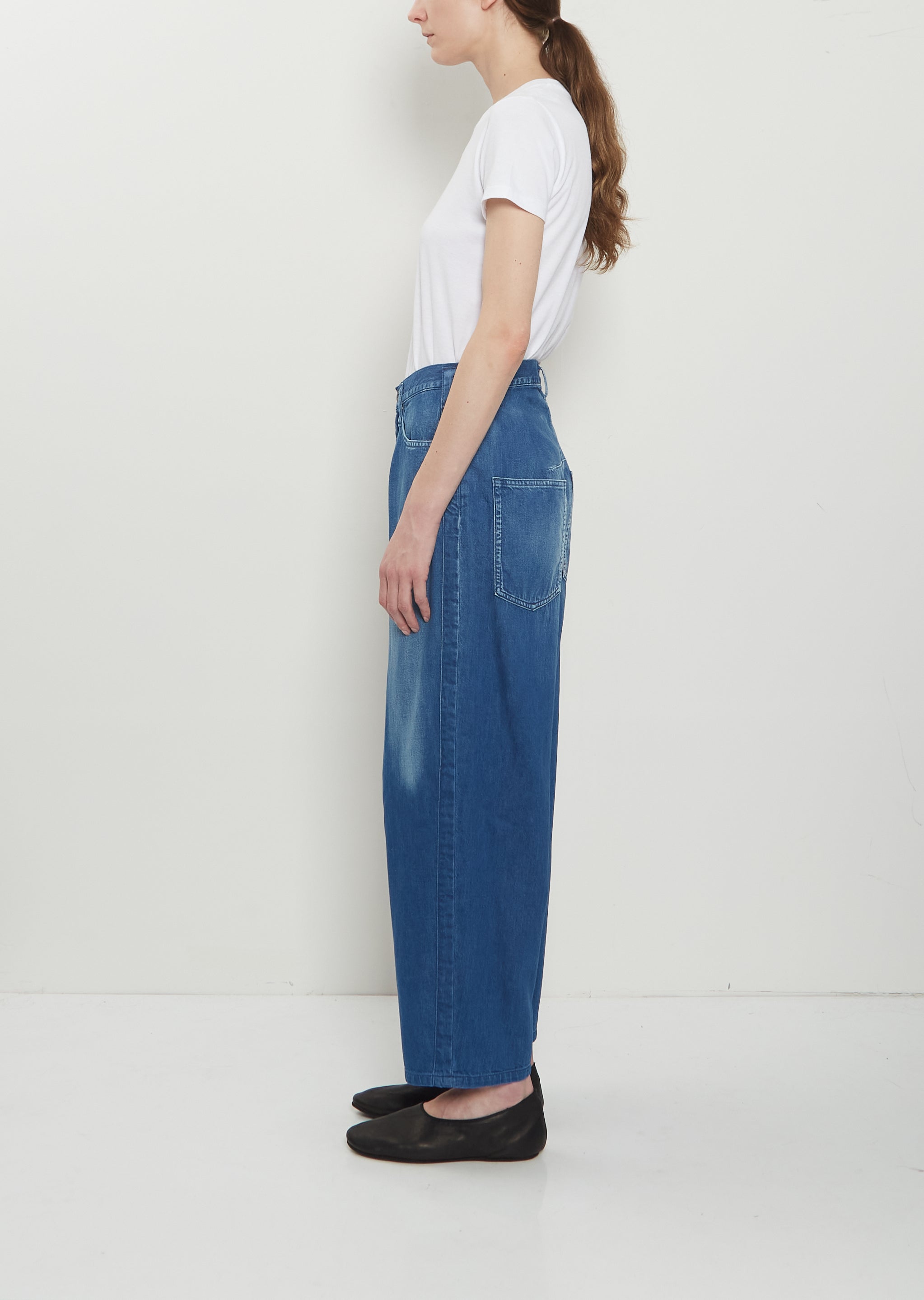 Y's light blue trousers with wide, slightly tapered legs and a 5-pocket construction in cotton denim with a washed and distressed effect. Features belt loops, side trim details, a back yoke and a button and zip-fly fastening. Relaxed fit.