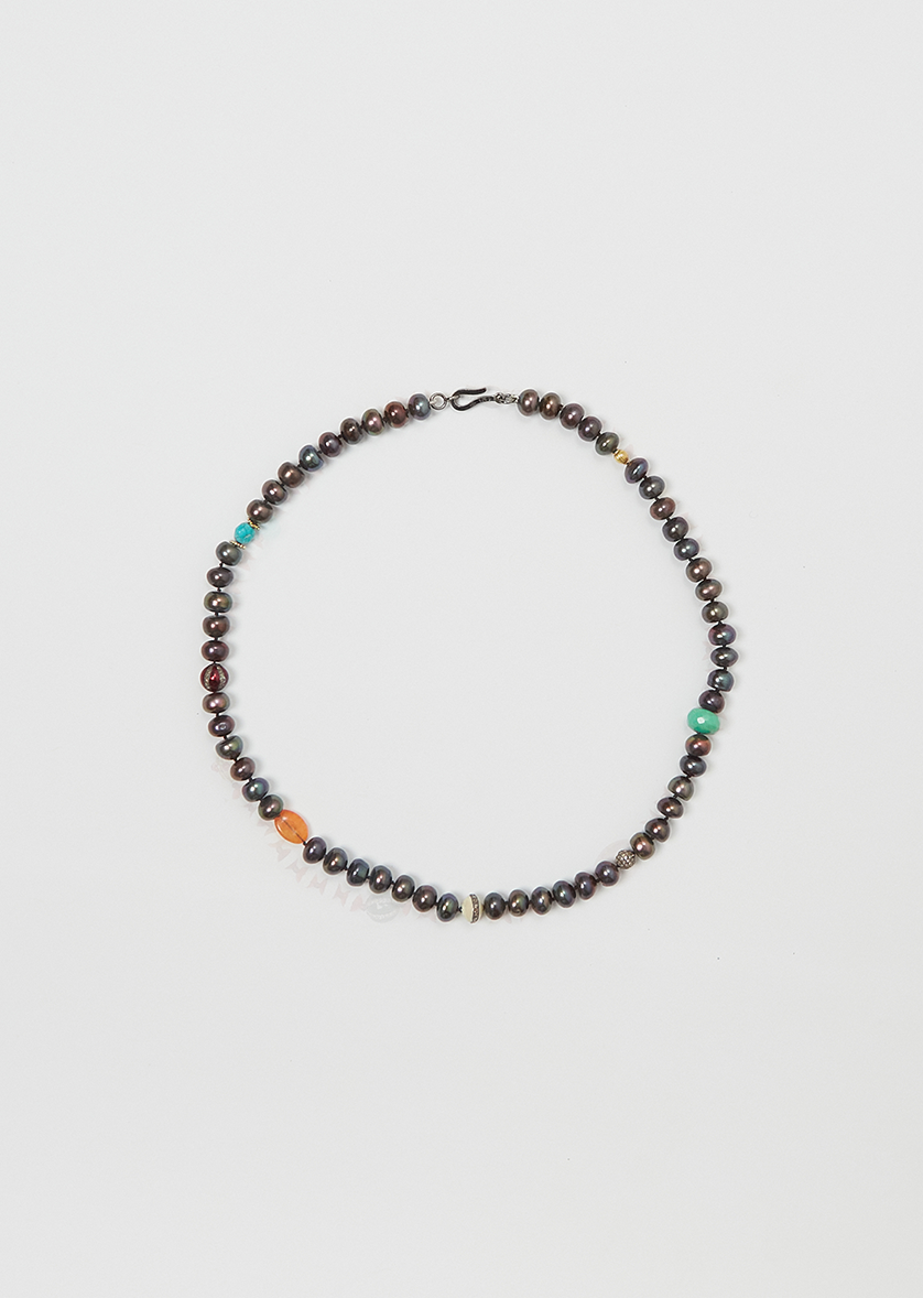Ileana Makri brown black degrade pearls necklace with a 9k white gold oxidized hook clasp. Features a variety of semi precious gems, 18k gold motifs, sterling silver beads, enamel details and grey diamonds.