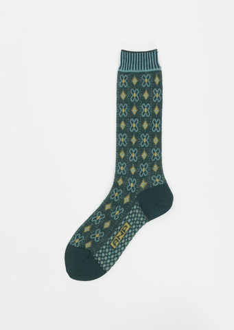 Antipast green crew socks with a floral and diamond grid design and ribbed top knit in a wool blend.