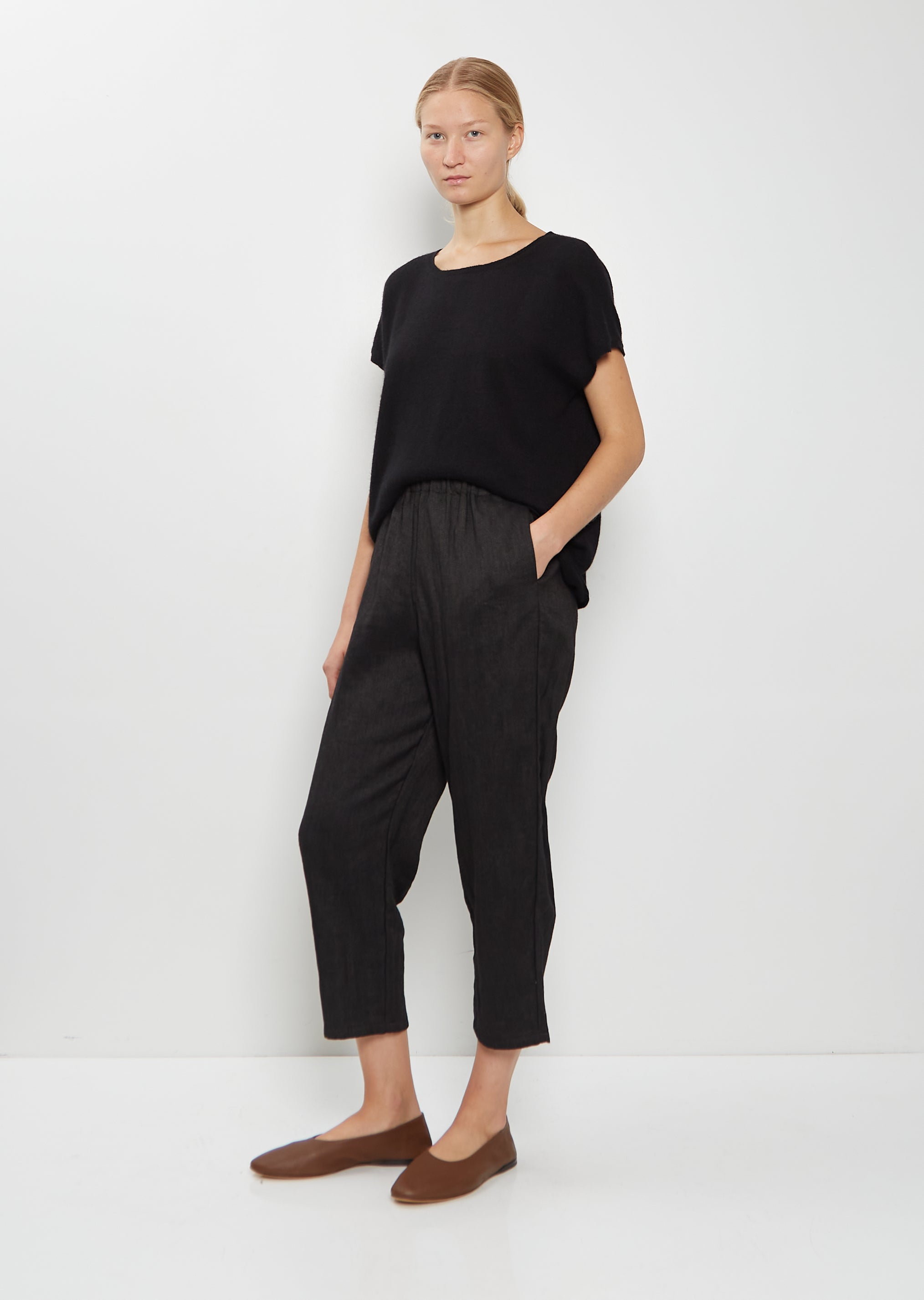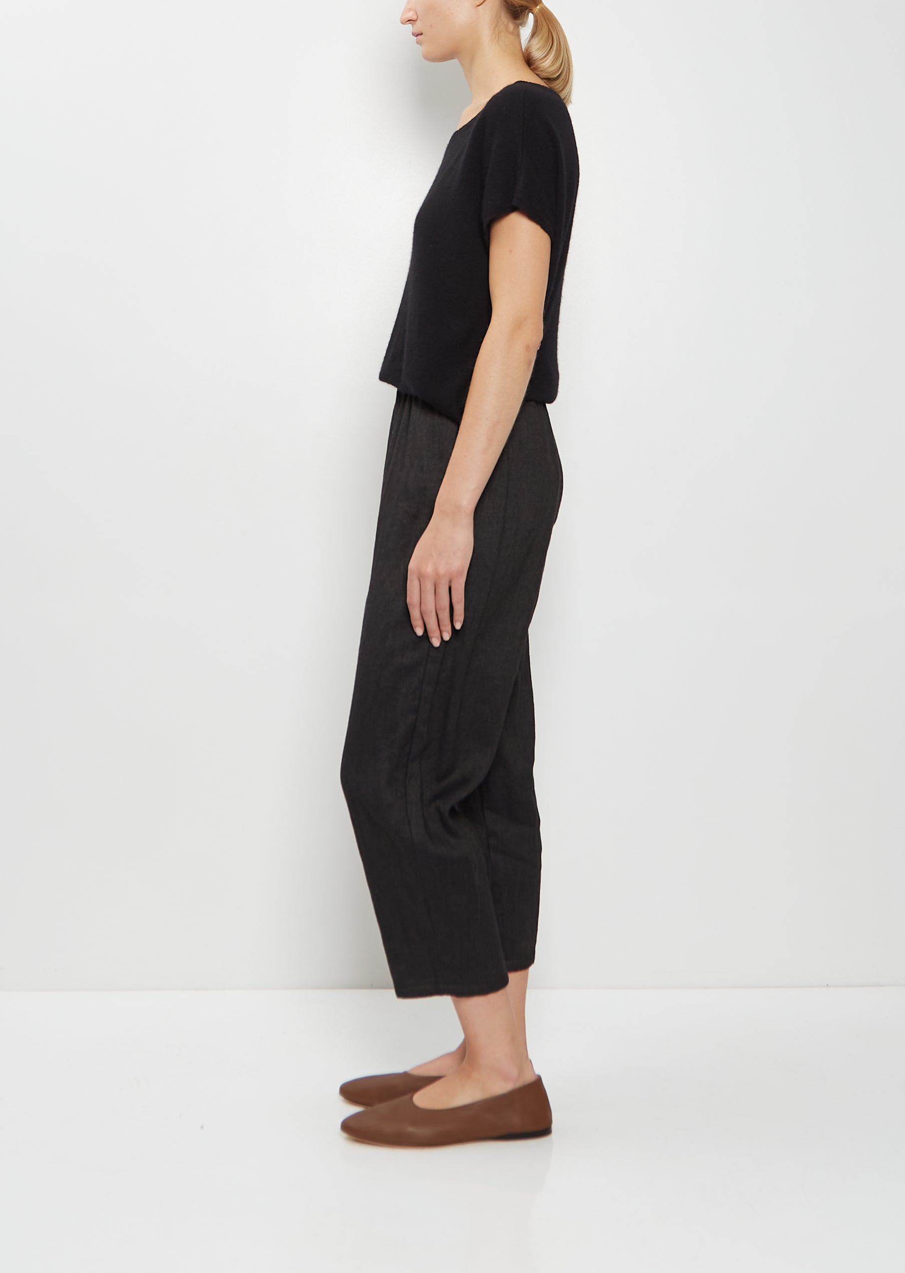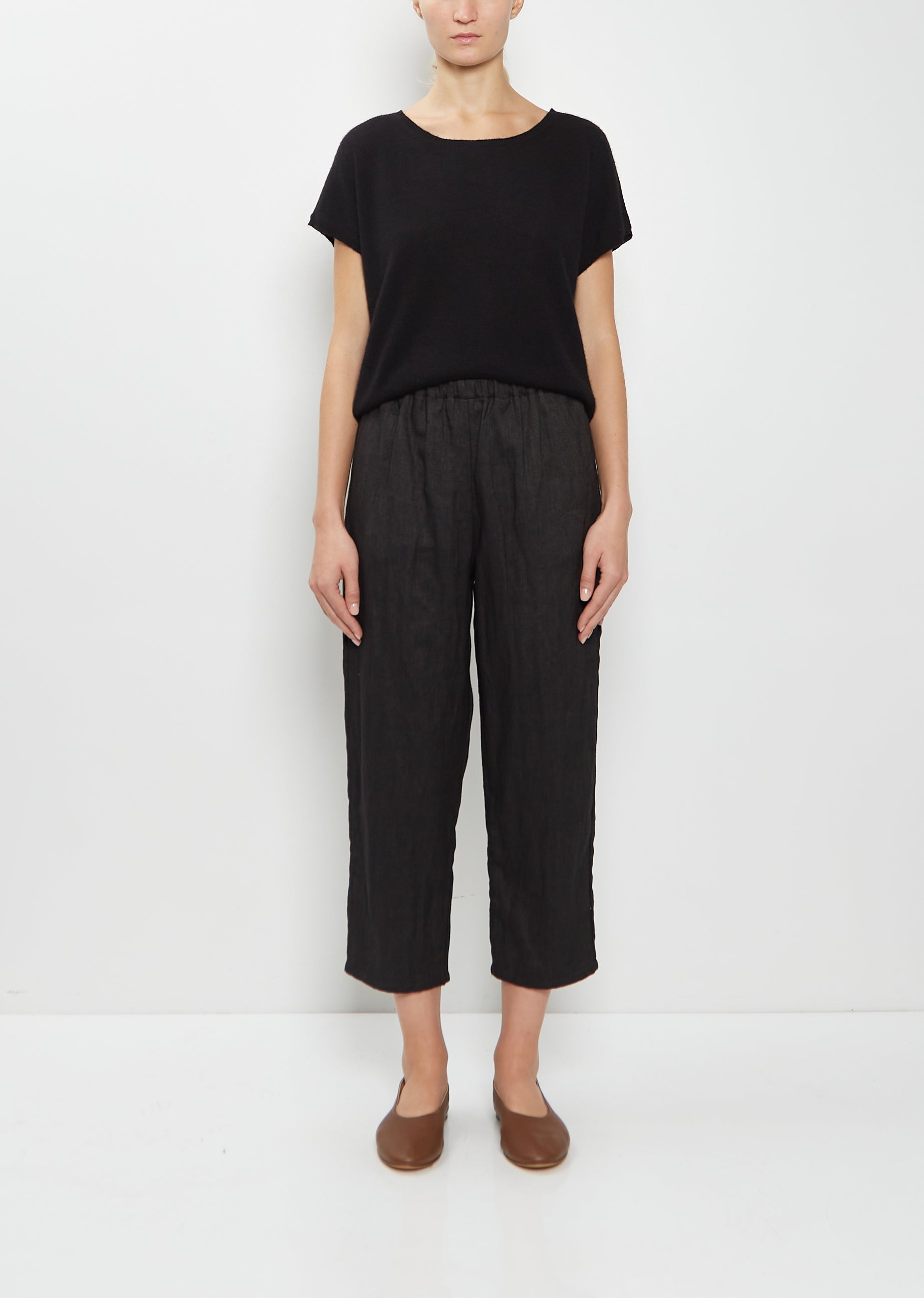 Apuntob coffee brown pull-on cropped trouser with slightly tapered legs in lightweight linen and wool blend twill. Features side seam pockets and an elasticated waistband. Regular fit.