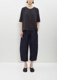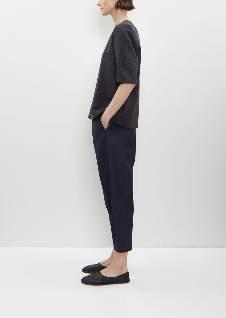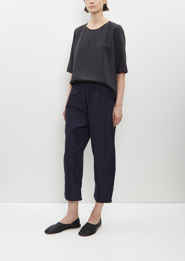 Apuntob dark navy signature curved leg pull on trouser with cropped legs and pull on elasticated waist in wool-nylon blend gabardine. Features side seam pockets.