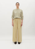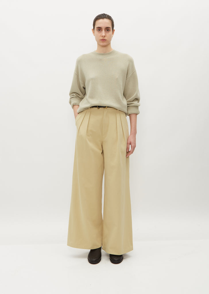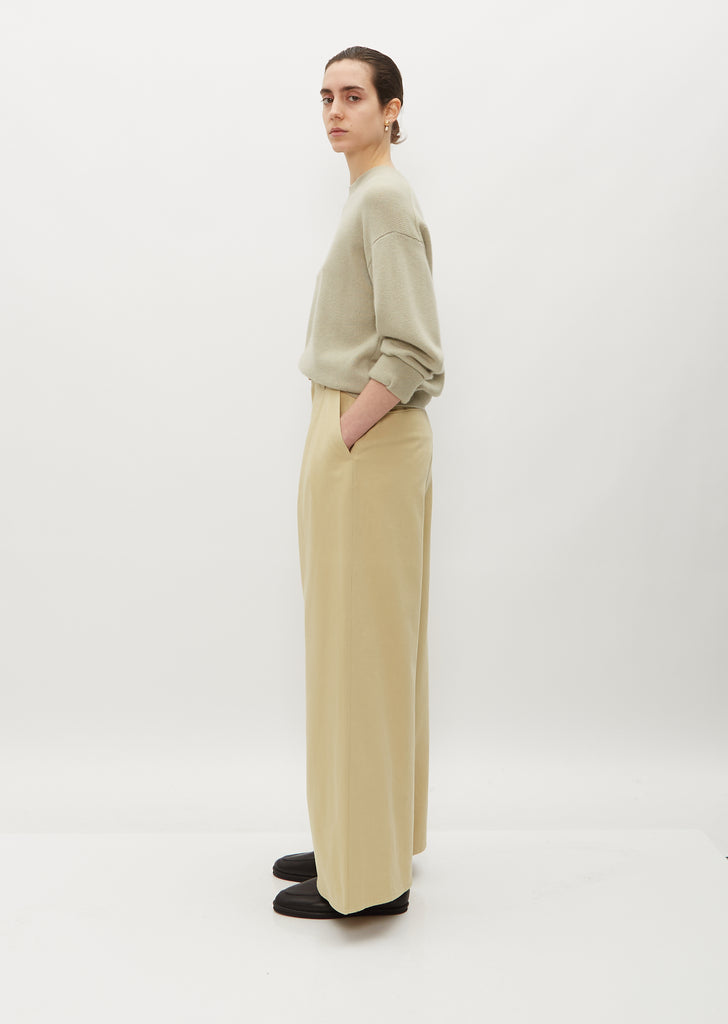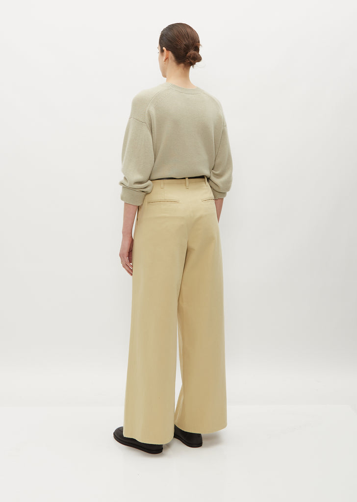 Auralee khaki yellow pants with a wide leg and high-rise fit in densely woven cotton chino with an uneven matte finish. Features two front pleats, angled side pockets, rear welt pockets, and finished with a concealed zip and single button at top.