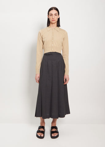 Auralee charcoal pleated skirt in lightweight tropical wool. Features a clean waistband with an attached belt to adjust the fit and an invisible side zip closure.