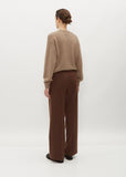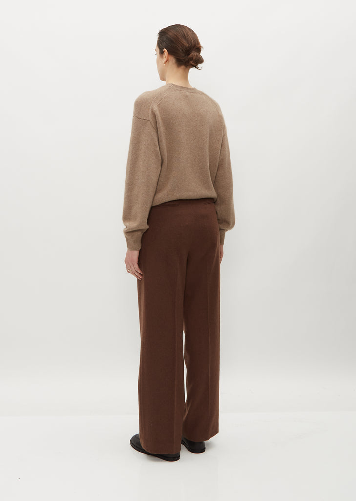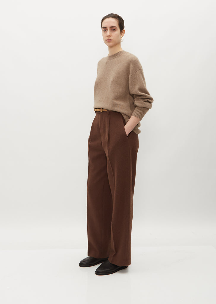 Auralee dark brown single pleat trousers with straight legs crafted in baby camel flannel. Features a clean waistband with belt loops and concealed hook and eye closure with zipper fly fastening. Side slip pockets and welt back pockets. Straight silhouette with a relaxed fit. Partially lined in tonal viscose.