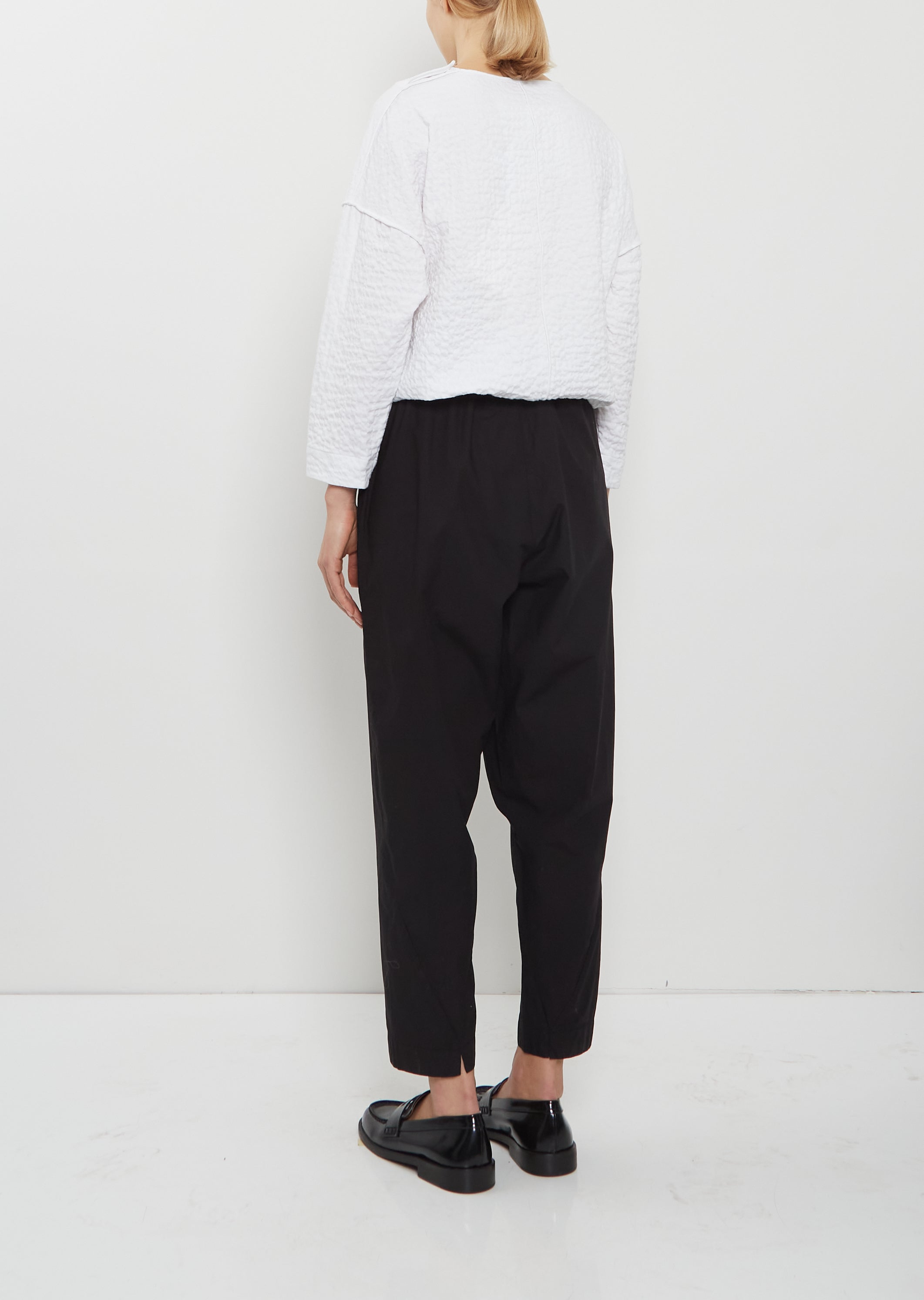 Toogood signature Acrobat trouser crafted in cotton. Features curving to the back to meet at the hem. Features an elasticated waist and tapered legs with side seams curving to the back to meet at the hem and side pockets.