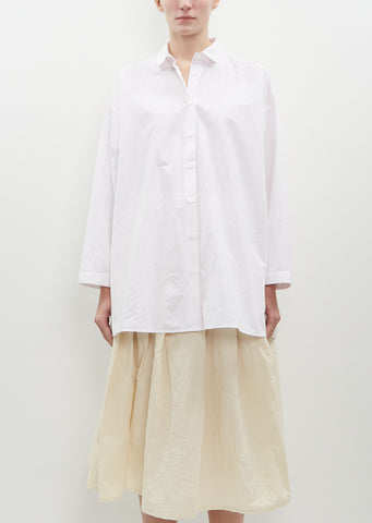 Bergfabel oversized shirt with clean, button free shirt cuffs in light pink stripe washed cotton. Features a classic shirt collar and ruching at back yoke for subtle volume at back. Straight hem and finished with shell buttons.