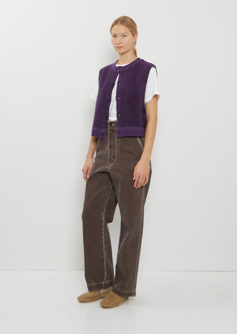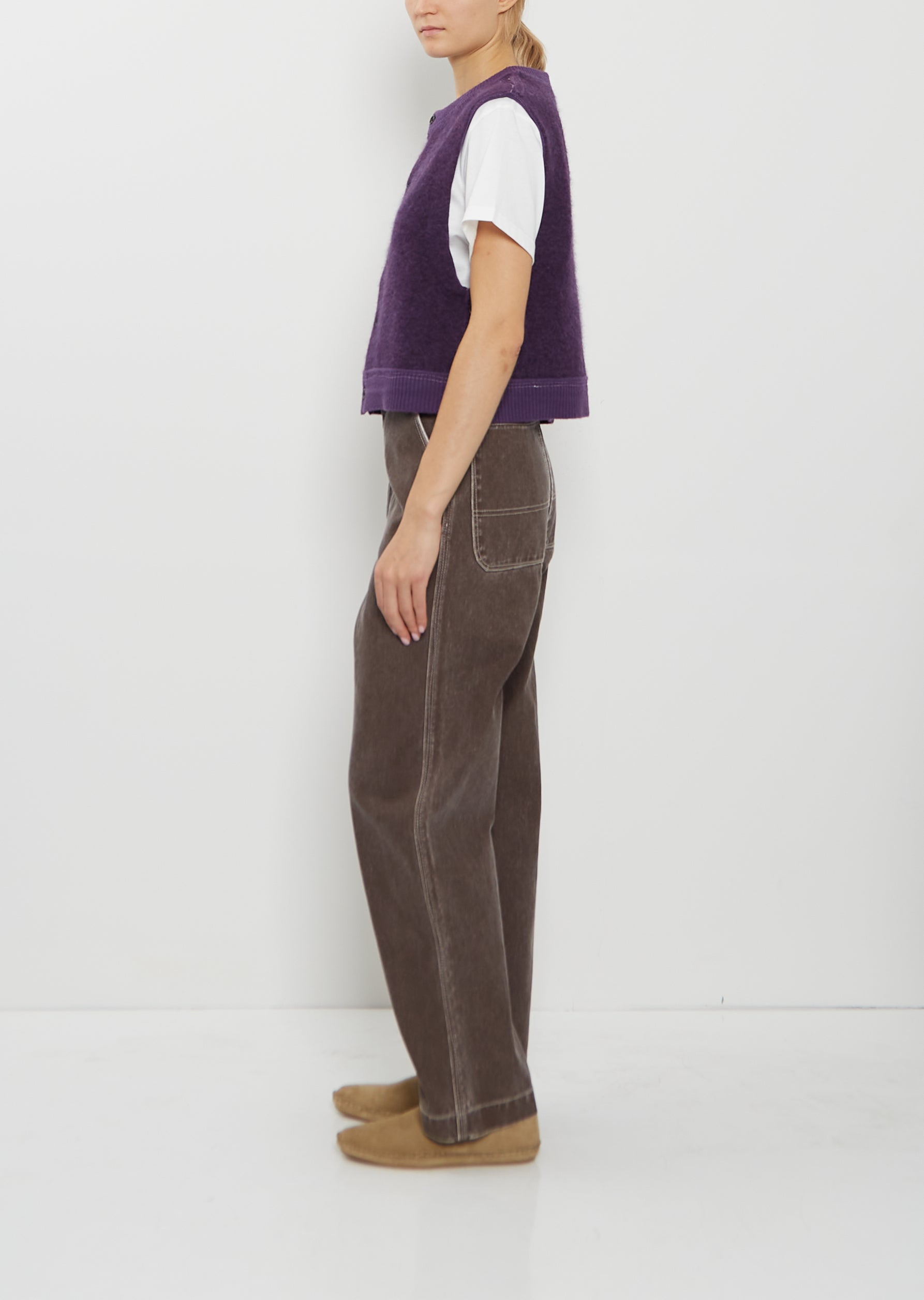 Camiel Fortgens purple cropped vest with a crew neck in soft mid-weight stretch alpaca blend knit. Features contrasting white topstitching and a contrasting ribbed trim knit at neck and hem. Regular fit.